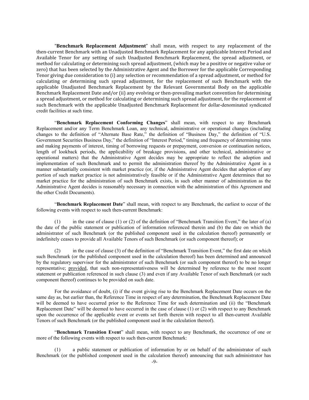 “Benchmark Replacement Adjustment” shall mean, with respect to any replacement of the then-current Benchmark with an Unadjusted Benchmark Replacement for any applicable Interest Period and Available Tenor for any setting of such Unadjusted Benchmark Replacement, the spread adjustment, or method for calculating or determining such spread adjustment, (which may be a positive or negative value or zero) that has been selected by the Administrative Agent and the Borrower for the applicable Corresponding Tenor giving due consideration to (i) any selection or recommendation of a spread adjustment, or method for calculating or determining such spread adjustment, for the replacement of such Benchmark with the applicable Unadjusted Benchmark Replacement by the Relevant Governmental Body on the applicable Benchmark Replacement Date and/or (ii) any evolving or then-prevailing market convention for determining a spread adjustment, or method for calculating or determining such spread adjustment, for the replacement of such Benchmark with the applicable Unadjusted Benchmark Replacement for dollar-denominated syndicated credit facilities at such time. “Benchmark Replacement Conforming Changes” shall mean, with respect to any Benchmark Replacement and/or any Term Benchmark Loan, any technical, administrative or operational changes (including changes to the definition of “Alternate Base Rate,” the definition of “Business Day,” the definition of “U.S. Government Securities Business Day,” the definition of “Interest Period,” timing and frequency of determining rates and making payments of interest, timing of borrowing requests or prepayment, conversion or continuation notices, length of lookback periods, the applicability of breakage provisions, and other technical, administrative or operational matters) that the Administrative Agent decides may be appropriate to reflect the adoption and implementation of such Benchmark and to permit the administration thereof by the Administrative Agent in a manner substantially consistent with market practice (or, if the Administrative Agent decides that adoption of any portion of such market practice is not administratively feasible or if the Administrative Agent determines that no market practice for the administration of such Benchmark exists, in such other manner of administration as the Administrative Agent decides is reasonably necessary in connection with the administration of this Agreement and the other Credit Documents). “Benchmark Replacement Date” shall mean, with respect to any Benchmark, the earliest to occur of the following events with respect to such then-current Benchmark: (1) in the case of clause (1) or (2) of the definition of “Benchmark Transition Event,” the later of (a) the date of the public statement or publication of information referenced therein and (b) the date on which the administrator of such Benchmark (or the published component used in the calculation thereof) permanently or indefinitely ceases to provide all Available Tenors of such Benchmark (or such component thereof); or (2) in the case of clause (3) of the definition of “Benchmark Transition Event,” the first date on which such Benchmark (or the published component used in the calculation thereof) has been determined and announced by the regulatory supervisor for the administrator of such Benchmark (or such component thereof) to be no longer representative; provided, that such non-representativeness will be determined by reference to the most recent statement or publication referenced in such clause (3) and even if any Available Tenor of such Benchmark (or such component thereof) continues to be provided on such date. For the avoidance of doubt, (i) if the event giving rise to the Benchmark Replacement Date occurs on the same day as, but earlier than, the Reference Time in respect of any determination, the Benchmark Replacement Date will be deemed to have occurred prior to the Reference Time for such determination and (ii) the “Benchmark Replacement Date” will be deemed to have occurred in the case of clause (1) or (2) with respect to any Benchmark upon the occurrence of the applicable event or events set forth therein with respect to all then-current Available Tenors of such Benchmark (or the published component used in the calculation thereof). “Benchmark Transition Event” shall mean, with respect to any Benchmark, the occurrence of one or more of the following events with respect to such then-current Benchmark: (1) a public statement or publication of information by or on behalf of the administrator of such Benchmark (or the published component used in the calculation thereof) announcing that such administrator has -9-