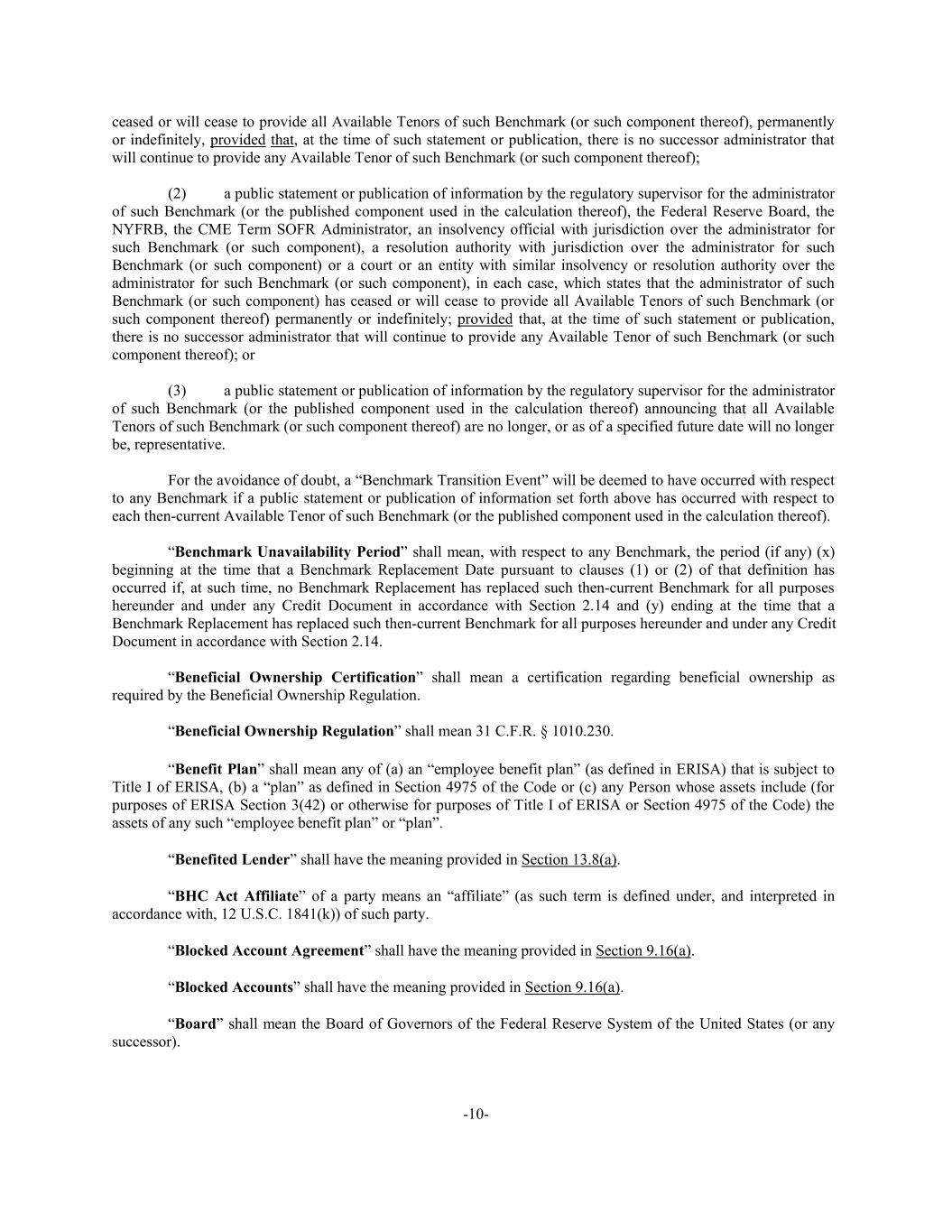 ceased or will cease to provide all Available Tenors of such Benchmark (or such component thereof), permanently or indefinitely, provided that, at the time of such statement or publication, there is no successor administrator that will continue to provide any Available Tenor of such Benchmark (or such component thereof); (2) a public statement or publication of information by the regulatory supervisor for the administrator of such Benchmark (or the published component used in the calculation thereof), the Federal Reserve Board, the NYFRB, the CME Term SOFR Administrator, an insolvency official with jurisdiction over the administrator for such Benchmark (or such component), a resolution authority with jurisdiction over the administrator for such Benchmark (or such component) or a court or an entity with similar insolvency or resolution authority over the administrator for such Benchmark (or such component), in each case, which states that the administrator of such Benchmark (or such component) has ceased or will cease to provide all Available Tenors of such Benchmark (or such component thereof) permanently or indefinitely; provided that, at the time of such statement or publication, there is no successor administrator that will continue to provide any Available Tenor of such Benchmark (or such component thereof); or (3) a public statement or publication of information by the regulatory supervisor for the administrator of such Benchmark (or the published component used in the calculation thereof) announcing that all Available Tenors of such Benchmark (or such component thereof) are no longer, or as of a specified future date will no longer be, representative. For the avoidance of doubt, a “Benchmark Transition Event” will be deemed to have occurred with respect to any Benchmark if a public statement or publication of information set forth above has occurred with respect to each then-current Available Tenor of such Benchmark (or the published component used in the calculation thereof). “Benchmark Unavailability Period” shall mean, with respect to any Benchmark, the period (if any) (x) beginning at the time that a Benchmark Replacement Date pursuant to clauses (1) or (2) of that definition has occurred if, at such time, no Benchmark Replacement has replaced such then-current Benchmark for all purposes hereunder and under any Credit Document in accordance with Section 2.14 and (y) ending at the time that a Benchmark Replacement has replaced such then-current Benchmark for all purposes hereunder and under any Credit Document in accordance with Section 2.14. “Beneficial Ownership Certification” shall mean a certification regarding beneficial ownership as required by the Beneficial Ownership Regulation. “Beneficial Ownership Regulation” shall mean 31 C.F.R. § 1010.230. “Benefit Plan” shall mean any of (a) an “employee benefit plan” (as defined in ERISA) that is subject to Title I of ERISA, (b) a “plan” as defined in Section 4975 of the Code or (c) any Person whose assets include (for purposes of ERISA Section 3(42) or otherwise for purposes of Title I of ERISA or Section 4975 of the Code) the assets of any such “employee benefit plan” or “plan”. “Benefited Lender” shall have the meaning provided in Section 13.8(a). “BHC Act Affiliate” of a party means an “affiliate” (as such term is defined under, and interpreted in accordance with, 12 U.S.C. 1841(k)) of such party. “Blocked Account Agreement” shall have the meaning provided in Section 9.16(a). “Blocked Accounts” shall have the meaning provided in Section 9.16(a). “Board” shall mean the Board of Governors of the Federal Reserve System of the United States (or any successor). -10-