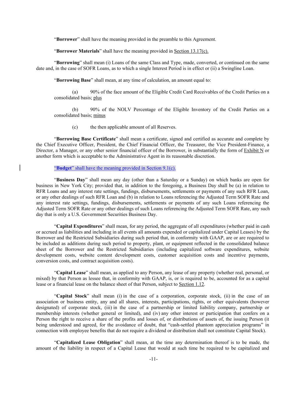 “Borrower” shall have the meaning provided in the preamble to this Agreement. “Borrower Materials” shall have the meaning provided in Section 13.17(c). “Borrowing” shall mean (i) Loans of the same Class and Type, made, converted, or continued on the same date and, in the case of SOFR Loans, as to which a single Interest Period is in effect or (ii) a Swingline Loan. “Borrowing Base” shall mean, at any time of calculation, an amount equal to: (a) 90% of the face amount of the Eligible Credit Card Receivables of the Credit Parties on a consolidated basis; plus (b) 90% of the NOLV Percentage of the Eligible Inventory of the Credit Parties on a consolidated basis; minus (c) the then applicable amount of all Reserves. “Borrowing Base Certificate” shall mean a certificate, signed and certified as accurate and complete by the Chief Executive Officer, President, the Chief Financial Officer, the Treasurer, the Vice President-Finance, a Director, a Manager, or any other senior financial officer of the Borrower, in substantially the form of Exhibit N or another form which is acceptable to the Administrative Agent in its reasonable discretion. “Budget” shall have the meaning provided in Section 9.1(c). “Business Day” shall mean any day (other than a Saturday or a Sunday) on which banks are open for business in New York City; provided that, in addition to the foregoing, a Business Day shall be (a) in relation to RFR Loans and any interest rate settings, fundings, disbursements, settlements or payments of any such RFR Loan, or any other dealings of such RFR Loan and (b) in relation to Loans referencing the Adjusted Term SOFR Rate and any interest rate settings, fundings, disbursements, settlements or payments of any such Loans referencing the Adjusted Term SOFR Rate or any other dealings of such Loans referencing the Adjusted Term SOFR Rate, any such day that is only a U.S. Government Securities Business Day. “Capital Expenditures” shall mean, for any period, the aggregate of all expenditures (whether paid in cash or accrued as liabilities and including in all events all amounts expended or capitalized under Capital Leases) by the Borrower and the Restricted Subsidiaries during such period that, in conformity with GAAP, are or are required to be included as additions during such period to property, plant, or equipment reflected in the consolidated balance sheet of the Borrower and the Restricted Subsidiaries (including capitalized software expenditures, website development costs, website content development costs, customer acquisition costs and incentive payments, conversion costs, and contract acquisition costs). “Capital Lease” shall mean, as applied to any Person, any lease of any property (whether real, personal, or mixed) by that Person as lessee that, in conformity with GAAP, is, or is required to be, accounted for as a capital lease or a financial lease on the balance sheet of that Person, subject to Section 1.12. “Capital Stock” shall mean (i) in the case of a corporation, corporate stock, (ii) in the case of an association or business entity, any and all shares, interests, participations, rights, or other equivalents (however designated) of corporate stock, (iii) in the case of a partnership or limited liability company, partnership or membership interests (whether general or limited), and (iv) any other interest or participation that confers on a Person the right to receive a share of the profits and losses of, or distributions of assets of, the issuing Person (it being understood and agreed, for the avoidance of doubt, that “cash-settled phantom appreciation programs” in connection with employee benefits that do not require a dividend or distribution shall not constitute Capital Stock). “Capitalized Lease Obligation” shall mean, at the time any determination thereof is to be made, the amount of the liability in respect of a Capital Lease that would at such time be required to be capitalized and -11-