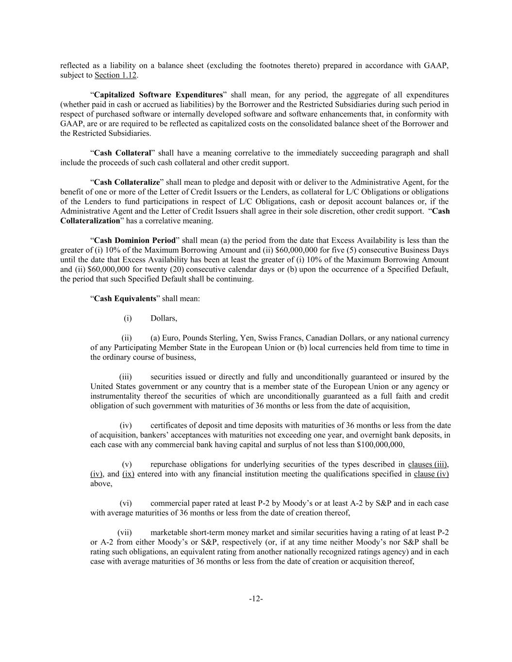 reflected as a liability on a balance sheet (excluding the footnotes thereto) prepared in accordance with GAAP, subject to Section 1.12. “Capitalized Software Expenditures” shall mean, for any period, the aggregate of all expenditures (whether paid in cash or accrued as liabilities) by the Borrower and the Restricted Subsidiaries during such period in respect of purchased software or internally developed software and software enhancements that, in conformity with GAAP, are or are required to be reflected as capitalized costs on the consolidated balance sheet of the Borrower and the Restricted Subsidiaries. “Cash Collateral” shall have a meaning correlative to the immediately succeeding paragraph and shall include the proceeds of such cash collateral and other credit support. “Cash Collateralize” shall mean to pledge and deposit with or deliver to the Administrative Agent, for the benefit of one or more of the Letter of Credit Issuers or the Lenders, as collateral for L/C Obligations or obligations of the Lenders to fund participations in respect of L/C Obligations, cash or deposit account balances or, if the Administrative Agent and the Letter of Credit Issuers shall agree in their sole discretion, other credit support. “Cash Collateralization” has a correlative meaning. “Cash Dominion Period” shall mean (a) the period from the date that Excess Availability is less than the greater of (i) 10% of the Maximum Borrowing Amount and (ii) $60,000,000 for five (5) consecutive Business Days until the date that Excess Availability has been at least the greater of (i) 10% of the Maximum Borrowing Amount and (ii) $60,000,000 for twenty (20) consecutive calendar days or (b) upon the occurrence of a Specified Default, the period that such Specified Default shall be continuing. “Cash Equivalents” shall mean: (i) Dollars, (ii) (a) Euro, Pounds Sterling, Yen, Swiss Francs, Canadian Dollars, or any national currency of any Participating Member State in the European Union or (b) local currencies held from time to time in the ordinary course of business, (iii) securities issued or directly and fully and unconditionally guaranteed or insured by the United States government or any country that is a member state of the European Union or any agency or instrumentality thereof the securities of which are unconditionally guaranteed as a full faith and credit obligation of such government with maturities of 36 months or less from the date of acquisition, (iv) certificates of deposit and time deposits with maturities of 36 months or less from the date of acquisition, bankers’ acceptances with maturities not exceeding one year, and overnight bank deposits, in each case with any commercial bank having capital and surplus of not less than $100,000,000, (v) repurchase obligations for underlying securities of the types described in clauses (iii), (iv), and (ix) entered into with any financial institution meeting the qualifications specified in clause (iv) above, (vi) commercial paper rated at least P-2 by Moody’s or at least A-2 by S&P and in each case with average maturities of 36 months or less from the date of creation thereof, (vii) marketable short-term money market and similar securities having a rating of at least P-2 or A-2 from either Moody’s or S&P, respectively (or, if at any time neither Moody’s nor S&P shall be rating such obligations, an equivalent rating from another nationally recognized ratings agency) and in each case with average maturities of 36 months or less from the date of creation or acquisition thereof, -12-