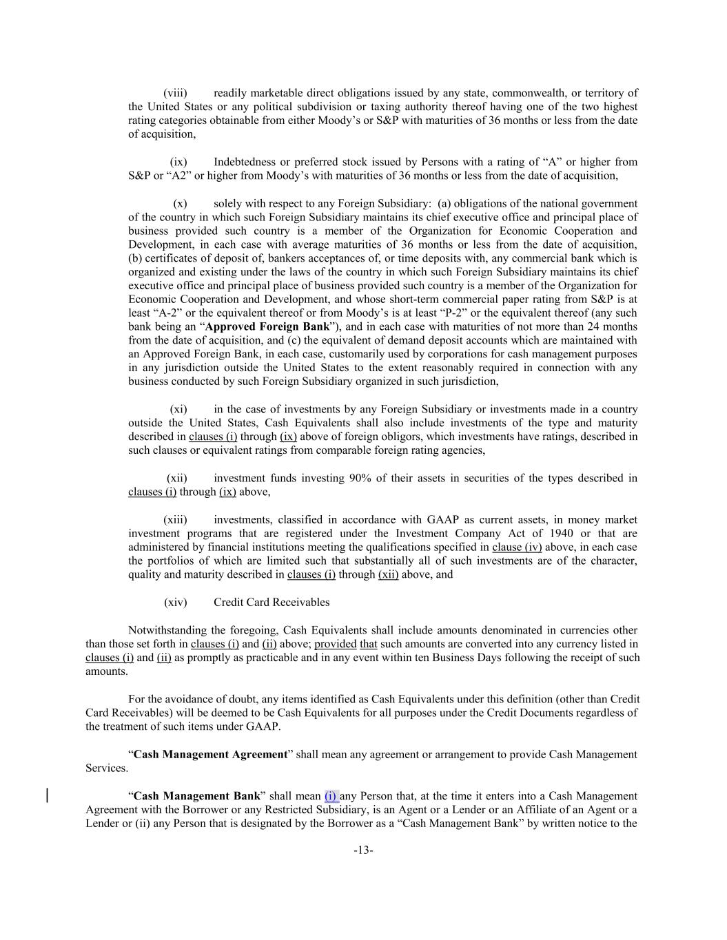 (viii) readily marketable direct obligations issued by any state, commonwealth, or territory of the United States or any political subdivision or taxing authority thereof having one of the two highest rating categories obtainable from either Moody’s or S&P with maturities of 36 months or less from the date of acquisition, (ix) Indebtedness or preferred stock issued by Persons with a rating of “A” or higher from S&P or “A2” or higher from Moody’s with maturities of 36 months or less from the date of acquisition, (x) solely with respect to any Foreign Subsidiary: (a) obligations of the national government of the country in which such Foreign Subsidiary maintains its chief executive office and principal place of business provided such country is a member of the Organization for Economic Cooperation and Development, in each case with average maturities of 36 months or less from the date of acquisition, (b) certificates of deposit of, bankers acceptances of, or time deposits with, any commercial bank which is organized and existing under the laws of the country in which such Foreign Subsidiary maintains its chief executive office and principal place of business provided such country is a member of the Organization for Economic Cooperation and Development, and whose short-term commercial paper rating from S&P is at least “A-2” or the equivalent thereof or from Moody’s is at least “P-2” or the equivalent thereof (any such bank being an “Approved Foreign Bank”), and in each case with maturities of not more than 24 months from the date of acquisition, and (c) the equivalent of demand deposit accounts which are maintained with an Approved Foreign Bank, in each case, customarily used by corporations for cash management purposes in any jurisdiction outside the United States to the extent reasonably required in connection with any business conducted by such Foreign Subsidiary organized in such jurisdiction, (xi) in the case of investments by any Foreign Subsidiary or investments made in a country outside the United States, Cash Equivalents shall also include investments of the type and maturity described in clauses (i) through (ix) above of foreign obligors, which investments have ratings, described in such clauses or equivalent ratings from comparable foreign rating agencies, (xii) investment funds investing 90% of their assets in securities of the types described in clauses (i) through (ix) above, (xiii) investments, classified in accordance with GAAP as current assets, in money market investment programs that are registered under the Investment Company Act of 1940 or that are administered by financial institutions meeting the qualifications specified in clause (iv) above, in each case the portfolios of which are limited such that substantially all of such investments are of the character, quality and maturity described in clauses (i) through (xii) above, and (xiv) Credit Card Receivables Notwithstanding the foregoing, Cash Equivalents shall include amounts denominated in currencies other than those set forth in clauses (i) and (ii) above; provided that such amounts are converted into any currency listed in clauses (i) and (ii) as promptly as practicable and in any event within ten Business Days following the receipt of such amounts. For the avoidance of doubt, any items identified as Cash Equivalents under this definition (other than Credit Card Receivables) will be deemed to be Cash Equivalents for all purposes under the Credit Documents regardless of the treatment of such items under GAAP. “Cash Management Agreement” shall mean any agreement or arrangement to provide Cash Management Services. “Cash Management Bank” shall mean (i) any Person that, at the time it enters into a Cash Management Agreement with the Borrower or any Restricted Subsidiary, is an Agent or a Lender or an Affiliate of an Agent or a Lender or (ii) any Person that is designated by the Borrower as a “Cash Management Bank” by written notice to the -13-