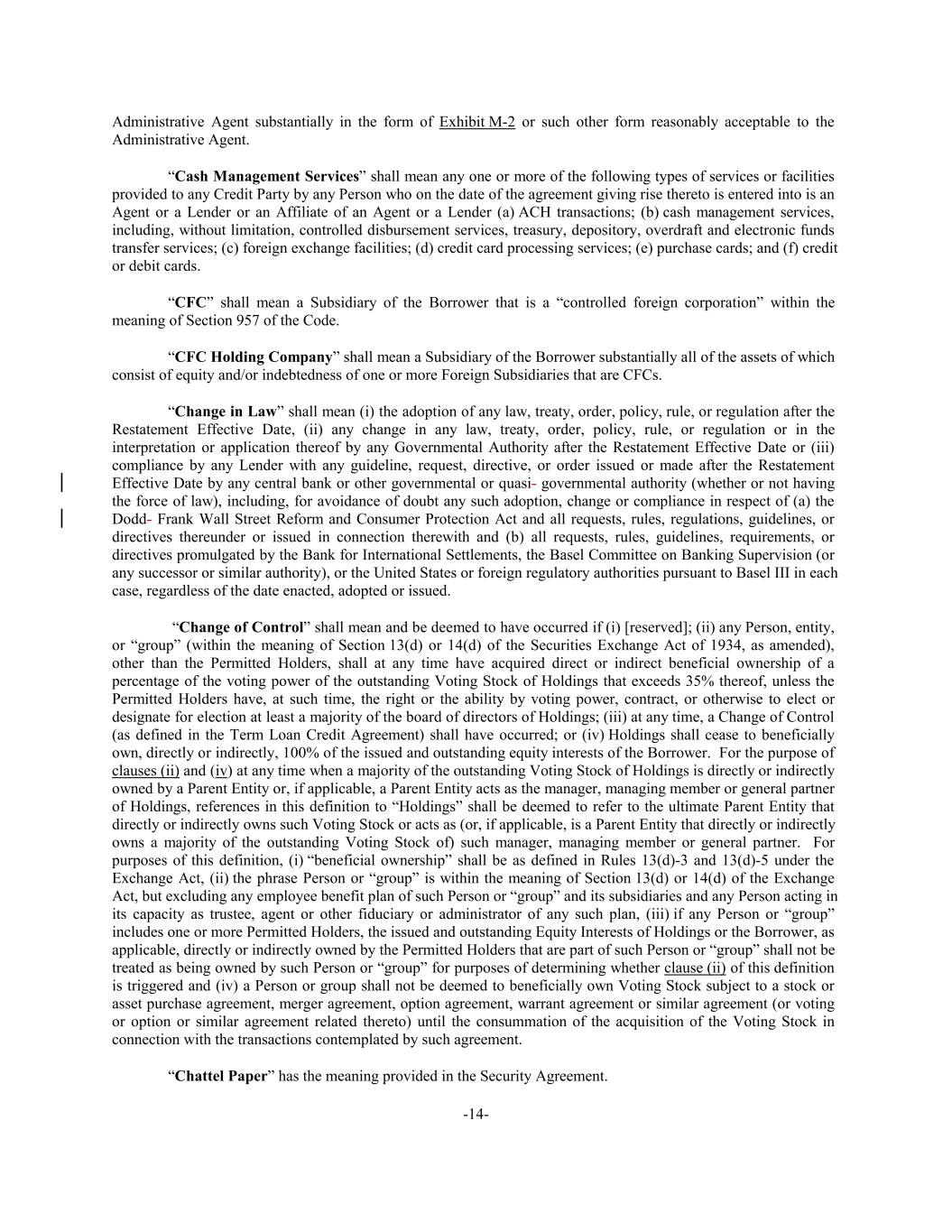 Administrative Agent substantially in the form of Exhibit M-2 or such other form reasonably acceptable to the Administrative Agent. “Cash Management Services” shall mean any one or more of the following types of services or facilities provided to any Credit Party by any Person who on the date of the agreement giving rise thereto is entered into is an Agent or a Lender or an Affiliate of an Agent or a Lender (a) ACH transactions; (b) cash management services, including, without limitation, controlled disbursement services, treasury, depository, overdraft and electronic funds transfer services; (c) foreign exchange facilities; (d) credit card processing services; (e) purchase cards; and (f) credit or debit cards. “CFC” shall mean a Subsidiary of the Borrower that is a “controlled foreign corporation” within the meaning of Section 957 of the Code. “CFC Holding Company” shall mean a Subsidiary of the Borrower substantially all of the assets of which consist of equity and/or indebtedness of one or more Foreign Subsidiaries that are CFCs. “Change in Law” shall mean (i) the adoption of any law, treaty, order, policy, rule, or regulation after the Restatement Effective Date, (ii) any change in any law, treaty, order, policy, rule, or regulation or in the interpretation or application thereof by any Governmental Authority after the Restatement Effective Date or (iii) compliance by any Lender with any guideline, request, directive, or order issued or made after the Restatement Effective Date by any central bank or other governmental or quasi- governmental authority (whether or not having the force of law), including, for avoidance of doubt any such adoption, change or compliance in respect of (a) the Dodd- Frank Wall Street Reform and Consumer Protection Act and all requests, rules, regulations, guidelines, or directives thereunder or issued in connection therewith and (b) all requests, rules, guidelines, requirements, or directives promulgated by the Bank for International Settlements, the Basel Committee on Banking Supervision (or any successor or similar authority), or the United States or foreign regulatory authorities pursuant to Basel III in each case, regardless of the date enacted, adopted or issued. “Change of Control” shall mean and be deemed to have occurred if (i) [reserved]; (ii) any Person, entity, or “group” (within the meaning of Section 13(d) or 14(d) of the Securities Exchange Act of 1934, as amended), other than the Permitted Holders, shall at any time have acquired direct or indirect beneficial ownership of a percentage of the voting power of the outstanding Voting Stock of Holdings that exceeds 35% thereof, unless the Permitted Holders have, at such time, the right or the ability by voting power, contract, or otherwise to elect or designate for election at least a majority of the board of directors of Holdings; (iii) at any time, a Change of Control (as defined in the Term Loan Credit Agreement) shall have occurred; or (iv) Holdings shall cease to beneficially own, directly or indirectly, 100% of the issued and outstanding equity interests of the Borrower. For the purpose of clauses (ii) and (iv) at any time when a majority of the outstanding Voting Stock of Holdings is directly or indirectly owned by a Parent Entity or, if applicable, a Parent Entity acts as the manager, managing member or general partner of Holdings, references in this definition to “Holdings” shall be deemed to refer to the ultimate Parent Entity that directly or indirectly owns such Voting Stock or acts as (or, if applicable, is a Parent Entity that directly or indirectly owns a majority of the outstanding Voting Stock of) such manager, managing member or general partner. For purposes of this definition, (i) “beneficial ownership” shall be as defined in Rules 13(d)-3 and 13(d)-5 under the Exchange Act, (ii) the phrase Person or “group” is within the meaning of Section 13(d) or 14(d) of the Exchange Act, but excluding any employee benefit plan of such Person or “group” and its subsidiaries and any Person acting in its capacity as trustee, agent or other fiduciary or administrator of any such plan, (iii) if any Person or “group” includes one or more Permitted Holders, the issued and outstanding Equity Interests of Holdings or the Borrower, as applicable, directly or indirectly owned by the Permitted Holders that are part of such Person or “group” shall not be treated as being owned by such Person or “group” for purposes of determining whether clause (ii) of this definition is triggered and (iv) a Person or group shall not be deemed to beneficially own Voting Stock subject to a stock or asset purchase agreement, merger agreement, option agreement, warrant agreement or similar agreement (or voting or option or similar agreement related thereto) until the consummation of the acquisition of the Voting Stock in connection with the transactions contemplated by such agreement. “Chattel Paper” has the meaning provided in the Security Agreement. -14-