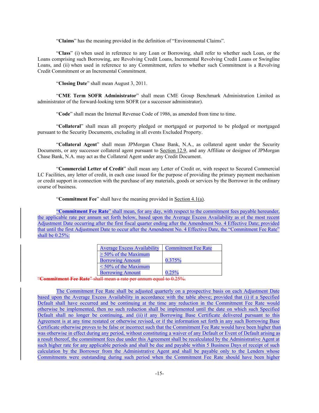 -15- ≥ 50% of the Maximum Borrowing Amount 0.375% Average Excess Availability < 50% of the Maximum Borrowing Amount Commitment Fee Rate 0.25% “Claims” has the meaning provided in the definition of “Environmental Claims”. “Class” (i) when used in reference to any Loan or Borrowing, shall refer to whether such Loan, or the Loans comprising such Borrowing, are Revolving Credit Loans, Incremental Revolving Credit Loans or Swingline Loans, and (ii) when used in reference to any Commitment, refers to whether such Commitment is a Revolving Credit Commitment or an Incremental Commitment. “Closing Date” shall mean August 3, 2011. “CME Term SOFR Administrator” shall mean CME Group Benchmark Administration Limited as administrator of the forward-looking term SOFR (or a successor administrator). “Code” shall mean the Internal Revenue Code of 1986, as amended from time to time. “Collateral” shall mean all property pledged or mortgaged or purported to be pledged or mortgaged pursuant to the Security Documents, excluding in all events Excluded Property. “Collateral Agent” shall mean JPMorgan Chase Bank, N.A., as collateral agent under the Security Documents, or any successor collateral agent pursuant to Section 12.9, and any Affiliate or designee of JPMorgan Chase Bank, N.A. may act as the Collateral Agent under any Credit Document. “Commercial Letter of Credit” shall mean any Letter of Credit or, with respect to Secured Commercial LC Facilities, any letter of credit, in each case issued for the purpose of providing the primary payment mechanism or credit support in connection with the purchase of any materials, goods or services by the Borrower in the ordinary course of business. “Commitment Fee” shall have the meaning provided in Section 4.1(a). “Commitment Fee Rate” shall mean, for any day, with respect to the commitment fees payable hereunder, the applicable rate per annum set forth below, based upon the Average Excess Availability as of the most recent Adjustment Date occurring after the first fiscal quarter ending after the Amendment No. 4 Effective Date; provided that until the first Adjustment Date to occur after the Amendment No. 4 Effective Date, the “Commitment Fee Rate” shall be 0.25%: “Commitment Fee Rate” shall mean a rate per annum equal to 0.25%. The Commitment Fee Rate shall be adjusted quarterly on a prospective basis on each Adjustment Date based upon the Average Excess Availability in accordance with the table above; provided that (i) if a Specified Default shall have occurred and be continuing at the time any reduction in the Commitment Fee Rate would otherwise be implemented, then no such reduction shall be implemented until the date on which such Specified Default shall no longer be continuing, and (ii) if any Borrowing Base Certificate delivered pursuant to this Agreement is at any time restated or otherwise revised, or if the information set forth in any such Borrowing Base Certificate otherwise proves to be false or incorrect such that the Commitment Fee Rate would have been higher than was otherwise in effect during any period, without constituting a waiver of any Default or Event of Default arising as a result thereof, the commitment fees due under this Agreement shall be recalculated by the Administrative Agent at such higher rate for any applicable periods and shall be due and payable within 5 Business Days of receipt of such calculation by the Borrower from the Administrative Agent and shall be payable only to the Lenders whose Commitments were outstanding during such period when the Commitment Fee Rate should have been higher