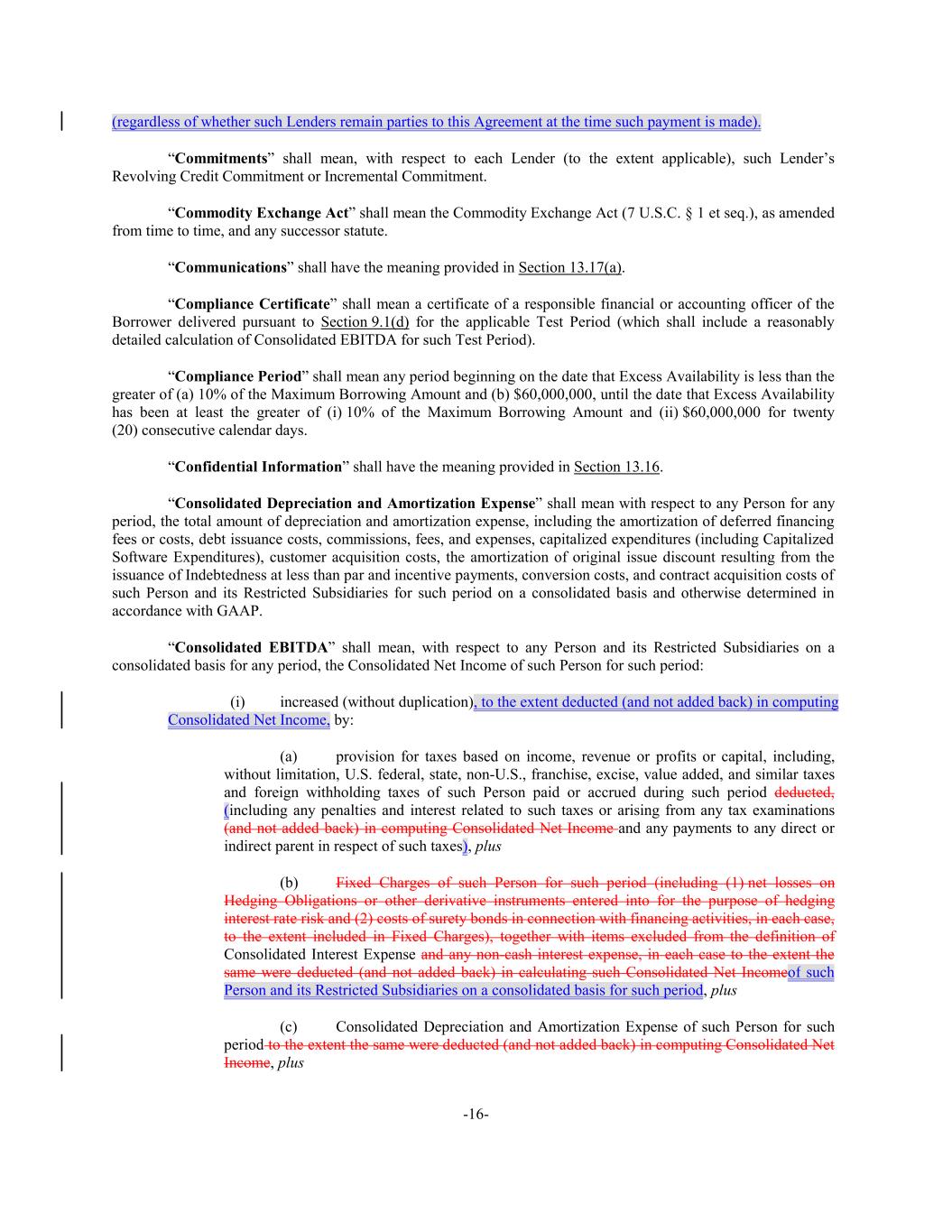 (regardless of whether such Lenders remain parties to this Agreement at the time such payment is made). “Commitments” shall mean, with respect to each Lender (to the extent applicable), such Lender’s Revolving Credit Commitment or Incremental Commitment. “Commodity Exchange Act” shall mean the Commodity Exchange Act (7 U.S.C. § 1 et seq.), as amended from time to time, and any successor statute. “Communications” shall have the meaning provided in Section 13.17(a). “Compliance Certificate” shall mean a certificate of a responsible financial or accounting officer of the Borrower delivered pursuant to Section 9.1(d) for the applicable Test Period (which shall include a reasonably detailed calculation of Consolidated EBITDA for such Test Period). “Compliance Period” shall mean any period beginning on the date that Excess Availability is less than the greater of (a) 10% of the Maximum Borrowing Amount and (b) $60,000,000, until the date that Excess Availability has been at least the greater of (i) 10% of the Maximum Borrowing Amount and (ii) $60,000,000 for twenty (20) consecutive calendar days. “Confidential Information” shall have the meaning provided in Section 13.16. “Consolidated Depreciation and Amortization Expense” shall mean with respect to any Person for any period, the total amount of depreciation and amortization expense, including the amortization of deferred financing fees or costs, debt issuance costs, commissions, fees, and expenses, capitalized expenditures (including Capitalized Software Expenditures), customer acquisition costs, the amortization of original issue discount resulting from the issuance of Indebtedness at less than par and incentive payments, conversion costs, and contract acquisition costs of such Person and its Restricted Subsidiaries for such period on a consolidated basis and otherwise determined in accordance with GAAP. “Consolidated EBITDA” shall mean, with respect to any Person and its Restricted Subsidiaries on a consolidated basis for any period, the Consolidated Net Income of such Person for such period: (i) increased (without duplication), to the extent deducted (and not added back) in computing Consolidated Net Income, by: (a) provision for taxes based on income, revenue or profits or capital, including, without limitation, U.S. federal, state, non-U.S., franchise, excise, value added, and similar taxes and foreign withholding taxes of such Person paid or accrued during such period deducted, (including any penalties and interest related to such taxes or arising from any tax examinations (and not added back) in computing Consolidated Net Income and any payments to any direct or indirect parent in respect of such taxes), plus (b) Fixed Charges of such Person for such period (including (1) net losses on Hedging Obligations or other derivative instruments entered into for the purpose of hedging interest rate risk and (2) costs of surety bonds in connection with financing activities, in each case, to the extent included in Fixed Charges), together with items excluded from the definition of Consolidated Interest Expense and any non-cash interest expense, in each case to the extent the same were deducted (and not added back) in calculating such Consolidated Net Incomeof such Person and its Restricted Subsidiaries on a consolidated basis for such period, plus (c) Consolidated Depreciation and Amortization Expense of such Person for such period to the extent the same were deducted (and not added back) in computing Consolidated Net Income, plus -16-