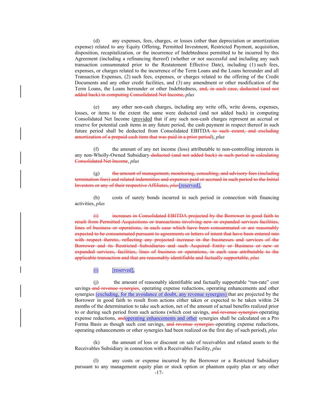 (d) any expenses, fees, charges, or losses (other than depreciation or amortization expense) related to any Equity Offering, Permitted Investment, Restricted Payment, acquisition, disposition, recapitalization, or the incurrence of Indebtedness permitted to be incurred by this Agreement (including a refinancing thereof) (whether or not successful and including any such transaction consummated prior to the Restatement Effective Date), including (1) such fees, expenses, or charges related to the incurrence of the Term Loans and the Loans hereunder and all Transaction Expenses, (2) such fees, expenses, or charges related to the offering of the Credit Documents and any other credit facilities, and (3) any amendment or other modification of the Term Loans, the Loans hereunder or other Indebtedness, and, in each case, deducted (and not added back) in computing Consolidated Net Income, plus (e) any other non-cash charges, including any write offs, write downs, expenses, losses, or items to the extent the same were deducted (and not added back) in computing Consolidated Net Income (provided that if any such non-cash charges represent an accrual or reserve for potential cash items in any future period, the cash payment in respect thereof in such future period shall be deducted from Consolidated EBITDA to such extent, and excluding amortization of a prepaid cash item that was paid in a prior period), plus (f) the amount of any net income (loss) attributable to non-controlling interests in any non-Wholly-Owned Subsidiary deducted (and not added back) in such period in calculating Consolidated Net Income, plus (g) the amount of management, monitoring, consulting, and advisory fees (including termination fees) and related indemnities and expenses paid or accrued in such period to the Initial Investors or any of their respective Affiliates, plus[reserved], (h) costs of surety bonds incurred in such period in connection with financing activities, plus (i) increases in Consolidated EBITDA projected by the Borrower in good faith to result from Permitted Acquisitions or transactions involving new or expanded services facilities, lines of business or operations, in each case which have been consummated or are reasonably expected to be consummated pursuant to agreements or letters of intent that have been entered into with respect thereto, reflecting any projected increase in the businesses and services of the Borrower and its Restricted Subsidiaries and such Acquired Entity or Business or new or expanded services, facilities, lines of business or operations, in each case attributable to the applicable transaction and that are reasonably identifiable and factually supportable, plus (i) [reserved], (j) the amount of reasonably identifiable and factually supportable “run-rate” cost savings and revenue synergies, operating expense reductions, operating enhancements and other synergies (excluding, for the avoidance of doubt, any revenue synergies) that are projected by the Borrower in good faith to result from actions either taken or expected to be taken within 24 months of the determination to take such action, net of the amount of actual benefits realized prior to or during such period from such actions (which cost savings, and revenue synergies operating expense reductions, andoperating enhancements and other synergies shall be calculated on a Pro Forma Basis as though such cost savings, and revenue synergies operating expense reductions, operating enhancements or other synergies had been realized on the first day of such period), plus (k) the amount of loss or discount on sale of receivables and related assets to the Receivables Subsidiary in connection with a Receivables Facility, plus (l) any costs or expense incurred by the Borrower or a Restricted Subsidiary pursuant to any management equity plan or stock option or phantom equity plan or any other -17-