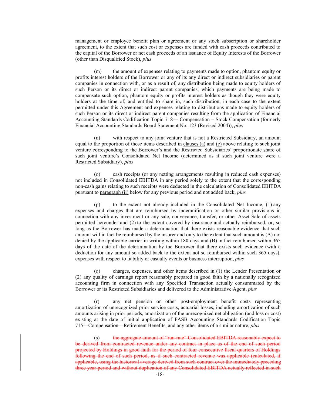 management or employee benefit plan or agreement or any stock subscription or shareholder agreement, to the extent that such cost or expenses are funded with cash proceeds contributed to the capital of the Borrower or net cash proceeds of an issuance of Equity Interests of the Borrower (other than Disqualified Stock), plus (m) the amount of expenses relating to payments made to option, phantom equity or profits interest holders of the Borrower or any of its any direct or indirect subsidiaries or parent companies in connection with, or as a result of, any distribution being made to equity holders of such Person or its direct or indirect parent companies, which payments are being made to compensate such option, phantom equity or profits interest holders as though they were equity holders at the time of, and entitled to share in, such distribution, in each case to the extent permitted under this Agreement and expenses relating to distributions made to equity holders of such Person or its direct or indirect parent companies resulting from the application of Financial Accounting Standards Codification Topic 718— Compensation – Stock Compensation (formerly Financial Accounting Standards Board Statement No. 123 (Revised 2004)), plus (n) with respect to any joint venture that is not a Restricted Subsidiary, an amount equal to the proportion of those items described in clauses (a) and (c) above relating to such joint venture corresponding to the Borrower’s and the Restricted Subsidiaries’ proportionate share of such joint venture’s Consolidated Net Income (determined as if such joint venture were a Restricted Subsidiary), plus (o) cash receipts (or any netting arrangements resulting in reduced cash expenses) not included in Consolidated EBITDA in any period solely to the extent that the corresponding non-cash gains relating to such receipts were deducted in the calculation of Consolidated EBITDA pursuant to paragraph (ii) below for any previous period and not added back, plus (p) to the extent not already included in the Consolidated Net Income, (1) any expenses and charges that are reimbursed by indemnification or other similar provisions in connection with any investment or any sale, conveyance, transfer, or other Asset Sale of assets permitted hereunder and (2) to the extent covered by insurance and actually reimbursed, or, so long as the Borrower has made a determination that there exists reasonable evidence that such amount will in fact be reimbursed by the insurer and only to the extent that such amount is (A) not denied by the applicable carrier in writing within 180 days and (B) in fact reimbursed within 365 days of the date of the determination by the Borrower that there exists such evidence (with a deduction for any amount so added back to the extent not so reimbursed within such 365 days), expenses with respect to liability or casualty events or business interruption, plus (q) charges, expenses, and other items described in (1) the Lender Presentation or (2) any quality of earnings report reasonably prepared in good faith by a nationally recognized accounting firm in connection with any Specified Transaction actually consummated by the Borrower or its Restricted Subsidiaries and delivered to the Administrative Agent, plus (r) any net pension or other post-employment benefit costs representing amortization of unrecognized prior service costs, actuarial losses, including amortization of such amounts arising in prior periods, amortization of the unrecognized net obligation (and loss or cost) existing at the date of initial application of FASB Accounting Standards Codification Topic 715—Compensation—Retirement Benefits, and any other items of a similar nature, plus (s) the aggregate amount of “run-rate” Consolidated EBITDA reasonably expect to be derived from contracted revenue under any contract in place as of the end of such period projected by Holdings in good faith for the period of four consecutive fiscal quarters of Holdings following the end of such period, as if such contracted revenue was applicable (calculated, if applicable, using the historical average derived from such contract over the immediately preceding three year period and without duplication of any Consolidated EBITDA actually reflected in such -18-