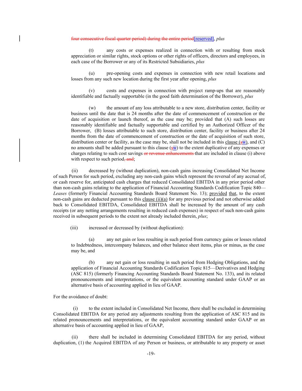 four consecutive fiscal quarter period) during the entire period[reserved], plus (t) any costs or expenses realized in connection with or resulting from stock appreciation or similar rights, stock options or other rights of officers, directors and employees, in each case of the Borrower or any of its Restricted Subsidiaries, plus (u) pre-opening costs and expenses in connection with new retail locations and losses from any such new location during the first year after opening, plus (v) costs and expenses in connection with project ramp-ups that are reasonably identifiable and factually supportable (in the good faith determination of the Borrower), plus (w) the amount of any loss attributable to a new store, distribution center, facility or business until the date that is 24 months after the date of commencement of construction or the date of acquisition or launch thereof, as the case may be; provided that (A) such losses are reasonably identifiable and factually supportable and certified by an Authorized Officer of the Borrower, (B) losses attributable to such store, distribution center, facility or business after 24 months from the date of commencement of construction or the date of acquisition of such store, distribution center or facility, as the case may be, shall not be included in this clause (sw), and (C) no amounts shall be added pursuant to this clause (sw) to the extent duplicative of any expenses or charges relating to such cost savings or revenue enhancements that are included in clause (i) above with respect to such period, and; (ii) decreased by (without duplication), non-cash gains increasing Consolidated Net Income of such Person for such period, excluding any non-cash gains which represent the reversal of any accrual of, or cash reserve for, anticipated cash charges that reduced Consolidated EBITDA in any prior period other than non-cash gains relating to the application of Financial Accounting Standards Codification Topic 840— Leases (formerly Financial Accounting Standards Board Statement No. 13); provided that, to the extent non-cash gains are deducted pursuant to this clause (ii)(a) for any previous period and not otherwise added back to Consolidated EBITDA, Consolidated EBITDA shall be increased by the amount of any cash receipts (or any netting arrangements resulting in reduced cash expenses) in respect of such non-cash gains received in subsequent periods to the extent not already included therein, plus; (iii) increased or decreased by (without duplication): (a) any net gain or loss resulting in such period from currency gains or losses related to Indebtedness, intercompany balances, and other balance sheet items, plus or minus, as the case may be, and (b) any net gain or loss resulting in such period from Hedging Obligations, and the application of Financial Accounting Standards Codification Topic 815—Derivatives and Hedging (ASC 815) (formerly Financing Accounting Standards Board Statement No. 133), and its related pronouncements and interpretations, or the equivalent accounting standard under GAAP or an alternative basis of accounting applied in lieu of GAAP. For the avoidance of doubt: (i) to the extent included in Consolidated Net Income, there shall be excluded in determining Consolidated EBITDA for any period any adjustments resulting from the application of ASC 815 and its related pronouncements and interpretations, or the equivalent accounting standard under GAAP or an alternative basis of accounting applied in lieu of GAAP, (ii) there shall be included in determining Consolidated EBITDA for any period, without duplication, (1) the Acquired EBITDA of any Person or business, or attributable to any property or asset -19-