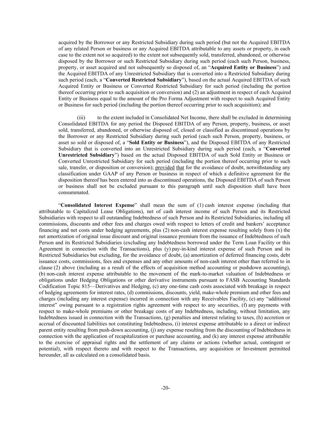 acquired by the Borrower or any Restricted Subsidiary during such period (but not the Acquired EBITDA of any related Person or business or any Acquired EBITDA attributable to any assets or property, in each case to the extent not so acquired) to the extent not subsequently sold, transferred, abandoned, or otherwise disposed by the Borrower or such Restricted Subsidiary during such period (each such Person, business, property, or asset acquired and not subsequently so disposed of, an “Acquired Entity or Business”) and the Acquired EBITDA of any Unrestricted Subsidiary that is converted into a Restricted Subsidiary during such period (each, a “Converted Restricted Subsidiary”), based on the actual Acquired EBITDA of such Acquired Entity or Business or Converted Restricted Subsidiary for such period (including the portion thereof occurring prior to such acquisition or conversion) and (2) an adjustment in respect of each Acquired Entity or Business equal to the amount of the Pro Forma Adjustment with respect to such Acquired Entity or Business for such period (including the portion thereof occurring prior to such acquisition); and (iii) to the extent included in Consolidated Net Income, there shall be excluded in determining Consolidated EBITDA for any period the Disposed EBITDA of any Person, property, business, or asset sold, transferred, abandoned, or otherwise disposed of, closed or classified as discontinued operations by the Borrower or any Restricted Subsidiary during such period (each such Person, property, business, or asset so sold or disposed of, a “Sold Entity or Business”), and the Disposed EBITDA of any Restricted Subsidiary that is converted into an Unrestricted Subsidiary during such period (each, a “Converted Unrestricted Subsidiary”) based on the actual Disposed EBITDA of such Sold Entity or Business or Converted Unrestricted Subsidiary for such period (including the portion thereof occurring prior to such sale, transfer, or disposition or conversion); provided that for the avoidance of doubt, notwithstanding any classification under GAAP of any Person or business in respect of which a definitive agreement for the disposition thereof has been entered into as discontinued operations, the Disposed EBITDA of such Person or business shall not be excluded pursuant to this paragraph until such disposition shall have been consummated. “Consolidated Interest Expense” shall mean the sum of (1) cash interest expense (including that attributable to Capitalized Lease Obligations), net of cash interest income of such Person and its Restricted Subsidiaries with respect to all outstanding Indebtedness of such Person and its Restricted Subsidiaries, including all commissions, discounts and other fees and charges owed with respect to letters of credit and bankers’ acceptance financing and net costs under hedging agreements, plus (2) non-cash interest expense resulting solely from (x) the net amortization of original issue discount and original issuance premium from the issuance of Indebtedness of such Person and its Restricted Subsidiaries (excluding any Indebtedness borrowed under the Term Loan Facility or this Agreement in connection with the Transactions), plus (y) pay-in-kind interest expense of such Person and its Restricted Subsidiaries but excluding, for the avoidance of doubt, (a) amortization of deferred financing costs, debt issuance costs, commissions, fees and expenses and any other amounts of non-cash interest other than referred to in clause (2) above (including as a result of the effects of acquisition method accounting or pushdown accounting), (b) non-cash interest expense attributable to the movement of the mark-to-market valuation of Indebtedness or obligations under Hedging Obligations or other derivative instruments pursuant to FASB Accounting Standards Codification Topic 815—Derivatives and Hedging, (c) any one-time cash costs associated with breakage in respect of hedging agreements for interest rates, (d) commissions, discounts, yield, make-whole premium and other fees and charges (including any interest expense) incurred in connection with any Receivables Facility, (e) any “additional interest” owing pursuant to a registration rights agreement with respect to any securities, (f) any payments with respect to make-whole premiums or other breakage costs of any Indebtedness, including, without limitation, any Indebtedness issued in connection with the Transactions, (g) penalties and interest relating to taxes, (h) accretion or accrual of discounted liabilities not constituting Indebtedness, (i) interest expense attributable to a direct or indirect parent entity resulting from push-down accounting, (j) any expense resulting from the discounting of Indebtedness in connection with the application of recapitalization or purchase accounting, and (k) any interest expense attributable to the exercise of appraisal rights and the settlement of any claims or actions (whether actual, contingent or potential), with respect thereto and with respect to the Transactions, any acquisition or Investment permitted hereunder, all as calculated on a consolidated basis. -20-