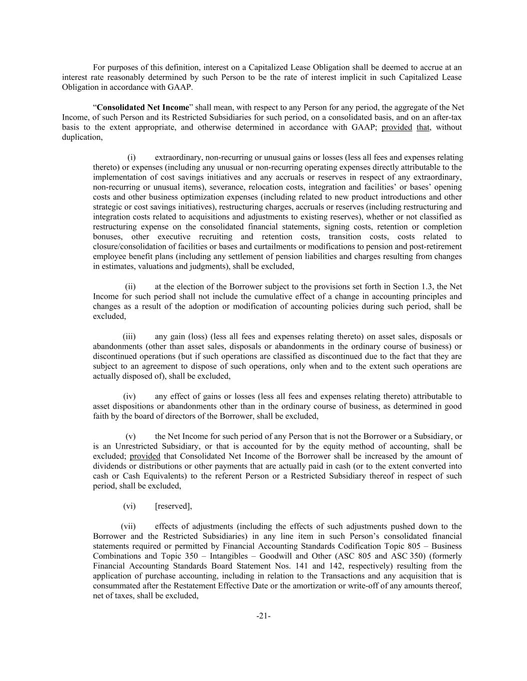 For purposes of this definition, interest on a Capitalized Lease Obligation shall be deemed to accrue at an interest rate reasonably determined by such Person to be the rate of interest implicit in such Capitalized Lease Obligation in accordance with GAAP. “Consolidated Net Income” shall mean, with respect to any Person for any period, the aggregate of the Net Income, of such Person and its Restricted Subsidiaries for such period, on a consolidated basis, and on an after-tax basis to the extent appropriate, and otherwise determined in accordance with GAAP; provided that, without duplication, (i) extraordinary, non-recurring or unusual gains or losses (less all fees and expenses relating thereto) or expenses (including any unusual or non-recurring operating expenses directly attributable to the implementation of cost savings initiatives and any accruals or reserves in respect of any extraordinary, non-recurring or unusual items), severance, relocation costs, integration and facilities’ or bases’ opening costs and other business optimization expenses (including related to new product introductions and other strategic or cost savings initiatives), restructuring charges, accruals or reserves (including restructuring and integration costs related to acquisitions and adjustments to existing reserves), whether or not classified as restructuring expense on the consolidated financial statements, signing costs, retention or completion bonuses, other executive recruiting and retention costs, transition costs, costs related to closure/consolidation of facilities or bases and curtailments or modifications to pension and post-retirement employee benefit plans (including any settlement of pension liabilities and charges resulting from changes in estimates, valuations and judgments), shall be excluded, (ii) at the election of the Borrower subject to the provisions set forth in Section 1.3, the Net Income for such period shall not include the cumulative effect of a change in accounting principles and changes as a result of the adoption or modification of accounting policies during such period, shall be excluded, (iii) any gain (loss) (less all fees and expenses relating thereto) on asset sales, disposals or abandonments (other than asset sales, disposals or abandonments in the ordinary course of business) or discontinued operations (but if such operations are classified as discontinued due to the fact that they are subject to an agreement to dispose of such operations, only when and to the extent such operations are actually disposed of), shall be excluded, (iv) any effect of gains or losses (less all fees and expenses relating thereto) attributable to asset dispositions or abandonments other than in the ordinary course of business, as determined in good faith by the board of directors of the Borrower, shall be excluded, (v) the Net Income for such period of any Person that is not the Borrower or a Subsidiary, or is an Unrestricted Subsidiary, or that is accounted for by the equity method of accounting, shall be excluded; provided that Consolidated Net Income of the Borrower shall be increased by the amount of dividends or distributions or other payments that are actually paid in cash (or to the extent converted into cash or Cash Equivalents) to the referent Person or a Restricted Subsidiary thereof in respect of such period, shall be excluded, (vi) [reserved], (vii) effects of adjustments (including the effects of such adjustments pushed down to the Borrower and the Restricted Subsidiaries) in any line item in such Person’s consolidated financial statements required or permitted by Financial Accounting Standards Codification Topic 805 – Business Combinations and Topic 350 – Intangibles – Goodwill and Other (ASC 805 and ASC 350) (formerly Financial Accounting Standards Board Statement Nos. 141 and 142, respectively) resulting from the application of purchase accounting, including in relation to the Transactions and any acquisition that is consummated after the Restatement Effective Date or the amortization or write-off of any amounts thereof, net of taxes, shall be excluded, -21-