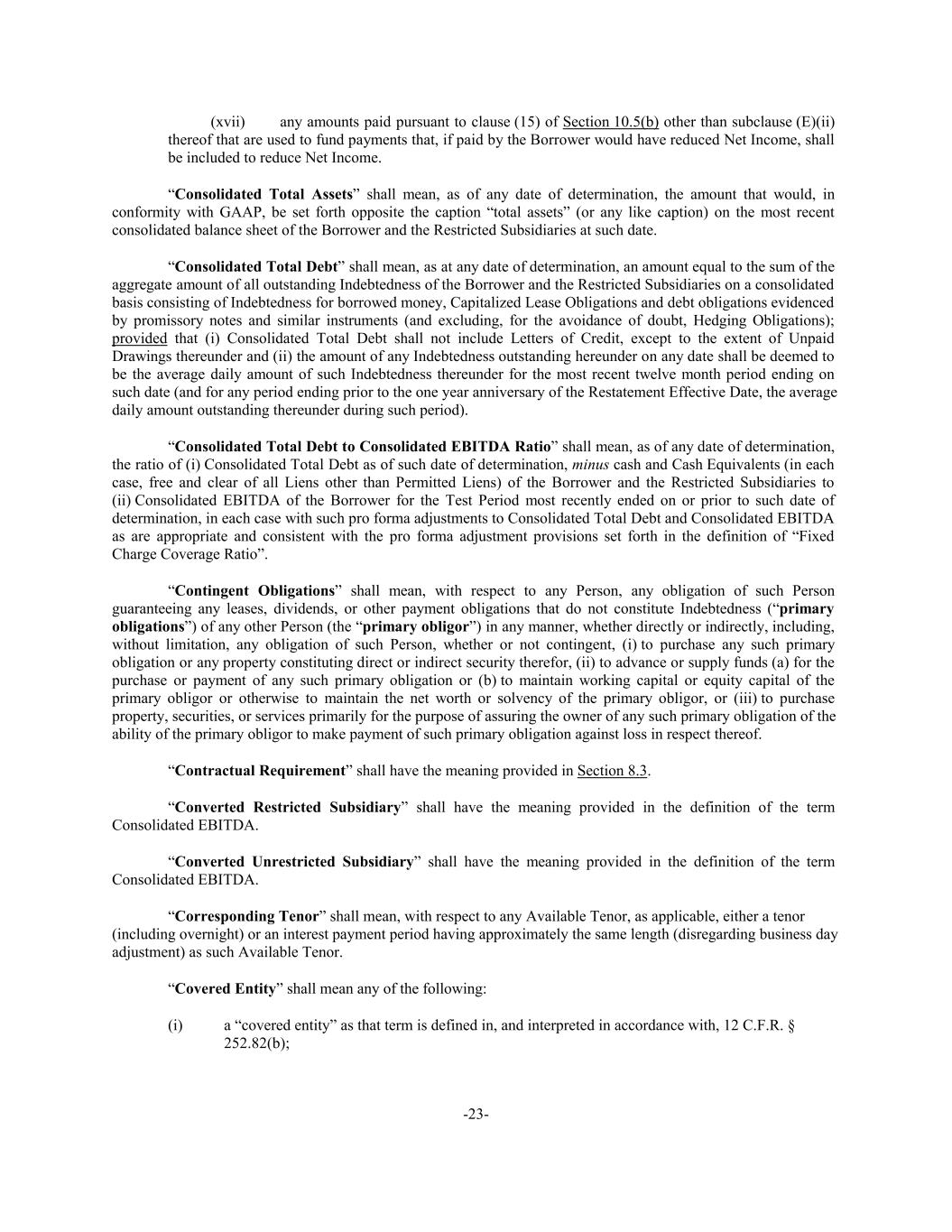 (xvii) any amounts paid pursuant to clause (15) of Section 10.5(b) other than subclause (E)(ii) thereof that are used to fund payments that, if paid by the Borrower would have reduced Net Income, shall be included to reduce Net Income. “Consolidated Total Assets” shall mean, as of any date of determination, the amount that would, in conformity with GAAP, be set forth opposite the caption “total assets” (or any like caption) on the most recent consolidated balance sheet of the Borrower and the Restricted Subsidiaries at such date. “Consolidated Total Debt” shall mean, as at any date of determination, an amount equal to the sum of the aggregate amount of all outstanding Indebtedness of the Borrower and the Restricted Subsidiaries on a consolidated basis consisting of Indebtedness for borrowed money, Capitalized Lease Obligations and debt obligations evidenced by promissory notes and similar instruments (and excluding, for the avoidance of doubt, Hedging Obligations); provided that (i) Consolidated Total Debt shall not include Letters of Credit, except to the extent of Unpaid Drawings thereunder and (ii) the amount of any Indebtedness outstanding hereunder on any date shall be deemed to be the average daily amount of such Indebtedness thereunder for the most recent twelve month period ending on such date (and for any period ending prior to the one year anniversary of the Restatement Effective Date, the average daily amount outstanding thereunder during such period). “Consolidated Total Debt to Consolidated EBITDA Ratio” shall mean, as of any date of determination, the ratio of (i) Consolidated Total Debt as of such date of determination, minus cash and Cash Equivalents (in each case, free and clear of all Liens other than Permitted Liens) of the Borrower and the Restricted Subsidiaries to (ii) Consolidated EBITDA of the Borrower for the Test Period most recently ended on or prior to such date of determination, in each case with such pro forma adjustments to Consolidated Total Debt and Consolidated EBITDA as are appropriate and consistent with the pro forma adjustment provisions set forth in the definition of “Fixed Charge Coverage Ratio”. “Contingent Obligations” shall mean, with respect to any Person, any obligation of such Person guaranteeing any leases, dividends, or other payment obligations that do not constitute Indebtedness (“primary obligations”) of any other Person (the “primary obligor”) in any manner, whether directly or indirectly, including, without limitation, any obligation of such Person, whether or not contingent, (i) to purchase any such primary obligation or any property constituting direct or indirect security therefor, (ii) to advance or supply funds (a) for the purchase or payment of any such primary obligation or (b) to maintain working capital or equity capital of the primary obligor or otherwise to maintain the net worth or solvency of the primary obligor, or (iii) to purchase property, securities, or services primarily for the purpose of assuring the owner of any such primary obligation of the ability of the primary obligor to make payment of such primary obligation against loss in respect thereof. “Contractual Requirement” shall have the meaning provided in Section 8.3. “Converted Restricted Subsidiary” shall have the meaning provided in the definition of the term Consolidated EBITDA. “Converted Unrestricted Subsidiary” shall have the meaning provided in the definition of the term Consolidated EBITDA. “Corresponding Tenor” shall mean, with respect to any Available Tenor, as applicable, either a tenor (including overnight) or an interest payment period having approximately the same length (disregarding business day adjustment) as such Available Tenor. “Covered Entity” shall mean any of the following: (i) a “covered entity” as that term is defined in, and interpreted in accordance with, 12 C.F.R. § 252.82(b); -23-