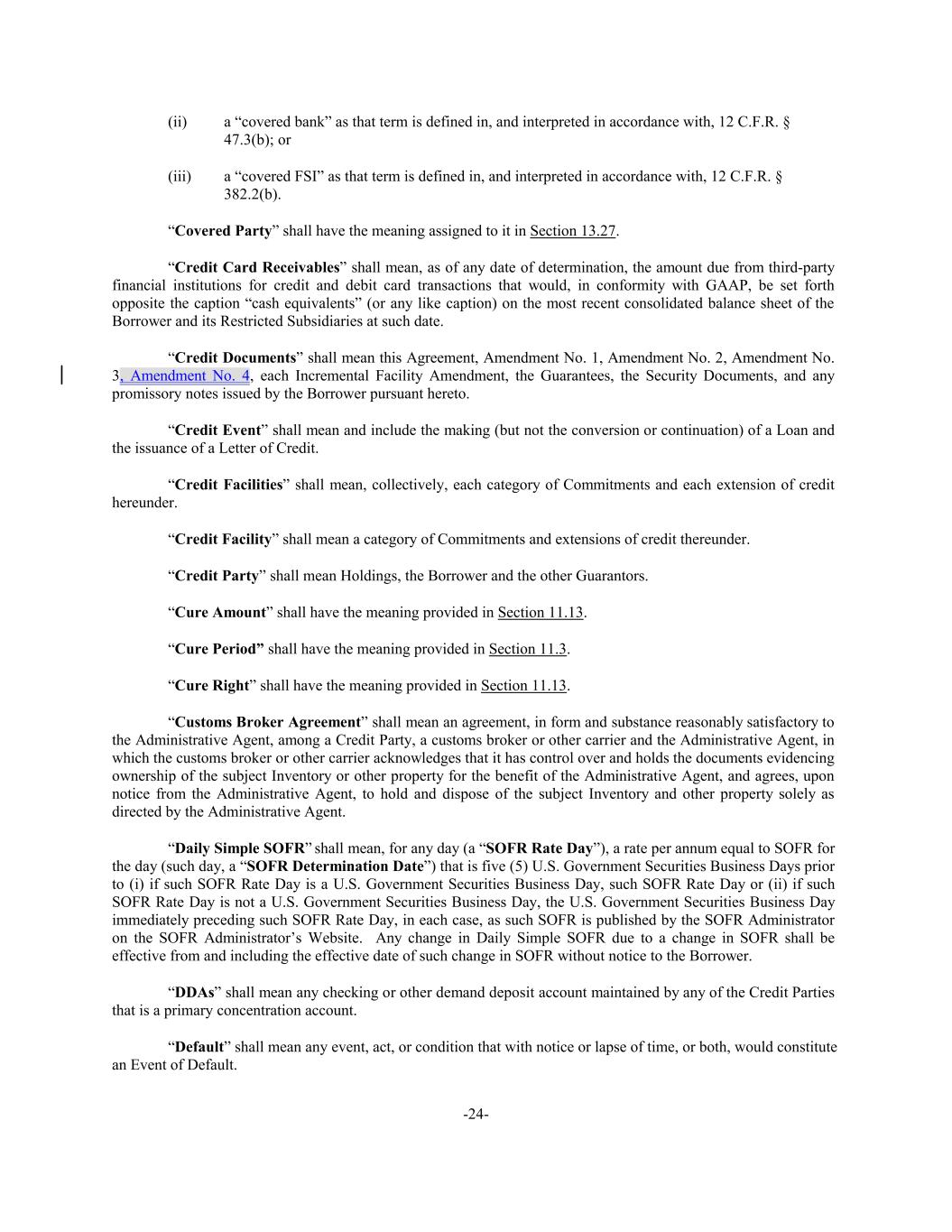 (ii) a “covered bank” as that term is defined in, and interpreted in accordance with, 12 C.F.R. § 47.3(b); or (iii) a “covered FSI” as that term is defined in, and interpreted in accordance with, 12 C.F.R. § 382.2(b). “Covered Party” shall have the meaning assigned to it in Section 13.27. “Credit Card Receivables” shall mean, as of any date of determination, the amount due from third-party financial institutions for credit and debit card transactions that would, in conformity with GAAP, be set forth opposite the caption “cash equivalents” (or any like caption) on the most recent consolidated balance sheet of the Borrower and its Restricted Subsidiaries at such date. “Credit Documents” shall mean this Agreement, Amendment No. 1, Amendment No. 2, Amendment No. 3, Amendment No. 4, each Incremental Facility Amendment, the Guarantees, the Security Documents, and any promissory notes issued by the Borrower pursuant hereto. “Credit Event” shall mean and include the making (but not the conversion or continuation) of a Loan and the issuance of a Letter of Credit. “Credit Facilities” shall mean, collectively, each category of Commitments and each extension of credit hereunder. “Credit Facility” shall mean a category of Commitments and extensions of credit thereunder. “Credit Party” shall mean Holdings, the Borrower and the other Guarantors. “Cure Amount” shall have the meaning provided in Section 11.13. “Cure Period” shall have the meaning provided in Section 11.3. “Cure Right” shall have the meaning provided in Section 11.13. “Customs Broker Agreement” shall mean an agreement, in form and substance reasonably satisfactory to the Administrative Agent, among a Credit Party, a customs broker or other carrier and the Administrative Agent, in which the customs broker or other carrier acknowledges that it has control over and holds the documents evidencing ownership of the subject Inventory or other property for the benefit of the Administrative Agent, and agrees, upon notice from the Administrative Agent, to hold and dispose of the subject Inventory and other property solely as directed by the Administrative Agent. “Daily Simple SOFR” shall mean, for any day (a “SOFR Rate Day”), a rate per annum equal to SOFR for the day (such day, a “SOFR Determination Date”) that is five (5) U.S. Government Securities Business Days prior to (i) if such SOFR Rate Day is a U.S. Government Securities Business Day, such SOFR Rate Day or (ii) if such SOFR Rate Day is not a U.S. Government Securities Business Day, the U.S. Government Securities Business Day immediately preceding such SOFR Rate Day, in each case, as such SOFR is published by the SOFR Administrator on the SOFR Administrator’s Website. Any change in Daily Simple SOFR due to a change in SOFR shall be effective from and including the effective date of such change in SOFR without notice to the Borrower. “DDAs” shall mean any checking or other demand deposit account maintained by any of the Credit Parties that is a primary concentration account. “Default” shall mean any event, act, or condition that with notice or lapse of time, or both, would constitute an Event of Default. -24-