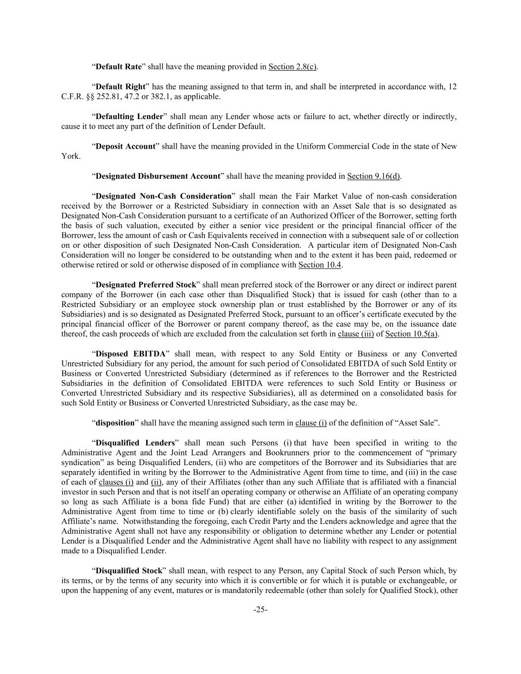 “Default Rate” shall have the meaning provided in Section 2.8(c). “Default Right” has the meaning assigned to that term in, and shall be interpreted in accordance with, 12 C.F.R. §§ 252.81, 47.2 or 382.1, as applicable. “Defaulting Lender” shall mean any Lender whose acts or failure to act, whether directly or indirectly, cause it to meet any part of the definition of Lender Default. “Deposit Account” shall have the meaning provided in the Uniform Commercial Code in the state of New York. “Designated Disbursement Account” shall have the meaning provided in Section 9.16(d). “Designated Non-Cash Consideration” shall mean the Fair Market Value of non-cash consideration received by the Borrower or a Restricted Subsidiary in connection with an Asset Sale that is so designated as Designated Non-Cash Consideration pursuant to a certificate of an Authorized Officer of the Borrower, setting forth the basis of such valuation, executed by either a senior vice president or the principal financial officer of the Borrower, less the amount of cash or Cash Equivalents received in connection with a subsequent sale of or collection on or other disposition of such Designated Non-Cash Consideration. A particular item of Designated Non-Cash Consideration will no longer be considered to be outstanding when and to the extent it has been paid, redeemed or otherwise retired or sold or otherwise disposed of in compliance with Section 10.4. “Designated Preferred Stock” shall mean preferred stock of the Borrower or any direct or indirect parent company of the Borrower (in each case other than Disqualified Stock) that is issued for cash (other than to a Restricted Subsidiary or an employee stock ownership plan or trust established by the Borrower or any of its Subsidiaries) and is so designated as Designated Preferred Stock, pursuant to an officer’s certificate executed by the principal financial officer of the Borrower or parent company thereof, as the case may be, on the issuance date thereof, the cash proceeds of which are excluded from the calculation set forth in clause (iii) of Section 10.5(a). “Disposed EBITDA” shall mean, with respect to any Sold Entity or Business or any Converted Unrestricted Subsidiary for any period, the amount for such period of Consolidated EBITDA of such Sold Entity or Business or Converted Unrestricted Subsidiary (determined as if references to the Borrower and the Restricted Subsidiaries in the definition of Consolidated EBITDA were references to such Sold Entity or Business or Converted Unrestricted Subsidiary and its respective Subsidiaries), all as determined on a consolidated basis for such Sold Entity or Business or Converted Unrestricted Subsidiary, as the case may be. “disposition” shall have the meaning assigned such term in clause (i) of the definition of “Asset Sale”. “Disqualified Lenders” shall mean such Persons (i) that have been specified in writing to the Administrative Agent and the Joint Lead Arrangers and Bookrunners prior to the commencement of “primary syndication” as being Disqualified Lenders, (ii) who are competitors of the Borrower and its Subsidiaries that are separately identified in writing by the Borrower to the Administrative Agent from time to time, and (iii) in the case of each of clauses (i) and (ii), any of their Affiliates (other than any such Affiliate that is affiliated with a financial investor in such Person and that is not itself an operating company or otherwise an Affiliate of an operating company so long as such Affiliate is a bona fide Fund) that are either (a) identified in writing by the Borrower to the Administrative Agent from time to time or (b) clearly identifiable solely on the basis of the similarity of such Affiliate’s name. Notwithstanding the foregoing, each Credit Party and the Lenders acknowledge and agree that the Administrative Agent shall not have any responsibility or obligation to determine whether any Lender or potential Lender is a Disqualified Lender and the Administrative Agent shall have no liability with respect to any assignment made to a Disqualified Lender. “Disqualified Stock” shall mean, with respect to any Person, any Capital Stock of such Person which, by its terms, or by the terms of any security into which it is convertible or for which it is putable or exchangeable, or upon the happening of any event, matures or is mandatorily redeemable (other than solely for Qualified Stock), other -25-