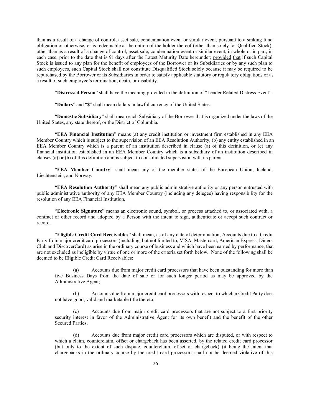 than as a result of a change of control, asset sale, condemnation event or similar event, pursuant to a sinking fund obligation or otherwise, or is redeemable at the option of the holder thereof (other than solely for Qualified Stock), other than as a result of a change of control, asset sale, condemnation event or similar event, in whole or in part, in each case, prior to the date that is 91 days after the Latest Maturity Date hereunder; provided that if such Capital Stock is issued to any plan for the benefit of employees of the Borrower or its Subsidiaries or by any such plan to such employees, such Capital Stock shall not constitute Disqualified Stock solely because it may be required to be repurchased by the Borrower or its Subsidiaries in order to satisfy applicable statutory or regulatory obligations or as a result of such employee’s termination, death, or disability. “Distressed Person” shall have the meaning provided in the definition of “Lender Related Distress Event”. “Dollars” and “$” shall mean dollars in lawful currency of the United States. “Domestic Subsidiary” shall mean each Subsidiary of the Borrower that is organized under the laws of the United States, any state thereof, or the District of Columbia. “EEA Financial Institution” means (a) any credit institution or investment firm established in any EEA Member Country which is subject to the supervision of an EEA Resolution Authority, (b) any entity established in an EEA Member Country which is a parent of an institution described in clause (a) of this definition, or (c) any financial institution established in an EEA Member Country which is a subsidiary of an institution described in clauses (a) or (b) of this definition and is subject to consolidated supervision with its parent. “EEA Member Country” shall mean any of the member states of the European Union, Iceland, Liechtenstein, and Norway. “EEA Resolution Authority” shall mean any public administrative authority or any person entrusted with public administrative authority of any EEA Member Country (including any delegee) having responsibility for the resolution of any EEA Financial Institution. “Electronic Signature” means an electronic sound, symbol, or process attached to, or associated with, a contract or other record and adopted by a Person with the intent to sign, authenticate or accept such contract or record. “Eligible Credit Card Receivables” shall mean, as of any date of determination, Accounts due to a Credit Party from major credit card processors (including, but not limited to, VISA, Mastercard, American Express, Diners Club and DiscoverCard) as arise in the ordinary course of business and which have been earned by performance, that are not excluded as ineligible by virtue of one or more of the criteria set forth below. None of the following shall be deemed to be Eligible Credit Card Receivables: (a) Accounts due from major credit card processors that have been outstanding for more than five Business Days from the date of sale or for such longer period as may be approved by the Administrative Agent; (b) Accounts due from major credit card processors with respect to which a Credit Party does not have good, valid and marketable title thereto; (c) Accounts due from major credit card processors that are not subject to a first priority security interest in favor of the Administrative Agent for its own benefit and the benefit of the other Secured Parties; (d) Accounts due from major credit card processors which are disputed, or with respect to which a claim, counterclaim, offset or chargeback has been asserted, by the related credit card processor (but only to the extent of such dispute, counterclaim, offset or chargeback) (it being the intent that chargebacks in the ordinary course by the credit card processors shall not be deemed violative of this -26-