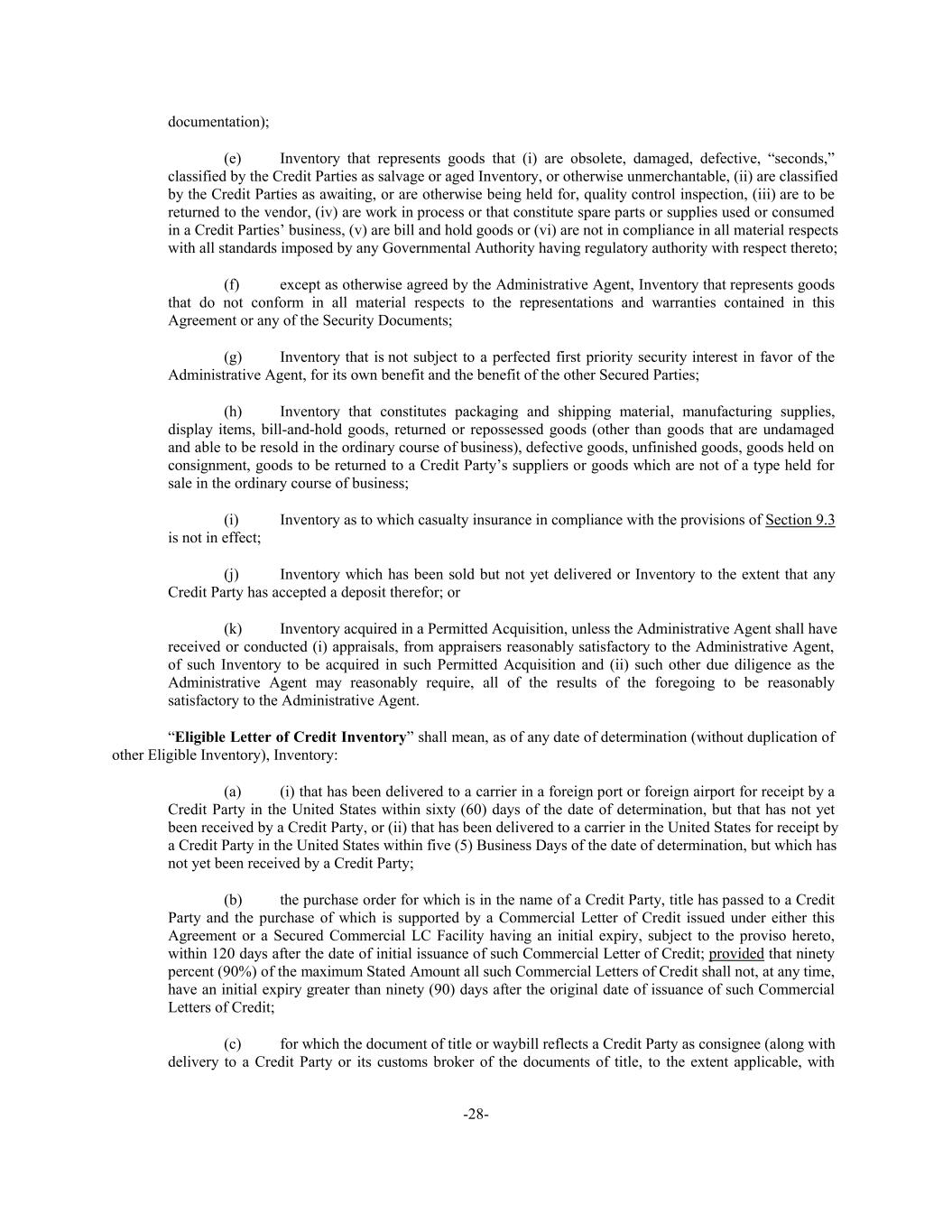 documentation); (e) Inventory that represents goods that (i) are obsolete, damaged, defective, “seconds,” classified by the Credit Parties as salvage or aged Inventory, or otherwise unmerchantable, (ii) are classified by the Credit Parties as awaiting, or are otherwise being held for, quality control inspection, (iii) are to be returned to the vendor, (iv) are work in process or that constitute spare parts or supplies used or consumed in a Credit Parties’ business, (v) are bill and hold goods or (vi) are not in compliance in all material respects with all standards imposed by any Governmental Authority having regulatory authority with respect thereto; (f) except as otherwise agreed by the Administrative Agent, Inventory that represents goods that do not conform in all material respects to the representations and warranties contained in this Agreement or any of the Security Documents; (g) Inventory that is not subject to a perfected first priority security interest in favor of the Administrative Agent, for its own benefit and the benefit of the other Secured Parties; (h) Inventory that constitutes packaging and shipping material, manufacturing supplies, display items, bill-and-hold goods, returned or repossessed goods (other than goods that are undamaged and able to be resold in the ordinary course of business), defective goods, unfinished goods, goods held on consignment, goods to be returned to a Credit Party’s suppliers or goods which are not of a type held for sale in the ordinary course of business; (i) Inventory as to which casualty insurance in compliance with the provisions of Section 9.3 is not in effect; (j) Inventory which has been sold but not yet delivered or Inventory to the extent that any Credit Party has accepted a deposit therefor; or (k) Inventory acquired in a Permitted Acquisition, unless the Administrative Agent shall have received or conducted (i) appraisals, from appraisers reasonably satisfactory to the Administrative Agent, of such Inventory to be acquired in such Permitted Acquisition and (ii) such other due diligence as the Administrative Agent may reasonably require, all of the results of the foregoing to be reasonably satisfactory to the Administrative Agent. “Eligible Letter of Credit Inventory” shall mean, as of any date of determination (without duplication of other Eligible Inventory), Inventory: (a) (i) that has been delivered to a carrier in a foreign port or foreign airport for receipt by a Credit Party in the United States within sixty (60) days of the date of determination, but that has not yet been received by a Credit Party, or (ii) that has been delivered to a carrier in the United States for receipt by a Credit Party in the United States within five (5) Business Days of the date of determination, but which has not yet been received by a Credit Party; (b) the purchase order for which is in the name of a Credit Party, title has passed to a Credit Party and the purchase of which is supported by a Commercial Letter of Credit issued under either this Agreement or a Secured Commercial LC Facility having an initial expiry, subject to the proviso hereto, within 120 days after the date of initial issuance of such Commercial Letter of Credit; provided that ninety percent (90%) of the maximum Stated Amount all such Commercial Letters of Credit shall not, at any time, have an initial expiry greater than ninety (90) days after the original date of issuance of such Commercial Letters of Credit; (c) for which the document of title or waybill reflects a Credit Party as consignee (along with delivery to a Credit Party or its customs broker of the documents of title, to the extent applicable, with -28-