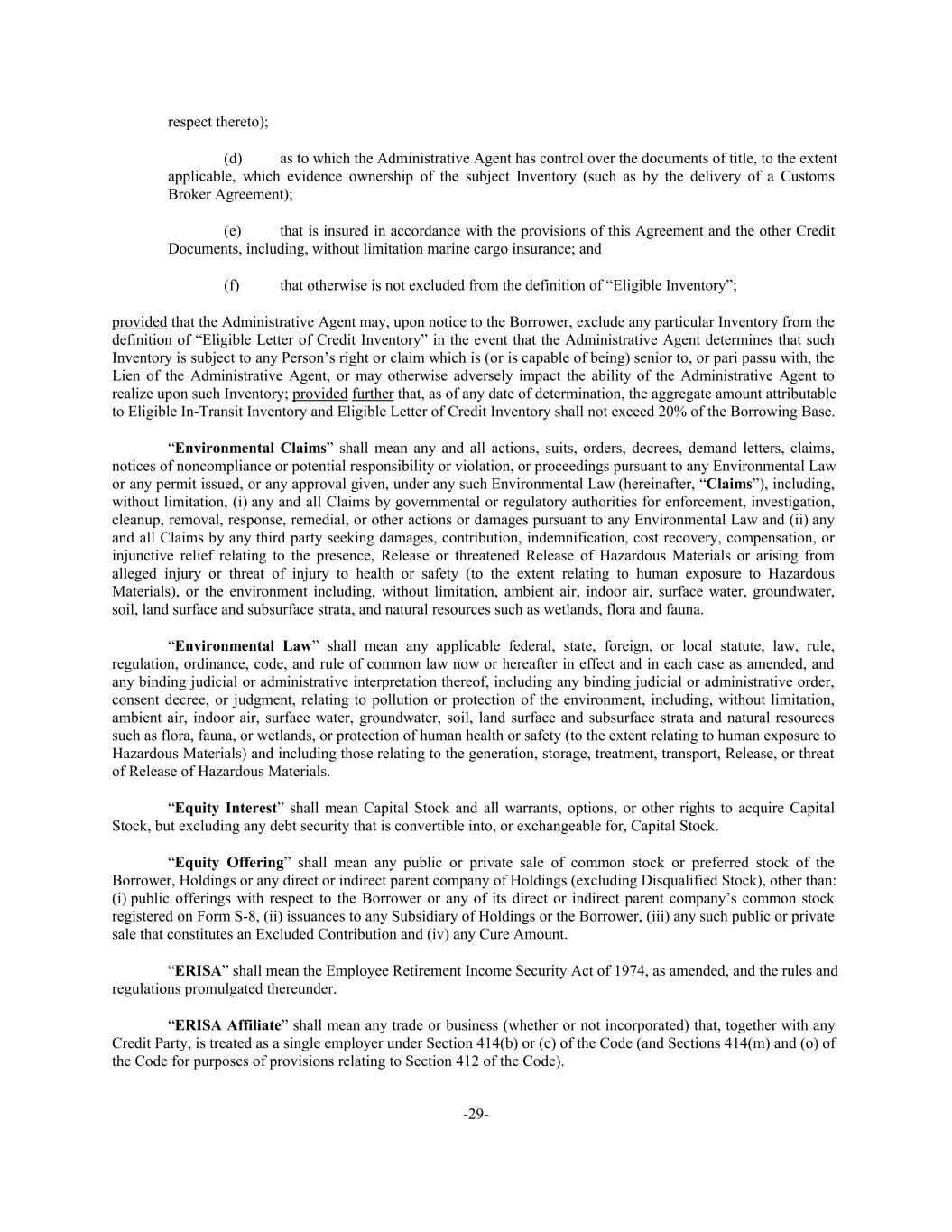 respect thereto); (d) as to which the Administrative Agent has control over the documents of title, to the extent applicable, which evidence ownership of the subject Inventory (such as by the delivery of a Customs Broker Agreement); (e) that is insured in accordance with the provisions of this Agreement and the other Credit Documents, including, without limitation marine cargo insurance; and (f) that otherwise is not excluded from the definition of “Eligible Inventory”; provided that the Administrative Agent may, upon notice to the Borrower, exclude any particular Inventory from the definition of “Eligible Letter of Credit Inventory” in the event that the Administrative Agent determines that such Inventory is subject to any Person’s right or claim which is (or is capable of being) senior to, or pari passu with, the Lien of the Administrative Agent, or may otherwise adversely impact the ability of the Administrative Agent to realize upon such Inventory; provided further that, as of any date of determination, the aggregate amount attributable to Eligible In-Transit Inventory and Eligible Letter of Credit Inventory shall not exceed 20% of the Borrowing Base. “Environmental Claims” shall mean any and all actions, suits, orders, decrees, demand letters, claims, notices of noncompliance or potential responsibility or violation, or proceedings pursuant to any Environmental Law or any permit issued, or any approval given, under any such Environmental Law (hereinafter, “Claims”), including, without limitation, (i) any and all Claims by governmental or regulatory authorities for enforcement, investigation, cleanup, removal, response, remedial, or other actions or damages pursuant to any Environmental Law and (ii) any and all Claims by any third party seeking damages, contribution, indemnification, cost recovery, compensation, or injunctive relief relating to the presence, Release or threatened Release of Hazardous Materials or arising from alleged injury or threat of injury to health or safety (to the extent relating to human exposure to Hazardous Materials), or the environment including, without limitation, ambient air, indoor air, surface water, groundwater, soil, land surface and subsurface strata, and natural resources such as wetlands, flora and fauna. “Environmental Law” shall mean any applicable federal, state, foreign, or local statute, law, rule, regulation, ordinance, code, and rule of common law now or hereafter in effect and in each case as amended, and any binding judicial or administrative interpretation thereof, including any binding judicial or administrative order, consent decree, or judgment, relating to pollution or protection of the environment, including, without limitation, ambient air, indoor air, surface water, groundwater, soil, land surface and subsurface strata and natural resources such as flora, fauna, or wetlands, or protection of human health or safety (to the extent relating to human exposure to Hazardous Materials) and including those relating to the generation, storage, treatment, transport, Release, or threat of Release of Hazardous Materials. “Equity Interest” shall mean Capital Stock and all warrants, options, or other rights to acquire Capital Stock, but excluding any debt security that is convertible into, or exchangeable for, Capital Stock. “Equity Offering” shall mean any public or private sale of common stock or preferred stock of the Borrower, Holdings or any direct or indirect parent company of Holdings (excluding Disqualified Stock), other than: (i) public offerings with respect to the Borrower or any of its direct or indirect parent company’s common stock registered on Form S-8, (ii) issuances to any Subsidiary of Holdings or the Borrower, (iii) any such public or private sale that constitutes an Excluded Contribution and (iv) any Cure Amount. “ERISA” shall mean the Employee Retirement Income Security Act of 1974, as amended, and the rules and regulations promulgated thereunder. “ERISA Affiliate” shall mean any trade or business (whether or not incorporated) that, together with any Credit Party, is treated as a single employer under Section 414(b) or (c) of the Code (and Sections 414(m) and (o) of the Code for purposes of provisions relating to Section 412 of the Code). -29-