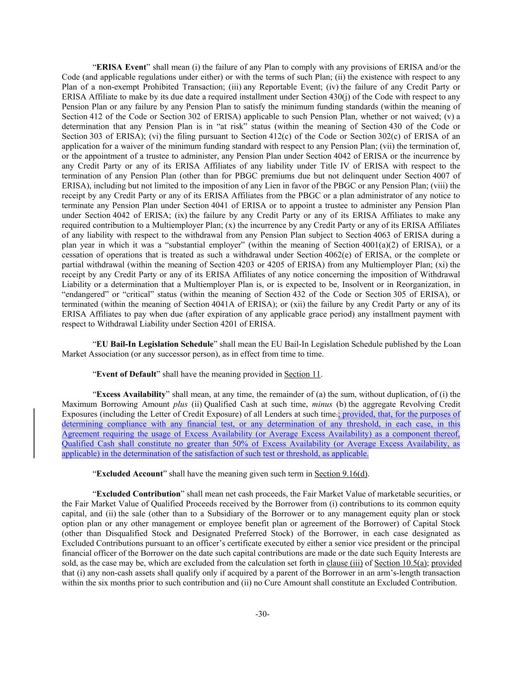 “ERISA Event” shall mean (i) the failure of any Plan to comply with any provisions of ERISA and/or the Code (and applicable regulations under either) or with the terms of such Plan; (ii) the existence with respect to any Plan of a non-exempt Prohibited Transaction; (iii) any Reportable Event; (iv) the failure of any Credit Party or ERISA Affiliate to make by its due date a required installment under Section 430(j) of the Code with respect to any Pension Plan or any failure by any Pension Plan to satisfy the minimum funding standards (within the meaning of Section 412 of the Code or Section 302 of ERISA) applicable to such Pension Plan, whether or not waived; (v) a determination that any Pension Plan is in “at risk” status (within the meaning of Section 430 of the Code or Section 303 of ERISA); (vi) the filing pursuant to Section 412(c) of the Code or Section 302(c) of ERISA of an application for a waiver of the minimum funding standard with respect to any Pension Plan; (vii) the termination of, or the appointment of a trustee to administer, any Pension Plan under Section 4042 of ERISA or the incurrence by any Credit Party or any of its ERISA Affiliates of any liability under Title IV of ERISA with respect to the termination of any Pension Plan (other than for PBGC premiums due but not delinquent under Section 4007 of ERISA), including but not limited to the imposition of any Lien in favor of the PBGC or any Pension Plan; (viii) the receipt by any Credit Party or any of its ERISA Affiliates from the PBGC or a plan administrator of any notice to terminate any Pension Plan under Section 4041 of ERISA or to appoint a trustee to administer any Pension Plan under Section 4042 of ERISA; (ix) the failure by any Credit Party or any of its ERISA Affiliates to make any required contribution to a Multiemployer Plan; (x) the incurrence by any Credit Party or any of its ERISA Affiliates of any liability with respect to the withdrawal from any Pension Plan subject to Section 4063 of ERISA during a plan year in which it was a “substantial employer” (within the meaning of Section 4001(a)(2) of ERISA), or a cessation of operations that is treated as such a withdrawal under Section 4062(e) of ERISA, or the complete or partial withdrawal (within the meaning of Section 4203 or 4205 of ERISA) from any Multiemployer Plan; (xi) the receipt by any Credit Party or any of its ERISA Affiliates of any notice concerning the imposition of Withdrawal Liability or a determination that a Multiemployer Plan is, or is expected to be, Insolvent or in Reorganization, in “endangered” or “critical” status (within the meaning of Section 432 of the Code or Section 305 of ERISA), or terminated (within the meaning of Section 4041A of ERISA); or (xii) the failure by any Credit Party or any of its ERISA Affiliates to pay when due (after expiration of any applicable grace period) any installment payment with respect to Withdrawal Liability under Section 4201 of ERISA. “EU Bail-In Legislation Schedule” shall mean the EU Bail-In Legislation Schedule published by the Loan Market Association (or any successor person), as in effect from time to time. “Event of Default” shall have the meaning provided in Section 11. “Excess Availability” shall mean, at any time, the remainder of (a) the sum, without duplication, of (i) the Maximum Borrowing Amount plus (ii) Qualified Cash at such time, minus (b) the aggregate Revolving Credit Exposures (including the Letter of Credit Exposure) of all Lenders at such time.; provided, that, for the purposes of determining compliance with any financial test, or any determination of any threshold, in each case, in this Agreement requiring the usage of Excess Availability (or Average Excess Availability) as a component thereof, Qualified Cash shall constitute no greater than 50% of Excess Availability (or Average Excess Availability, as applicable) in the determination of the satisfaction of such test or threshold, as applicable. “Excluded Account” shall have the meaning given such term in Section 9.16(d). “Excluded Contribution” shall mean net cash proceeds, the Fair Market Value of marketable securities, or the Fair Market Value of Qualified Proceeds received by the Borrower from (i) contributions to its common equity capital, and (ii) the sale (other than to a Subsidiary of the Borrower or to any management equity plan or stock option plan or any other management or employee benefit plan or agreement of the Borrower) of Capital Stock (other than Disqualified Stock and Designated Preferred Stock) of the Borrower, in each case designated as Excluded Contributions pursuant to an officer’s certificate executed by either a senior vice president or the principal financial officer of the Borrower on the date such capital contributions are made or the date such Equity Interests are sold, as the case may be, which are excluded from the calculation set forth in clause (iii) of Section 10.5(a); provided that (i) any non-cash assets shall qualify only if acquired by a parent of the Borrower in an arm’s-length transaction within the six months prior to such contribution and (ii) no Cure Amount shall constitute an Excluded Contribution. -30-