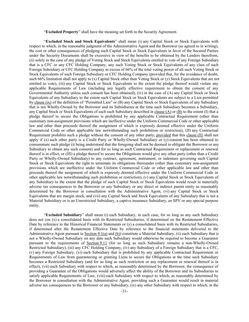 “Excluded Property” shall have the meaning set forth in the Security Agreement. “Excluded Stock and Stock Equivalents” shall mean (i) any Capital Stock or Stock Equivalents with respect to which, in the reasonable judgment of the Administrative Agent and the Borrower (as agreed to in writing), the cost or other consequences of pledging such Capital Stock or Stock Equivalents in favor of the Secured Parties under the Security Documents shall be excessive in view of the benefits to be obtained by the Lenders therefrom, (ii) solely in the case of any pledge of Voting Stock and Stock Equivalents entitled to vote of any Foreign Subsidiary that is a CFC or any CFC Holding Company, any such Voting Stock or Stock Equivalents of any class of such Foreign Subsidiary or CFC Holding Company in excess of 66% of the total voting power of all such Voting Stock or Stock Equivalents of such Foreign Subsidiary or CFC Holding Company (provided that, for the avoidance of doubt, such 66% limitation shall not apply to (x) Capital Stock other than Voting Stock or (y) Stock Equivalents that are not entitled to vote), (iii) any Capital Stock or Stock Equivalents to the extent the pledge thereof would violate any applicable Requirements of Law (including any legally effective requirement to obtain the consent of any Governmental Authority unless such consent has been obtained), (iv) in the case of (A) any Capital Stock or Stock Equivalents of any Subsidiary to the extent such Capital Stock or Stock Equivalents are subject to a Lien permitted by clause (ix) of the definition of “Permitted Lien” or (B) any Capital Stock or Stock Equivalents of any Subsidiary that is not Wholly-Owned by the Borrower and its Subsidiaries at the time such Subsidiary becomes a Subsidiary, any Capital Stock or Stock Equivalents of each such Subsidiary described in clause (A) or (B) to the extent (I) that a pledge thereof to secure the Obligations is prohibited by any applicable Contractual Requirement (other than customary non-assignment provisions which are ineffective under the Uniform Commercial Code or other applicable law and other than proceeds thereof the assignment of which is expressly deemed effective under the Uniform Commercial Code or other applicable law notwithstanding such prohibition or restriction), (II) any Contractual Requirement prohibits such a pledge without the consent of any other party; provided that this clause (II) shall not apply if (x) such other party is a Credit Party or Wholly-Owned Subsidiary or (y) consent has been obtained to consummate such pledge (it being understood that the foregoing shall not be deemed to obligate the Borrower or any Subsidiary to obtain any such consent) and for so long as such Contractual Requirement or replacement or renewal thereof is in effect, or (III) a pledge thereof to secure the Obligations would give any other party (other than a Credit Party or Wholly-Owned Subsidiary) to any contract, agreement, instrument, or indenture governing such Capital Stock or Stock Equivalents the right to terminate its obligations thereunder (other than customary non-assignment provisions which are ineffective under the Uniform Commercial Code or other applicable law and other than proceeds thereof the assignment of which is expressly deemed effective under the Uniform Commercial Code or other applicable law notwithstanding such prohibition or restriction), (v) any Capital Stock or Stock Equivalents of any Subsidiary to the extent that the pledge of such Capital Stock or Stock Equivalents would result in materially adverse tax consequences to the Borrower or any Subsidiary or any direct or indirect parent entity as reasonably determined by the Borrower in consultation with the Administrative Agent, (vi) any Capital Stock or Stock Equivalents that are margin stock, and (vii) any Capital Stock and Stock Equivalents of any Subsidiary that is not a Material Subsidiary or is an Unrestricted Subsidiary, a captive insurance Subsidiary, an SPV or any special purpose entity. “Excluded Subsidiary” shall mean (i) each Subsidiary, in each case, for so long as any such Subsidiary does not (on (x) a consolidated basis with its Restricted Subsidiaries, if determined on the Restatement Effective Date by reference to the Historical Financial Statements or (y) a consolidated basis with its Restricted Subsidiaries, if determined after the Restatement Effective Date by reference to the financial statements delivered to the Administrative Agent pursuant to Section 9.1(a) and (b)) constitute a Material Subsidiary, (ii) each Subsidiary that is not a Wholly-Owned Subsidiary on any date such Subsidiary would otherwise be required to become a Guarantor pursuant to the requirements of Section 9.11 (for so long as such Subsidiary remains a non-Wholly-Owned Restricted Subsidiary), (iii) any CFC Holding Company, (iv) any Subsidiary of a Foreign Subsidiary that is a CFC, (v) any Foreign Subsidiary, (vi) each Subsidiary that is prohibited by any applicable Contractual Requirement or Requirements of Law from guaranteeing or granting Liens to secure the Obligations at the time such Subsidiary becomes a Restricted Subsidiary (and for so long as such restriction or any replacement or renewal thereof is in effect), (vii) each Subsidiary with respect to which, as reasonably determined by the Borrower, the consequence of providing a Guarantee of the Obligations would adversely affect the ability of the Borrower and its Subsidiaries to satisfy applicable Requirements of Law, (viii) each Subsidiary with respect to which, as reasonably determined by the Borrower in consultation with the Administrative Agent, providing such a Guarantee would result in material adverse tax consequences to the Borrower or any Subsidiary, (ix) any other Subsidiary with respect to which, in the -31-
