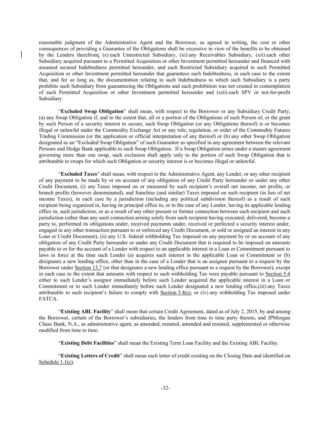reasonable judgment of the Administrative Agent and the Borrower, as agreed in writing, the cost or other consequences of providing a Guarantee of the Obligations shall be excessive in view of the benefits to be obtained by the Lenders therefrom, (x) each Unrestricted Subsidiary, (xi) any Receivables Subsidiary, (xii) each other Subsidiary acquired pursuant to a Permitted Acquisition or other Investment permitted hereunder and financed with assumed secured Indebtedness permitted hereunder, and each Restricted Subsidiary acquired in such Permitted Acquisition or other Investment permitted hereunder that guarantees such Indebtedness, in each case to the extent that, and for so long as, the documentation relating to such Indebtedness to which such Subsidiary is a party prohibits such Subsidiary from guaranteeing the Obligations and such prohibition was not created in contemplation of such Permitted Acquisition or other Investment permitted hereunder and (xiii) each SPV or not-for-profit Subsidiary. “Excluded Swap Obligation” shall mean, with respect to the Borrower or any Subsidiary Credit Party, (a) any Swap Obligation if, and to the extent that, all or a portion of the Obligations of such Person of, or the grant by such Person of a security interest to secure, such Swap Obligation (or any Obligations thereof) is or becomes illegal or unlawful under the Commodity Exchange Act or any rule, regulation, or order of the Commodity Futures Trading Commission (or the application or official interpretation of any thereof) or (b) any other Swap Obligation designated as an “Excluded Swap Obligation” of such Guarantor as specified in any agreement between the relevant Persons and Hedge Bank applicable to such Swap Obligation. If a Swap Obligation arises under a master agreement governing more than one swap, such exclusion shall apply only to the portion of such Swap Obligation that is attributable to swaps for which such Obligation or security interest is or becomes illegal or unlawful. “Excluded Taxes” shall mean, with respect to the Administrative Agent, any Lender, or any other recipient of any payment to be made by or on account of any obligation of any Credit Party hereunder or under any other Credit Document, (i) any Taxes imposed on or measured by such recipient’s overall net income, net profits, or branch profits (however denominated), and franchise (and similar) Taxes imposed on such recipient (in lieu of net income Taxes), in each case by a jurisdiction (including any political subdivision thereof) as a result of such recipient being organized in, having its principal office in, or in the case of any Lender, having its applicable lending office in, such jurisdiction, or as a result of any other present or former connection between such recipient and such jurisdiction (other than any such connection arising solely from such recipient having executed, delivered, become a party to, performed its obligations under, received payments under, received or perfected a security interest under, engaged in any other transaction pursuant to or enforced any Credit Document, or sold or assigned an interest in any Loan or Credit Document), (ii) any U.S. federal withholding Tax imposed on any payment by or on account of any obligation of any Credit Party hereunder or under any Credit Document that is required to be imposed on amounts payable to or for the account of a Lender with respect to an applicable interest in a Loan or Commitment pursuant to laws in force at the time such Lender (a) acquires such interest in the applicable Loan or Commitment or (b) designates a new lending office, other than in the case of a Lender that is an assignee pursuant to a request by the Borrower under Section 13.7 (or that designates a new lending office pursuant to a request by the Borrower), except in each case to the extent that amounts with respect to such withholding Tax were payable pursuant to Section 5.4 either to such Lender’s assignor immediately before such Lender acquired the applicable interest in a Loan or Commitment or to such Lender immediately before such Lender designated a new lending office,(iii) any Taxes attributable to such recipient’s failure to comply with Section 5.4(e), or (iv) any withholding Tax imposed under FATCA. “Existing ABL Facility” shall mean that certain Credit Agreement, dated as of July 2, 2015, by and among the Borrower, certain of the Borrower’s subsidiaries, the lenders from time to time party thereto, and JPMorgan Chase Bank, N.A., as administrative agent, as amended, restated, amended and restated, supplemented or otherwise modified from time to time. “Existing Debt Facilities” shall mean the Existing Term Loan Facility and the Existing ABL Facility. “Existing Letters of Credit” shall mean each letter of credit existing on the Closing Date and identified on Schedule 1.1(c). -32-