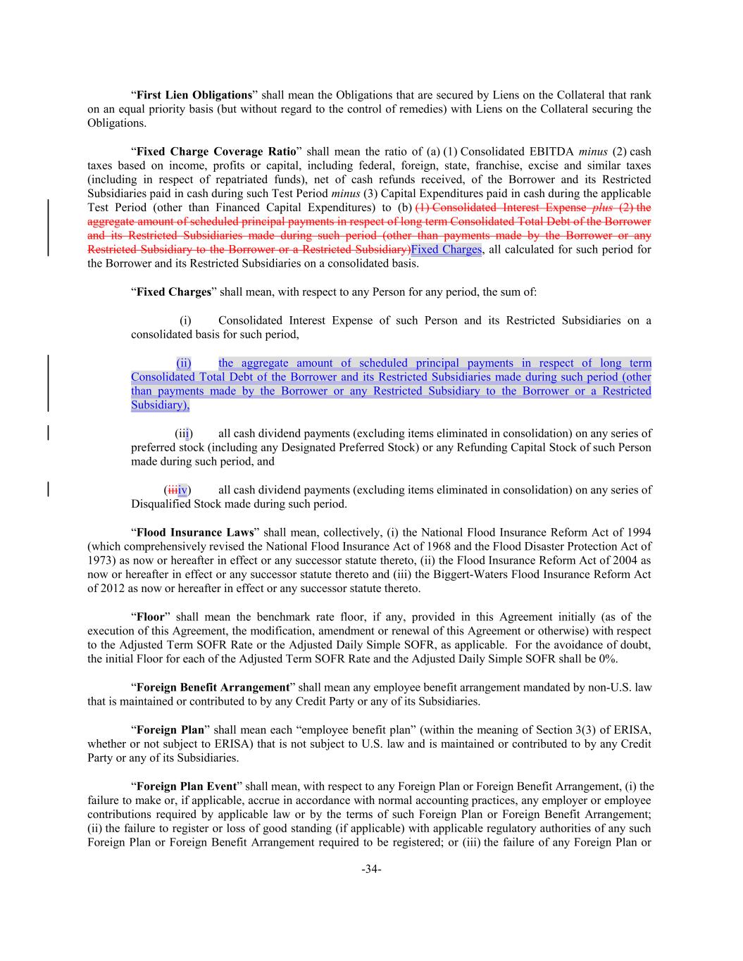 “First Lien Obligations” shall mean the Obligations that are secured by Liens on the Collateral that rank on an equal priority basis (but without regard to the control of remedies) with Liens on the Collateral securing the Obligations. “Fixed Charge Coverage Ratio” shall mean the ratio of (a) (1) Consolidated EBITDA minus (2) cash taxes based on income, profits or capital, including federal, foreign, state, franchise, excise and similar taxes (including in respect of repatriated funds), net of cash refunds received, of the Borrower and its Restricted Subsidiaries paid in cash during such Test Period minus (3) Capital Expenditures paid in cash during the applicable Test Period (other than Financed Capital Expenditures) to (b) (1) Consolidated Interest Expense plus (2) the aggregate amount of scheduled principal payments in respect of long term Consolidated Total Debt of the Borrower and its Restricted Subsidiaries made during such period (other than payments made by the Borrower or any Restricted Subsidiary to the Borrower or a Restricted Subsidiary)Fixed Charges, all calculated for such period for the Borrower and its Restricted Subsidiaries on a consolidated basis. “Fixed Charges” shall mean, with respect to any Person for any period, the sum of: (i) Consolidated Interest Expense of such Person and its Restricted Subsidiaries on a consolidated basis for such period, (ii) the aggregate amount of scheduled principal payments in respect of long term Consolidated Total Debt of the Borrower and its Restricted Subsidiaries made during such period (other than payments made by the Borrower or any Restricted Subsidiary to the Borrower or a Restricted Subsidiary), (iii) all cash dividend payments (excluding items eliminated in consolidation) on any series of preferred stock (including any Designated Preferred Stock) or any Refunding Capital Stock of such Person made during such period, and (iiiiv) all cash dividend payments (excluding items eliminated in consolidation) on any series of Disqualified Stock made during such period. “Flood Insurance Laws” shall mean, collectively, (i) the National Flood Insurance Reform Act of 1994 (which comprehensively revised the National Flood Insurance Act of 1968 and the Flood Disaster Protection Act of 1973) as now or hereafter in effect or any successor statute thereto, (ii) the Flood Insurance Reform Act of 2004 as now or hereafter in effect or any successor statute thereto and (iii) the Biggert-Waters Flood Insurance Reform Act of 2012 as now or hereafter in effect or any successor statute thereto. “Floor” shall mean the benchmark rate floor, if any, provided in this Agreement initially (as of the execution of this Agreement, the modification, amendment or renewal of this Agreement or otherwise) with respect to the Adjusted Term SOFR Rate or the Adjusted Daily Simple SOFR, as applicable. For the avoidance of doubt, the initial Floor for each of the Adjusted Term SOFR Rate and the Adjusted Daily Simple SOFR shall be 0%. “Foreign Benefit Arrangement” shall mean any employee benefit arrangement mandated by non-U.S. law that is maintained or contributed to by any Credit Party or any of its Subsidiaries. “Foreign Plan” shall mean each “employee benefit plan” (within the meaning of Section 3(3) of ERISA, whether or not subject to ERISA) that is not subject to U.S. law and is maintained or contributed to by any Credit Party or any of its Subsidiaries. “Foreign Plan Event” shall mean, with respect to any Foreign Plan or Foreign Benefit Arrangement, (i) the failure to make or, if applicable, accrue in accordance with normal accounting practices, any employer or employee contributions required by applicable law or by the terms of such Foreign Plan or Foreign Benefit Arrangement; (ii) the failure to register or loss of good standing (if applicable) with applicable regulatory authorities of any such Foreign Plan or Foreign Benefit Arrangement required to be registered; or (iii) the failure of any Foreign Plan or -34-