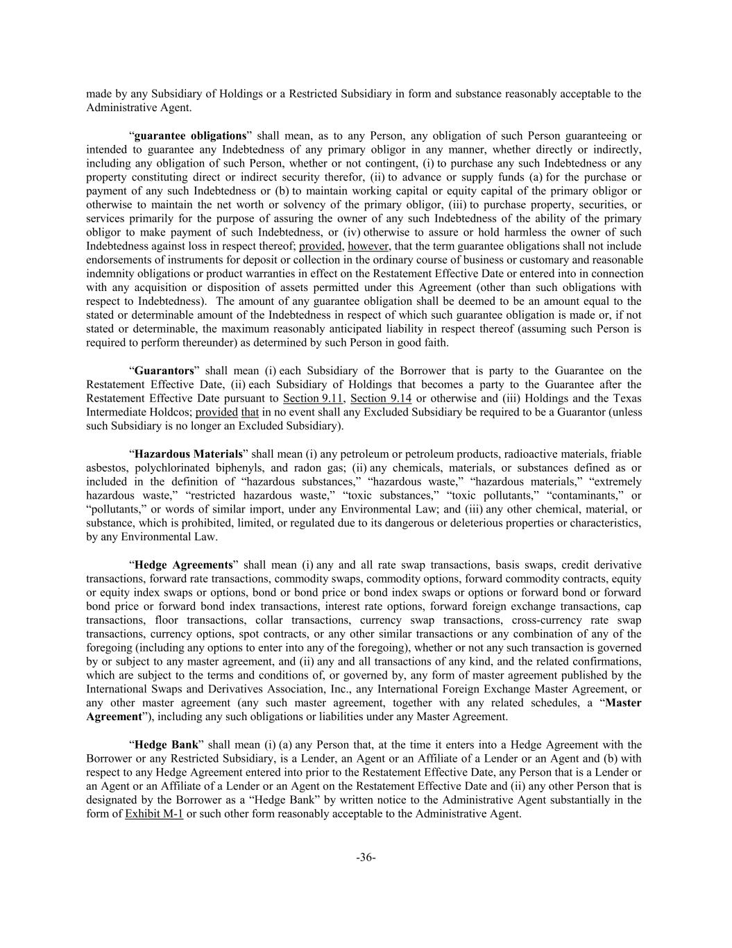 made by any Subsidiary of Holdings or a Restricted Subsidiary in form and substance reasonably acceptable to the Administrative Agent. “guarantee obligations” shall mean, as to any Person, any obligation of such Person guaranteeing or intended to guarantee any Indebtedness of any primary obligor in any manner, whether directly or indirectly, including any obligation of such Person, whether or not contingent, (i) to purchase any such Indebtedness or any property constituting direct or indirect security therefor, (ii) to advance or supply funds (a) for the purchase or payment of any such Indebtedness or (b) to maintain working capital or equity capital of the primary obligor or otherwise to maintain the net worth or solvency of the primary obligor, (iii) to purchase property, securities, or services primarily for the purpose of assuring the owner of any such Indebtedness of the ability of the primary obligor to make payment of such Indebtedness, or (iv) otherwise to assure or hold harmless the owner of such Indebtedness against loss in respect thereof; provided, however, that the term guarantee obligations shall not include endorsements of instruments for deposit or collection in the ordinary course of business or customary and reasonable indemnity obligations or product warranties in effect on the Restatement Effective Date or entered into in connection with any acquisition or disposition of assets permitted under this Agreement (other than such obligations with respect to Indebtedness). The amount of any guarantee obligation shall be deemed to be an amount equal to the stated or determinable amount of the Indebtedness in respect of which such guarantee obligation is made or, if not stated or determinable, the maximum reasonably anticipated liability in respect thereof (assuming such Person is required to perform thereunder) as determined by such Person in good faith. “Guarantors” shall mean (i) each Subsidiary of the Borrower that is party to the Guarantee on the Restatement Effective Date, (ii) each Subsidiary of Holdings that becomes a party to the Guarantee after the Restatement Effective Date pursuant to Section 9.11, Section 9.14 or otherwise and (iii) Holdings and the Texas Intermediate Holdcos; provided that in no event shall any Excluded Subsidiary be required to be a Guarantor (unless such Subsidiary is no longer an Excluded Subsidiary). “Hazardous Materials” shall mean (i) any petroleum or petroleum products, radioactive materials, friable asbestos, polychlorinated biphenyls, and radon gas; (ii) any chemicals, materials, or substances defined as or included in the definition of “hazardous substances,” “hazardous waste,” “hazardous materials,” “extremely hazardous waste,” “restricted hazardous waste,” “toxic substances,” “toxic pollutants,” “contaminants,” or “pollutants,” or words of similar import, under any Environmental Law; and (iii) any other chemical, material, or substance, which is prohibited, limited, or regulated due to its dangerous or deleterious properties or characteristics, by any Environmental Law. “Hedge Agreements” shall mean (i) any and all rate swap transactions, basis swaps, credit derivative transactions, forward rate transactions, commodity swaps, commodity options, forward commodity contracts, equity or equity index swaps or options, bond or bond price or bond index swaps or options or forward bond or forward bond price or forward bond index transactions, interest rate options, forward foreign exchange transactions, cap transactions, floor transactions, collar transactions, currency swap transactions, cross-currency rate swap transactions, currency options, spot contracts, or any other similar transactions or any combination of any of the foregoing (including any options to enter into any of the foregoing), whether or not any such transaction is governed by or subject to any master agreement, and (ii) any and all transactions of any kind, and the related confirmations, which are subject to the terms and conditions of, or governed by, any form of master agreement published by the International Swaps and Derivatives Association, Inc., any International Foreign Exchange Master Agreement, or any other master agreement (any such master agreement, together with any related schedules, a “Master Agreement”), including any such obligations or liabilities under any Master Agreement. “Hedge Bank” shall mean (i) (a) any Person that, at the time it enters into a Hedge Agreement with the Borrower or any Restricted Subsidiary, is a Lender, an Agent or an Affiliate of a Lender or an Agent and (b) with respect to any Hedge Agreement entered into prior to the Restatement Effective Date, any Person that is a Lender or an Agent or an Affiliate of a Lender or an Agent on the Restatement Effective Date and (ii) any other Person that is designated by the Borrower as a “Hedge Bank” by written notice to the Administrative Agent substantially in the form of Exhibit M-1 or such other form reasonably acceptable to the Administrative Agent. -36-