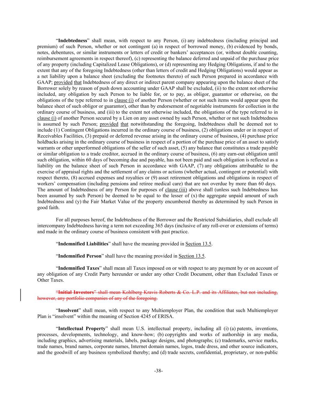 “Indebtedness” shall mean, with respect to any Person, (i) any indebtedness (including principal and premium) of such Person, whether or not contingent (a) in respect of borrowed money, (b) evidenced by bonds, notes, debentures, or similar instruments or letters of credit or bankers’ acceptances (or, without double counting, reimbursement agreements in respect thereof), (c) representing the balance deferred and unpaid of the purchase price of any property (including Capitalized Lease Obligations), or (d) representing any Hedging Obligations, if and to the extent that any of the foregoing Indebtedness (other than letters of credit and Hedging Obligations) would appear as a net liability upon a balance sheet (excluding the footnotes thereto) of such Person prepared in accordance with GAAP; provided that Indebtedness of any direct or indirect parent company appearing upon the balance sheet of the Borrower solely by reason of push down accounting under GAAP shall be excluded, (ii) to the extent not otherwise included, any obligation by such Person to be liable for, or to pay, as obligor, guarantor or otherwise, on the obligations of the type referred to in clause (i) of another Person (whether or not such items would appear upon the balance sheet of such obligor or guarantor), other than by endorsement of negotiable instruments for collection in the ordinary course of business, and (iii) to the extent not otherwise included, the obligations of the type referred to in clause (i) of another Person secured by a Lien on any asset owned by such Person, whether or not such Indebtedness is assumed by such Person; provided that notwithstanding the foregoing, Indebtedness shall be deemed not to include (1) Contingent Obligations incurred in the ordinary course of business, (2) obligations under or in respect of Receivables Facilities, (3) prepaid or deferred revenue arising in the ordinary course of business, (4) purchase price holdbacks arising in the ordinary course of business in respect of a portion of the purchase price of an asset to satisfy warrants or other unperformed obligations of the seller of such asset, (5) any balance that constitutes a trade payable or similar obligation to a trade creditor, accrued in the ordinary course of business, (6) any earn-out obligation until such obligation, within 60 days of becoming due and payable, has not been paid and such obligation is reflected as a liability on the balance sheet of such Person in accordance with GAAP, (7) any obligations attributable to the exercise of appraisal rights and the settlement of any claims or actions (whether actual, contingent or potential) with respect thereto, (8) accrued expenses and royalties or (9) asset retirement obligations and obligations in respect of workers’ compensation (including pensions and retiree medical care) that are not overdue by more than 60 days. The amount of Indebtedness of any Person for purposes of clause (iii) above shall (unless such Indebtedness has been assumed by such Person) be deemed to be equal to the lesser of (x) the aggregate unpaid amount of such Indebtedness and (y) the Fair Market Value of the property encumbered thereby as determined by such Person in good faith. For all purposes hereof, the Indebtedness of the Borrower and the Restricted Subsidiaries, shall exclude all intercompany Indebtedness having a term not exceeding 365 days (inclusive of any roll-over or extensions of terms) and made in the ordinary course of business consistent with past practice. “Indemnified Liabilities” shall have the meaning provided in Section 13.5. “Indemnified Person” shall have the meaning provided in Section 13.5. “Indemnified Taxes” shall mean all Taxes imposed on or with respect to any payment by or on account of any obligation of any Credit Party hereunder or under any other Credit Document, other than Excluded Taxes or Other Taxes. “Initial Investors” shall mean Kohlberg Kravis Roberts & Co. L.P. and its Affiliates, but not including, however, any portfolio companies of any of the foregoing. “Insolvent” shall mean, with respect to any Multiemployer Plan, the condition that such Multiemployer Plan is “insolvent” within the meaning of Section 4245 of ERISA. “Intellectual Property” shall mean U.S. intellectual property, including all (i) (a) patents, inventions, processes, developments, technology, and know-how; (b) copyrights and works of authorship in any media, including graphics, advertising materials, labels, package designs, and photographs; (c) trademarks, service marks, trade names, brand names, corporate names, Internet domain names, logos, trade dress, and other source indicators, and the goodwill of any business symbolized thereby; and (d) trade secrets, confidential, proprietary, or non-public -38-