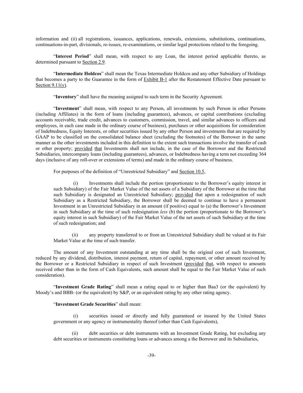 information and (ii) all registrations, issuances, applications, renewals, extensions, substitutions, continuations, continuations-in-part, divisionals, re-issues, re-examinations, or similar legal protections related to the foregoing. “Interest Period” shall mean, with respect to any Loan, the interest period applicable thereto, as determined pursuant to Section 2.9. “Intermediate Holdcos” shall mean the Texas Intermediate Holdcos and any other Subsidiary of Holdings that becomes a party to the Guarantee in the form of Exhibit B-1 after the Restatement Effective Date pursuant to Section 9.11(y). “Inventory” shall have the meaning assigned to such term in the Security Agreement. “Investment” shall mean, with respect to any Person, all investments by such Person in other Persons (including Affiliates) in the form of loans (including guarantees), advances, or capital contributions (excluding accounts receivable, trade credit, advances to customers, commission, travel, and similar advances to officers and employees, in each case made in the ordinary course of business), purchases or other acquisitions for consideration of Indebtedness, Equity Interests, or other securities issued by any other Person and investments that are required by GAAP to be classified on the consolidated balance sheet (excluding the footnotes) of the Borrower in the same manner as the other investments included in this definition to the extent such transactions involve the transfer of cash or other property; provided that Investments shall not include, in the case of the Borrower and the Restricted Subsidiaries, intercompany loans (including guarantees), advances, or Indebtedness having a term not exceeding 364 days (inclusive of any roll-over or extensions of terms) and made in the ordinary course of business. For purposes of the definition of “Unrestricted Subsidiary” and Section 10.5, (i) Investments shall include the portion (proportionate to the Borrower’s equity interest in such Subsidiary) of the Fair Market Value of the net assets of a Subsidiary of the Borrower at the time that such Subsidiary is designated an Unrestricted Subsidiary; provided that upon a redesignation of such Subsidiary as a Restricted Subsidiary, the Borrower shall be deemed to continue to have a permanent Investment in an Unrestricted Subsidiary in an amount (if positive) equal to (a) the Borrower’s Investment in such Subsidiary at the time of such redesignation less (b) the portion (proportionate to the Borrower’s equity interest in such Subsidiary) of the Fair Market Value of the net assets of such Subsidiary at the time of such redesignation; and (ii) any property transferred to or from an Unrestricted Subsidiary shall be valued at its Fair Market Value at the time of such transfer. The amount of any Investment outstanding at any time shall be the original cost of such Investment, reduced by any dividend, distribution, interest payment, return of capital, repayment, or other amount received by the Borrower or a Restricted Subsidiary in respect of such Investment (provided that, with respect to amounts received other than in the form of Cash Equivalents, such amount shall be equal to the Fair Market Value of such consideration). “Investment Grade Rating” shall mean a rating equal to or higher than Baa3 (or the equivalent) by Moody’s and BBB- (or the equivalent) by S&P, or an equivalent rating by any other rating agency. “Investment Grade Securities” shall mean: (i) securities issued or directly and fully guaranteed or insured by the United States government or any agency or instrumentality thereof (other than Cash Equivalents), (ii) debt securities or debt instruments with an Investment Grade Rating, but excluding any debt securities or instruments constituting loans or advances among a the Borrower and its Subsidiaries, -39-