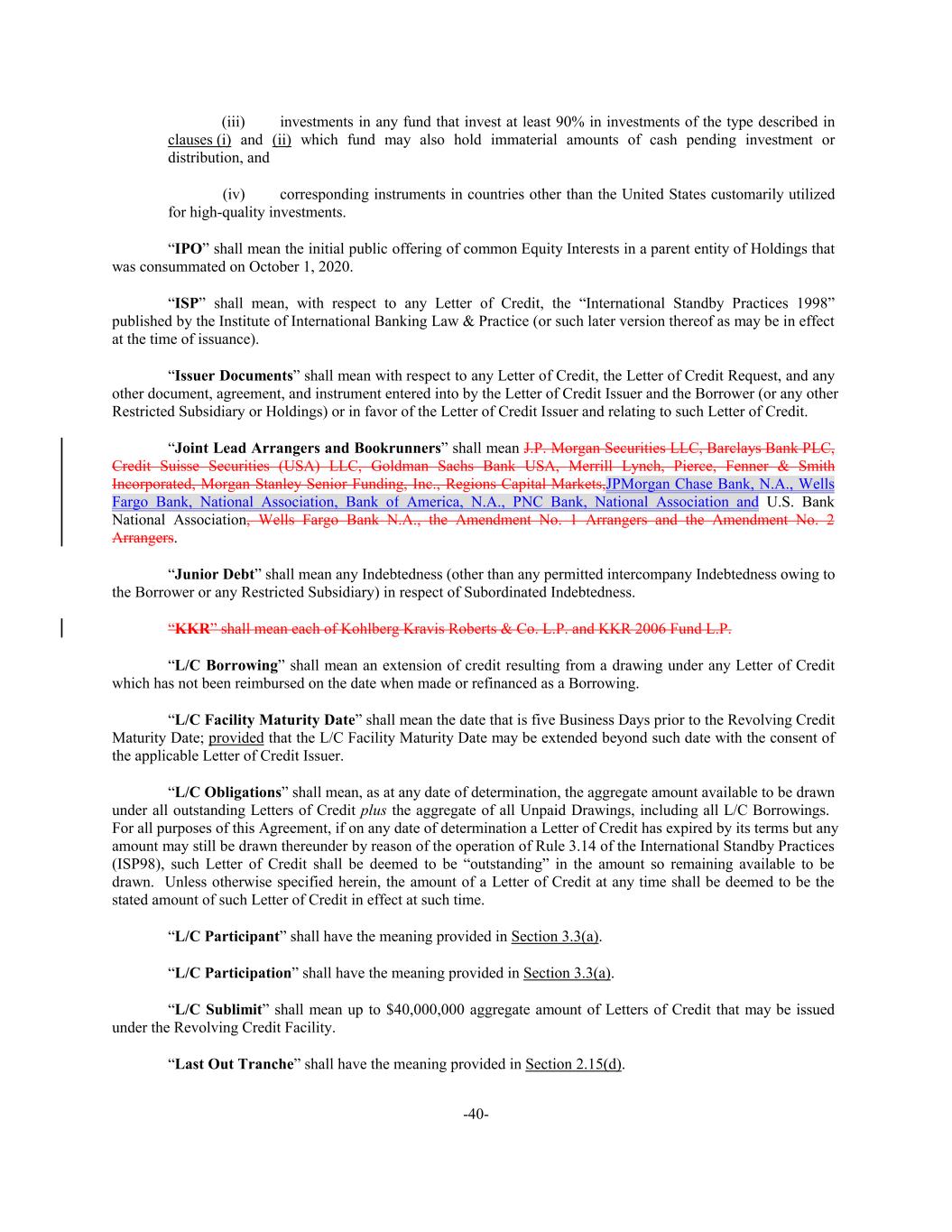 (iii) investments in any fund that invest at least 90% in investments of the type described in clauses (i) and (ii) which fund may also hold immaterial amounts of cash pending investment or distribution, and (iv) corresponding instruments in countries other than the United States customarily utilized for high-quality investments. “IPO” shall mean the initial public offering of common Equity Interests in a parent entity of Holdings that was consummated on October 1, 2020. “ISP” shall mean, with respect to any Letter of Credit, the “International Standby Practices 1998” published by the Institute of International Banking Law & Practice (or such later version thereof as may be in effect at the time of issuance). “Issuer Documents” shall mean with respect to any Letter of Credit, the Letter of Credit Request, and any other document, agreement, and instrument entered into by the Letter of Credit Issuer and the Borrower (or any other Restricted Subsidiary or Holdings) or in favor of the Letter of Credit Issuer and relating to such Letter of Credit. “Joint Lead Arrangers and Bookrunners” shall mean J.P. Morgan Securities LLC, Barclays Bank PLC, Credit Suisse Securities (USA) LLC, Goldman Sachs Bank USA, Merrill Lynch, Pierce, Fenner & Smith Incorporated, Morgan Stanley Senior Funding, Inc., Regions Capital Markets,JPMorgan Chase Bank, N.A., Wells Fargo Bank, National Association, Bank of America, N.A., PNC Bank, National Association and U.S. Bank National Association, Wells Fargo Bank N.A., the Amendment No. 1 Arrangers and the Amendment No. 2 Arrangers. “Junior Debt” shall mean any Indebtedness (other than any permitted intercompany Indebtedness owing to the Borrower or any Restricted Subsidiary) in respect of Subordinated Indebtedness. “KKR” shall mean each of Kohlberg Kravis Roberts & Co. L.P. and KKR 2006 Fund L.P. “L/C Borrowing” shall mean an extension of credit resulting from a drawing under any Letter of Credit which has not been reimbursed on the date when made or refinanced as a Borrowing. “L/C Facility Maturity Date” shall mean the date that is five Business Days prior to the Revolving Credit Maturity Date; provided that the L/C Facility Maturity Date may be extended beyond such date with the consent of the applicable Letter of Credit Issuer. “L/C Obligations” shall mean, as at any date of determination, the aggregate amount available to be drawn under all outstanding Letters of Credit plus the aggregate of all Unpaid Drawings, including all L/C Borrowings. For all purposes of this Agreement, if on any date of determination a Letter of Credit has expired by its terms but any amount may still be drawn thereunder by reason of the operation of Rule 3.14 of the International Standby Practices (ISP98), such Letter of Credit shall be deemed to be “outstanding” in the amount so remaining available to be drawn. Unless otherwise specified herein, the amount of a Letter of Credit at any time shall be deemed to be the stated amount of such Letter of Credit in effect at such time. “L/C Participant” shall have the meaning provided in Section 3.3(a). “L/C Participation” shall have the meaning provided in Section 3.3(a). “L/C Sublimit” shall mean up to $40,000,000 aggregate amount of Letters of Credit that may be issued under the Revolving Credit Facility. “Last Out Tranche” shall have the meaning provided in Section 2.15(d). -40-