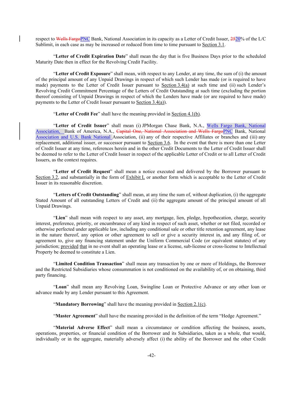 respect to Wells FargoPNC Bank, National Association in its capacity as a Letter of Credit Issuer, 2520% of the L/C Sublimit, in each case as may be increased or reduced from time to time pursuant to Section 3.1. “Letter of Credit Expiration Date” shall mean the day that is five Business Days prior to the scheduled Maturity Date then in effect for the Revolving Credit Facility. “Letter of Credit Exposure” shall mean, with respect to any Lender, at any time, the sum of (i) the amount of the principal amount of any Unpaid Drawings in respect of which such Lender has made (or is required to have made) payments to the Letter of Credit Issuer pursuant to Section 3.4(a) at such time and (ii) such Lender’s Revolving Credit Commitment Percentage of the Letters of Credit Outstanding at such time (excluding the portion thereof consisting of Unpaid Drawings in respect of which the Lenders have made (or are required to have made) payments to the Letter of Credit Issuer pursuant to Section 3.4(a)). “Letter of Credit Fee” shall have the meaning provided in Section 4.1(b). “Letter of Credit Issuer” shall mean (i) JPMorgan Chase Bank, N.A., Wells Fargo Bank, National Association, Bank of America, N.A., Capital One, National Association and Wells FargoPNC Bank, National Association and U.S. Bank National Association, (ii) any of their respective Affiliates or branches and (iii) any replacement, additional issuer, or successor pursuant to Section 3.6. In the event that there is more than one Letter of Credit Issuer at any time, references herein and in the other Credit Documents to the Letter of Credit Issuer shall be deemed to refer to the Letter of Credit Issuer in respect of the applicable Letter of Credit or to all Letter of Credit Issuers, as the context requires. “Letter of Credit Request” shall mean a notice executed and delivered by the Borrower pursuant to Section 3.2, and substantially in the form of Exhibit L or another form which is acceptable to the Letter of Credit Issuer in its reasonable discretion. “Letters of Credit Outstanding” shall mean, at any time the sum of, without duplication, (i) the aggregate Stated Amount of all outstanding Letters of Credit and (ii) the aggregate amount of the principal amount of all Unpaid Drawings. “Lien” shall mean with respect to any asset, any mortgage, lien, pledge, hypothecation, charge, security interest, preference, priority, or encumbrance of any kind in respect of such asset, whether or not filed, recorded or otherwise perfected under applicable law, including any conditional sale or other title retention agreement, any lease in the nature thereof, any option or other agreement to sell or give a security interest in, and any filing of, or agreement to, give any financing statement under the Uniform Commercial Code (or equivalent statutes) of any jurisdiction; provided that in no event shall an operating lease or a license, sub-license or cross-license to Intellectual Property be deemed to constitute a Lien. “Limited Condition Transaction” shall mean any transaction by one or more of Holdings, the Borrower and the Restricted Subsidiaries whose consummation is not conditioned on the availability of, or on obtaining, third party financing. “Loan” shall mean any Revolving Loan, Swingline Loan or Protective Advance or any other loan or advance made by any Lender pursuant to this Agreement. “Mandatory Borrowing” shall have the meaning provided in Section 2.1(c). “Master Agreement” shall have the meaning provided in the definition of the term “Hedge Agreement.” “Material Adverse Effect” shall mean a circumstance or condition affecting the business, assets, operations, properties, or financial condition of the Borrower and its Subsidiaries, taken as a whole, that would, individually or in the aggregate, materially adversely affect (i) the ability of the Borrower and the other Credit -42-