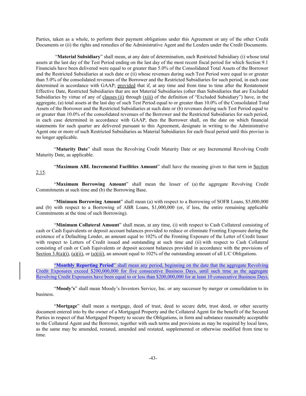 Parties, taken as a whole, to perform their payment obligations under this Agreement or any of the other Credit Documents or (ii) the rights and remedies of the Administrative Agent and the Lenders under the Credit Documents. “Material Subsidiary” shall mean, at any date of determination, each Restricted Subsidiary (i) whose total assets at the last day of the Test Period ending on the last day of the most recent fiscal period for which Section 9.1 Financials have been delivered were equal to or greater than 5.0% of the Consolidated Total Assets of the Borrower and the Restricted Subsidiaries at such date or (ii) whose revenues during such Test Period were equal to or greater than 5.0% of the consolidated revenues of the Borrower and the Restricted Subsidiaries for such period, in each case determined in accordance with GAAP; provided that if, at any time and from time to time after the Restatement Effective Date, Restricted Subsidiaries that are not Material Subsidiaries (other than Subsidiaries that are Excluded Subsidiaries by virtue of any of clauses (ii) through (xiii) of the definition of “Excluded Subsidiary”) have, in the aggregate, (a) total assets at the last day of such Test Period equal to or greater than 10.0% of the Consolidated Total Assets of the Borrower and the Restricted Subsidiaries at such date or (b) revenues during such Test Period equal to or greater than 10.0% of the consolidated revenues of the Borrower and the Restricted Subsidiaries for such period, in each case determined in accordance with GAAP, then the Borrower shall, on the date on which financial statements for such quarter are delivered pursuant to this Agreement, designate in writing to the Administrative Agent one or more of such Restricted Subsidiaries as Material Subsidiaries for each fiscal period until this proviso is no longer applicable. “Maturity Date” shall mean the Revolving Credit Maturity Date or any Incremental Revolving Credit Maturity Date, as applicable. “Maximum ABL Incremental Facilities Amount” shall have the meaning given to that term in Section 2.15. “Maximum Borrowing Amount” shall mean the lesser of (a) the aggregate Revolving Credit Commitments at such time and (b) the Borrowing Base. “Minimum Borrowing Amount” shall mean (a) with respect to a Borrowing of SOFR Loans, $5,000,000 and (b) with respect to a Borrowing of ABR Loans, $1,000,000 (or, if less, the entire remaining applicable Commitments at the time of such Borrowing). “Minimum Collateral Amount” shall mean, at any time, (i) with respect to Cash Collateral consisting of cash or Cash Equivalents or deposit account balances provided to reduce or eliminate Fronting Exposure during the existence of a Defaulting Lender, an amount equal to 102% of the Fronting Exposure of the Letter of Credit Issuer with respect to Letters of Credit issued and outstanding at such time and (ii) with respect to Cash Collateral consisting of cash or Cash Equivalents or deposit account balances provided in accordance with the provisions of Section 3.8(a)(i), (a)(ii), or (a)(iii), an amount equal to 102% of the outstanding amount of all L/C Obligations. “Monthly Reporting Period” shall mean any period, beginning on the date that the aggregate Revolving Credit Exposures exceed $200,000,000 for five consecutive Business Days, until such time as the aggregate Revolving Credit Exposures have been equal to or less than $200,000,000 for at least 10 consecutive Business Days. “Moody’s” shall mean Moody’s Investors Service, Inc. or any successor by merger or consolidation to its business. “Mortgage” shall mean a mortgage, deed of trust, deed to secure debt, trust deed, or other security document entered into by the owner of a Mortgaged Property and the Collateral Agent for the benefit of the Secured Parties in respect of that Mortgaged Property to secure the Obligations, in form and substance reasonably acceptable to the Collateral Agent and the Borrower, together with such terms and provisions as may be required by local laws, as the same may be amended, restated, amended and restated, supplemented or otherwise modified from time to time. -43-