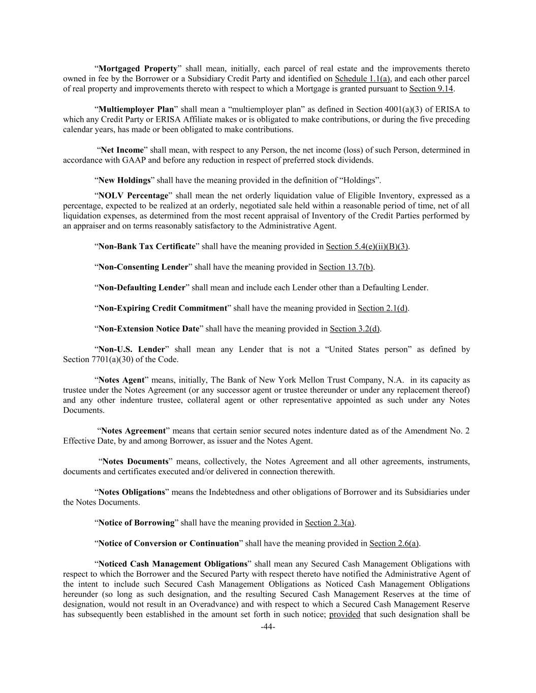 “Mortgaged Property” shall mean, initially, each parcel of real estate and the improvements thereto owned in fee by the Borrower or a Subsidiary Credit Party and identified on Schedule 1.1(a), and each other parcel of real property and improvements thereto with respect to which a Mortgage is granted pursuant to Section 9.14. “Multiemployer Plan” shall mean a “multiemployer plan” as defined in Section 4001(a)(3) of ERISA to which any Credit Party or ERISA Affiliate makes or is obligated to make contributions, or during the five preceding calendar years, has made or been obligated to make contributions. “Net Income” shall mean, with respect to any Person, the net income (loss) of such Person, determined in accordance with GAAP and before any reduction in respect of preferred stock dividends. “New Holdings” shall have the meaning provided in the definition of “Holdings”. “NOLV Percentage” shall mean the net orderly liquidation value of Eligible Inventory, expressed as a percentage, expected to be realized at an orderly, negotiated sale held within a reasonable period of time, net of all liquidation expenses, as determined from the most recent appraisal of Inventory of the Credit Parties performed by an appraiser and on terms reasonably satisfactory to the Administrative Agent. “Non-Bank Tax Certificate” shall have the meaning provided in Section 5.4(e)(ii)(B)(3). “Non-Consenting Lender” shall have the meaning provided in Section 13.7(b). “Non-Defaulting Lender” shall mean and include each Lender other than a Defaulting Lender. “Non-Expiring Credit Commitment” shall have the meaning provided in Section 2.1(d). “Non-Extension Notice Date” shall have the meaning provided in Section 3.2(d). “Non-U.S. Lender” shall mean any Lender that is not a “United States person” as defined by Section 7701(a)(30) of the Code. “Notes Agent” means, initially, The Bank of New York Mellon Trust Company, N.A. in its capacity as trustee under the Notes Agreement (or any successor agent or trustee thereunder or under any replacement thereof) and any other indenture trustee, collateral agent or other representative appointed as such under any Notes Documents. “Notes Agreement” means that certain senior secured notes indenture dated as of the Amendment No. 2 Effective Date, by and among Borrower, as issuer and the Notes Agent. “Notes Documents” means, collectively, the Notes Agreement and all other agreements, instruments, documents and certificates executed and/or delivered in connection therewith. “Notes Obligations” means the Indebtedness and other obligations of Borrower and its Subsidiaries under the Notes Documents. “Notice of Borrowing” shall have the meaning provided in Section 2.3(a). “Notice of Conversion or Continuation” shall have the meaning provided in Section 2.6(a). “Noticed Cash Management Obligations” shall mean any Secured Cash Management Obligations with respect to which the Borrower and the Secured Party with respect thereto have notified the Administrative Agent of the intent to include such Secured Cash Management Obligations as Noticed Cash Management Obligations hereunder (so long as such designation, and the resulting Secured Cash Management Reserves at the time of designation, would not result in an Overadvance) and with respect to which a Secured Cash Management Reserve has subsequently been established in the amount set forth in such notice; provided that such designation shall be -44-