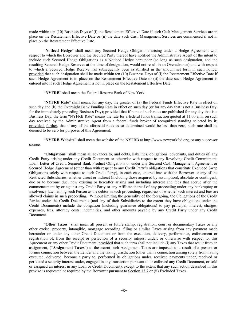 made within ten (10) Business Days of (i) the Restatement Effective Date if such Cash Management Services are in place on the Restatement Effective Date or (ii) the date such Cash Management Services are commenced if not in place on the Restatement Effective Date. “Noticed Hedge” shall mean any Secured Hedge Obligations arising under a Hedge Agreement with respect to which the Borrower and the Secured Party thereof have notified the Administrative Agent of the intent to include such Secured Hedge Obligations as a Noticed Hedge hereunder (so long as such designation, and the resulting Secured Hedge Reserves at the time of designation, would not result in an Overadvance) and with respect to which a Secured Hedge Reserve has subsequently been established in the amount set forth in such notice; provided that such designation shall be made within ten (10) Business Days of (i) the Restatement Effective Date if such Hedge Agreement is in place on the Restatement Effective Date or (ii) the date such Hedge Agreement is entered into if such Hedge Agreement is not in place on the Restatement Effective Date. “NYFRB” shall mean the Federal Reserve Bank of New York. “NYFRB Rate” shall mean, for any day, the greater of (a) the Federal Funds Effective Rate in effect on such day and (b) the Overnight Bank Funding Rate in effect on such day (or for any day that is not a Business Day, for the immediately preceding Business Day); provided that if none of such rates are published for any day that is a Business Day, the term “NYFRB Rate” means the rate for a federal funds transaction quoted at 11:00 a.m. on such day received by the Administrative Agent from a federal funds broker of recognized standing selected by it; provided, further, that if any of the aforesaid rates as so determined would be less than zero, such rate shall be deemed to be zero for purposes of this Agreement. “NYFRB Website” shall mean the website of the NYFRB at http://www.newyorkfed.org, or any successor source. “Obligations” shall mean all advances to, and debts, liabilities, obligations, covenants, and duties of, any Credit Party arising under any Credit Document or otherwise with respect to any Revolving Credit Commitment, Loan, Letter of Credit, Secured Bank Product Obligations or under any Secured Cash Management Agreement or Secured Hedge Agreement (other than with respect to any Credit Party’s obligations that constitute Excluded Swap Obligations solely with respect to such Credit Party), in each case, entered into with the Borrower or any of the Restricted Subsidiaries, whether direct or indirect (including those acquired by assumption), absolute or contingent, due or to become due, now existing or hereafter arising and including interest and fees that accrue after the commencement by or against any Credit Party or any Affiliate thereof of any proceeding under any bankruptcy or insolvency law naming such Person as the debtor in such proceeding, regardless of whether such interest and fees are allowed claims in such proceeding. Without limiting the generality of the foregoing, the Obligations of the Credit Parties under the Credit Documents (and any of their Subsidiaries to the extent they have obligations under the Credit Documents) include the obligation (including guarantee obligations) to pay principal, interest, charges, expenses, fees, attorney costs, indemnities, and other amounts payable by any Credit Party under any Credit Document. “Other Taxes” shall mean all present or future stamp, registration, court or documentary Taxes or any other excise, property, intangible, mortgage recording, filing or similar Taxes arising from any payment made hereunder or under any other Credit Document or from the execution, delivery, performance, enforcement or registration of, from the receipt or perfection of a security interest under, or otherwise with respect to, this Agreement or any other Credit Document; provided that such term shall not include (i) any Taxes that result from an assignment, (“Assignment Taxes”) to the extent such Assignment Taxes are imposed as a result of a present or former connection between the Lender and the taxing jurisdiction (other than a connection arising solely from having executed, delivered, become a party to, performed its obligations under, received payments under, received or perfected a security interest under, engaged in any transaction pursuant to or enforced any Credit Document, or sold or assigned an interest in any Loan or Credit Document), except to the extent that any such action described in this proviso is requested or required by the Borrower pursuant to Section 13.7 or (ii) Excluded Taxes. -45-