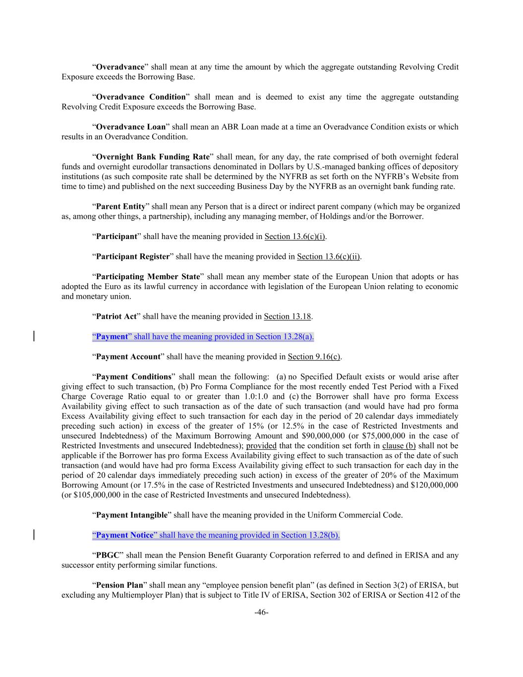 “Overadvance” shall mean at any time the amount by which the aggregate outstanding Revolving Credit Exposure exceeds the Borrowing Base. “Overadvance Condition” shall mean and is deemed to exist any time the aggregate outstanding Revolving Credit Exposure exceeds the Borrowing Base. “Overadvance Loan” shall mean an ABR Loan made at a time an Overadvance Condition exists or which results in an Overadvance Condition. “Overnight Bank Funding Rate” shall mean, for any day, the rate comprised of both overnight federal funds and overnight eurodollar transactions denominated in Dollars by U.S.-managed banking offices of depository institutions (as such composite rate shall be determined by the NYFRB as set forth on the NYFRB’s Website from time to time) and published on the next succeeding Business Day by the NYFRB as an overnight bank funding rate. “Parent Entity” shall mean any Person that is a direct or indirect parent company (which may be organized as, among other things, a partnership), including any managing member, of Holdings and/or the Borrower. “Participant” shall have the meaning provided in Section 13.6(c)(i). “Participant Register” shall have the meaning provided in Section 13.6(c)(ii). “Participating Member State” shall mean any member state of the European Union that adopts or has adopted the Euro as its lawful currency in accordance with legislation of the European Union relating to economic and monetary union. “Patriot Act” shall have the meaning provided in Section 13.18. “Payment” shall have the meaning provided in Section 13.28(a). “Payment Account” shall have the meaning provided in Section 9.16(c). “Payment Conditions” shall mean the following: (a) no Specified Default exists or would arise after giving effect to such transaction, (b) Pro Forma Compliance for the most recently ended Test Period with a Fixed Charge Coverage Ratio equal to or greater than 1.0:1.0 and (c) the Borrower shall have pro forma Excess Availability giving effect to such transaction as of the date of such transaction (and would have had pro forma Excess Availability giving effect to such transaction for each day in the period of 20 calendar days immediately preceding such action) in excess of the greater of 15% (or 12.5% in the case of Restricted Investments and unsecured Indebtedness) of the Maximum Borrowing Amount and $90,000,000 (or $75,000,000 in the case of Restricted Investments and unsecured Indebtedness); provided that the condition set forth in clause (b) shall not be applicable if the Borrower has pro forma Excess Availability giving effect to such transaction as of the date of such transaction (and would have had pro forma Excess Availability giving effect to such transaction for each day in the period of 20 calendar days immediately preceding such action) in excess of the greater of 20% of the Maximum Borrowing Amount (or 17.5% in the case of Restricted Investments and unsecured Indebtedness) and $120,000,000 (or $105,000,000 in the case of Restricted Investments and unsecured Indebtedness). “Payment Intangible” shall have the meaning provided in the Uniform Commercial Code. “Payment Notice” shall have the meaning provided in Section 13.28(b). “PBGC” shall mean the Pension Benefit Guaranty Corporation referred to and defined in ERISA and any successor entity performing similar functions. “Pension Plan” shall mean any “employee pension benefit plan” (as defined in Section 3(2) of ERISA, but excluding any Multiemployer Plan) that is subject to Title IV of ERISA, Section 302 of ERISA or Section 412 of the -46-