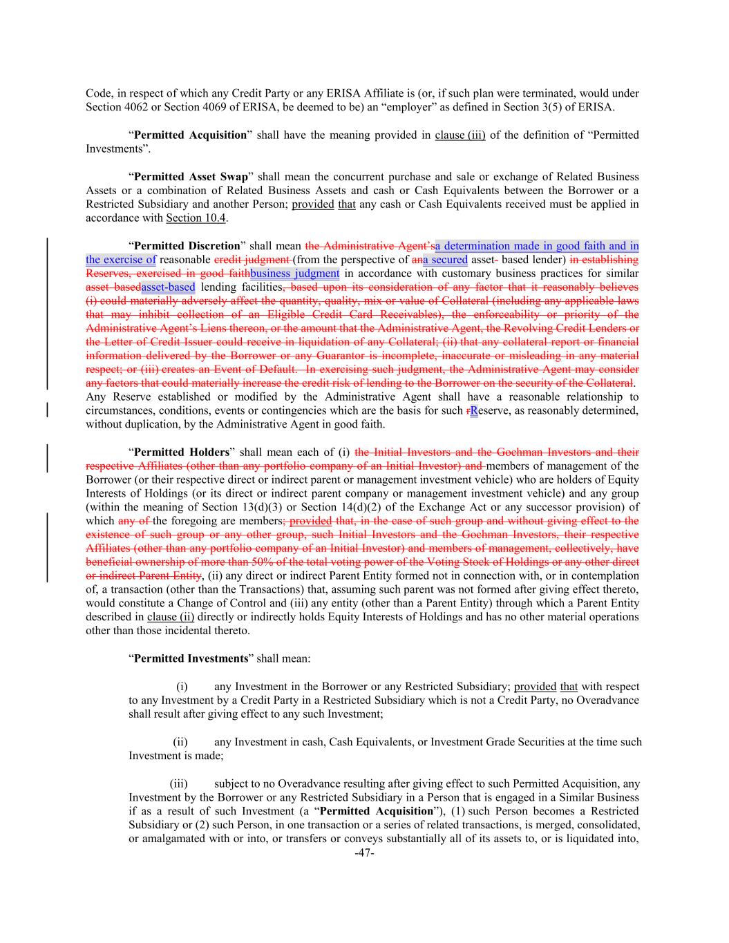 Code, in respect of which any Credit Party or any ERISA Affiliate is (or, if such plan were terminated, would under Section 4062 or Section 4069 of ERISA, be deemed to be) an “employer” as defined in Section 3(5) of ERISA. “Permitted Acquisition” shall have the meaning provided in clause (iii) of the definition of “Permitted Investments”. “Permitted Asset Swap” shall mean the concurrent purchase and sale or exchange of Related Business Assets or a combination of Related Business Assets and cash or Cash Equivalents between the Borrower or a Restricted Subsidiary and another Person; provided that any cash or Cash Equivalents received must be applied in accordance with Section 10.4. “Permitted Discretion” shall mean the Administrative Agent’sa determination made in good faith and in the exercise of reasonable credit judgment (from the perspective of ana secured asset- based lender) in establishing Reserves, exercised in good faithbusiness judgment in accordance with customary business practices for similar asset basedasset-based lending facilities, based upon its consideration of any factor that it reasonably believes (i) could materially adversely affect the quantity, quality, mix or value of Collateral (including any applicable laws that may inhibit collection of an Eligible Credit Card Receivables), the enforceability or priority of the Administrative Agent’s Liens thereon, or the amount that the Administrative Agent, the Revolving Credit Lenders or the Letter of Credit Issuer could receive in liquidation of any Collateral; (ii) that any collateral report or financial information delivered by the Borrower or any Guarantor is incomplete, inaccurate or misleading in any material respect; or (iii) creates an Event of Default. In exercising such judgment, the Administrative Agent may consider any factors that could materially increase the credit risk of lending to the Borrower on the security of the Collateral. Any Reserve established or modified by the Administrative Agent shall have a reasonable relationship to circumstances, conditions, events or contingencies which are the basis for such rReserve, as reasonably determined, without duplication, by the Administrative Agent in good faith. “Permitted Holders” shall mean each of (i) the Initial Investors and the Gochman Investors and their respective Affiliates (other than any portfolio company of an Initial Investor) and members of management of the Borrower (or their respective direct or indirect parent or management investment vehicle) who are holders of Equity Interests of Holdings (or its direct or indirect parent company or management investment vehicle) and any group (within the meaning of Section 13(d)(3) or Section 14(d)(2) of the Exchange Act or any successor provision) of which any of the foregoing are members; provided that, in the case of such group and without giving effect to the existence of such group or any other group, such Initial Investors and the Gochman Investors, their respective Affiliates (other than any portfolio company of an Initial Investor) and members of management, collectively, have beneficial ownership of more than 50% of the total voting power of the Voting Stock of Holdings or any other direct or indirect Parent Entity, (ii) any direct or indirect Parent Entity formed not in connection with, or in contemplation of, a transaction (other than the Transactions) that, assuming such parent was not formed after giving effect thereto, would constitute a Change of Control and (iii) any entity (other than a Parent Entity) through which a Parent Entity described in clause (ii) directly or indirectly holds Equity Interests of Holdings and has no other material operations other than those incidental thereto. “Permitted Investments” shall mean: (i) any Investment in the Borrower or any Restricted Subsidiary; provided that with respect to any Investment by a Credit Party in a Restricted Subsidiary which is not a Credit Party, no Overadvance shall result after giving effect to any such Investment; (ii) any Investment in cash, Cash Equivalents, or Investment Grade Securities at the time such Investment is made; (iii) subject to no Overadvance resulting after giving effect to such Permitted Acquisition, any Investment by the Borrower or any Restricted Subsidiary in a Person that is engaged in a Similar Business if as a result of such Investment (a “Permitted Acquisition”), (1) such Person becomes a Restricted Subsidiary or (2) such Person, in one transaction or a series of related transactions, is merged, consolidated, or amalgamated with or into, or transfers or conveys substantially all of its assets to, or is liquidated into, -47-