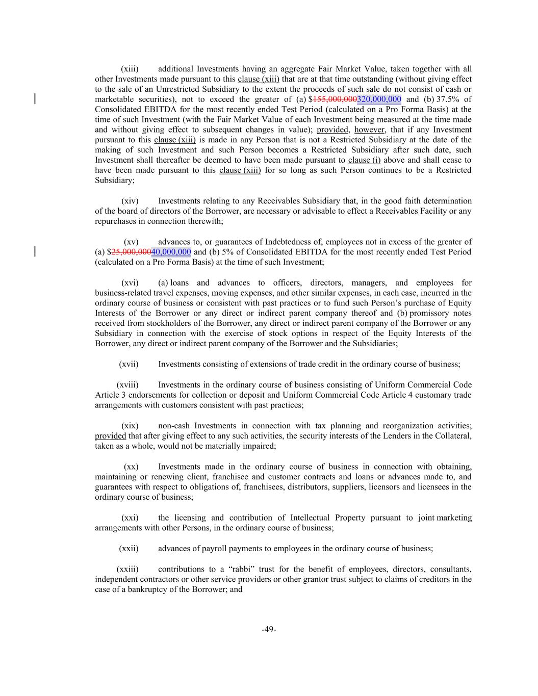 (xiii) additional Investments having an aggregate Fair Market Value, taken together with all other Investments made pursuant to this clause (xiii) that are at that time outstanding (without giving effect to the sale of an Unrestricted Subsidiary to the extent the proceeds of such sale do not consist of cash or marketable securities), not to exceed the greater of (a) $155,000,000320,000,000 and (b) 37.5% of Consolidated EBITDA for the most recently ended Test Period (calculated on a Pro Forma Basis) at the time of such Investment (with the Fair Market Value of each Investment being measured at the time made and without giving effect to subsequent changes in value); provided, however, that if any Investment pursuant to this clause (xiii) is made in any Person that is not a Restricted Subsidiary at the date of the making of such Investment and such Person becomes a Restricted Subsidiary after such date, such Investment shall thereafter be deemed to have been made pursuant to clause (i) above and shall cease to have been made pursuant to this clause (xiii) for so long as such Person continues to be a Restricted Subsidiary; (xiv) Investments relating to any Receivables Subsidiary that, in the good faith determination of the board of directors of the Borrower, are necessary or advisable to effect a Receivables Facility or any repurchases in connection therewith; (xv) advances to, or guarantees of Indebtedness of, employees not in excess of the greater of (a) $25,000,00040,000,000 and (b) 5% of Consolidated EBITDA for the most recently ended Test Period (calculated on a Pro Forma Basis) at the time of such Investment; (xvi) (a) loans and advances to officers, directors, managers, and employees for business-related travel expenses, moving expenses, and other similar expenses, in each case, incurred in the ordinary course of business or consistent with past practices or to fund such Person’s purchase of Equity Interests of the Borrower or any direct or indirect parent company thereof and (b) promissory notes received from stockholders of the Borrower, any direct or indirect parent company of the Borrower or any Subsidiary in connection with the exercise of stock options in respect of the Equity Interests of the Borrower, any direct or indirect parent company of the Borrower and the Subsidiaries; (xvii) Investments consisting of extensions of trade credit in the ordinary course of business; (xviii) Investments in the ordinary course of business consisting of Uniform Commercial Code Article 3 endorsements for collection or deposit and Uniform Commercial Code Article 4 customary trade arrangements with customers consistent with past practices; (xix) non-cash Investments in connection with tax planning and reorganization activities; provided that after giving effect to any such activities, the security interests of the Lenders in the Collateral, taken as a whole, would not be materially impaired; (xx) Investments made in the ordinary course of business in connection with obtaining, maintaining or renewing client, franchisee and customer contracts and loans or advances made to, and guarantees with respect to obligations of, franchisees, distributors, suppliers, licensors and licensees in the ordinary course of business; (xxi) the licensing and contribution of Intellectual Property pursuant to joint marketing arrangements with other Persons, in the ordinary course of business; (xxii) advances of payroll payments to employees in the ordinary course of business; (xxiii) contributions to a “rabbi” trust for the benefit of employees, directors, consultants, independent contractors or other service providers or other grantor trust subject to claims of creditors in the case of a bankruptcy of the Borrower; and -49-