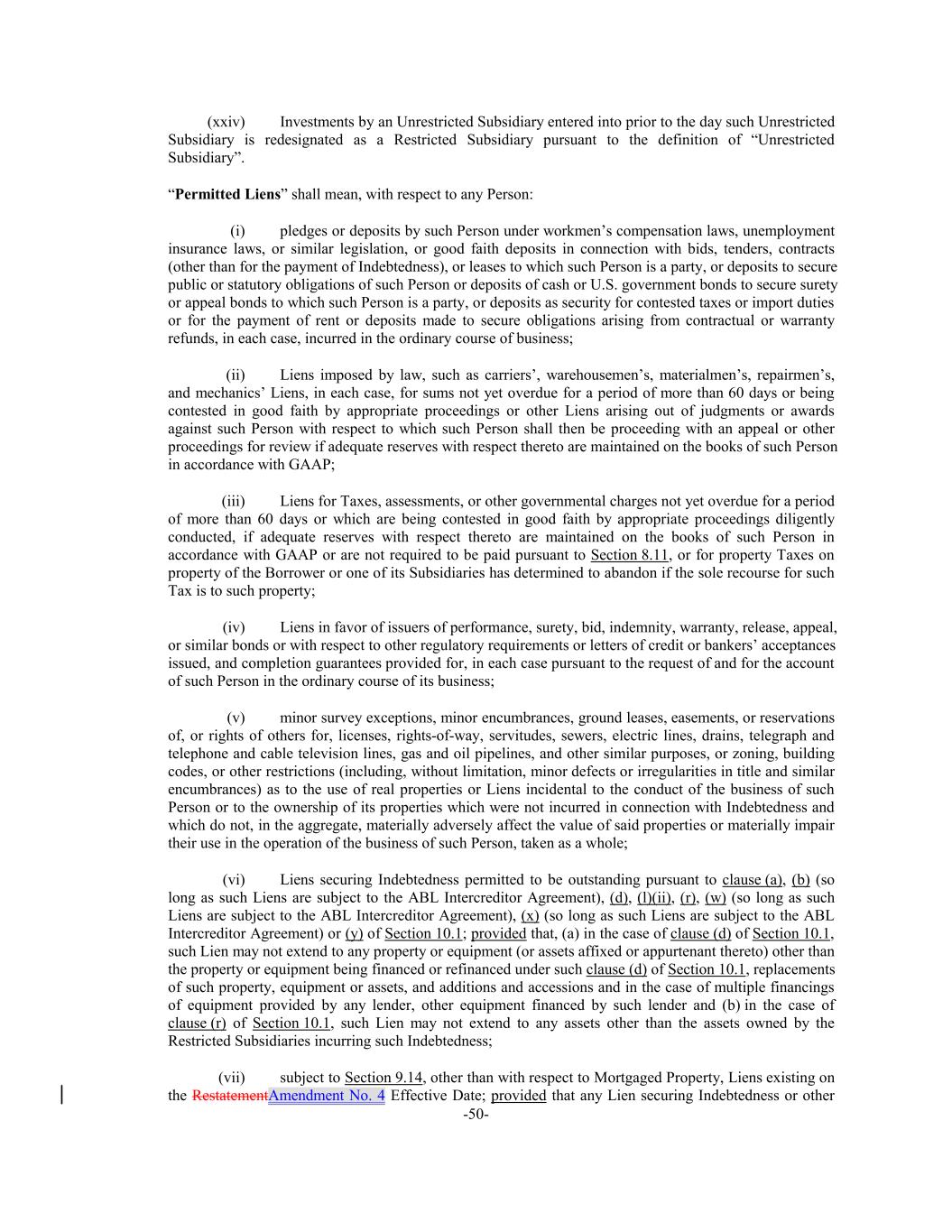 (xxiv) Investments by an Unrestricted Subsidiary entered into prior to the day such Unrestricted Subsidiary is redesignated as a Restricted Subsidiary pursuant to the definition of “Unrestricted Subsidiary”. “Permitted Liens” shall mean, with respect to any Person: (i) pledges or deposits by such Person under workmen’s compensation laws, unemployment insurance laws, or similar legislation, or good faith deposits in connection with bids, tenders, contracts (other than for the payment of Indebtedness), or leases to which such Person is a party, or deposits to secure public or statutory obligations of such Person or deposits of cash or U.S. government bonds to secure surety or appeal bonds to which such Person is a party, or deposits as security for contested taxes or import duties or for the payment of rent or deposits made to secure obligations arising from contractual or warranty refunds, in each case, incurred in the ordinary course of business; (ii) Liens imposed by law, such as carriers’, warehousemen’s, materialmen’s, repairmen’s, and mechanics’ Liens, in each case, for sums not yet overdue for a period of more than 60 days or being contested in good faith by appropriate proceedings or other Liens arising out of judgments or awards against such Person with respect to which such Person shall then be proceeding with an appeal or other proceedings for review if adequate reserves with respect thereto are maintained on the books of such Person in accordance with GAAP; (iii) Liens for Taxes, assessments, or other governmental charges not yet overdue for a period of more than 60 days or which are being contested in good faith by appropriate proceedings diligently conducted, if adequate reserves with respect thereto are maintained on the books of such Person in accordance with GAAP or are not required to be paid pursuant to Section 8.11, or for property Taxes on property of the Borrower or one of its Subsidiaries has determined to abandon if the sole recourse for such Tax is to such property; (iv) Liens in favor of issuers of performance, surety, bid, indemnity, warranty, release, appeal, or similar bonds or with respect to other regulatory requirements or letters of credit or bankers’ acceptances issued, and completion guarantees provided for, in each case pursuant to the request of and for the account of such Person in the ordinary course of its business; (v) minor survey exceptions, minor encumbrances, ground leases, easements, or reservations of, or rights of others for, licenses, rights-of-way, servitudes, sewers, electric lines, drains, telegraph and telephone and cable television lines, gas and oil pipelines, and other similar purposes, or zoning, building codes, or other restrictions (including, without limitation, minor defects or irregularities in title and similar encumbrances) as to the use of real properties or Liens incidental to the conduct of the business of such Person or to the ownership of its properties which were not incurred in connection with Indebtedness and which do not, in the aggregate, materially adversely affect the value of said properties or materially impair their use in the operation of the business of such Person, taken as a whole; (vi) Liens securing Indebtedness permitted to be outstanding pursuant to clause (a), (b) (so long as such Liens are subject to the ABL Intercreditor Agreement), (d), (l)(ii), (r), (w) (so long as such Liens are subject to the ABL Intercreditor Agreement), (x) (so long as such Liens are subject to the ABL Intercreditor Agreement) or (y) of Section 10.1; provided that, (a) in the case of clause (d) of Section 10.1, such Lien may not extend to any property or equipment (or assets affixed or appurtenant thereto) other than the property or equipment being financed or refinanced under such clause (d) of Section 10.1, replacements of such property, equipment or assets, and additions and accessions and in the case of multiple financings of equipment provided by any lender, other equipment financed by such lender and (b) in the case of clause (r) of Section 10.1, such Lien may not extend to any assets other than the assets owned by the Restricted Subsidiaries incurring such Indebtedness; (vii) subject to Section 9.14, other than with respect to Mortgaged Property, Liens existing on the RestatementAmendment No. 4 Effective Date; provided that any Lien securing Indebtedness or other -50-