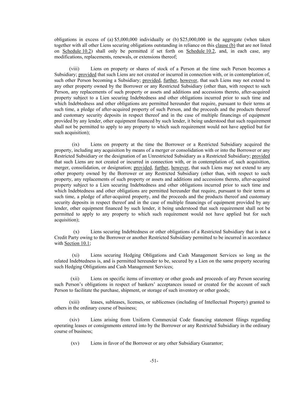 obligations in excess of (a) $5,000,000 individually or (b) $25,000,000 in the aggregate (when taken together with all other Liens securing obligations outstanding in reliance on this clause (b) that are not listed on Schedule 10.2) shall only be permitted if set forth on Schedule 10.2, and, in each case, any modifications, replacements, renewals, or extensions thereof; (viii) Liens on property or shares of stock of a Person at the time such Person becomes a Subsidiary; provided that such Liens are not created or incurred in connection with, or in contemplation of, such other Person becoming a Subsidiary; provided, further, however, that such Liens may not extend to any other property owned by the Borrower or any Restricted Subsidiary (other than, with respect to such Person, any replacements of such property or assets and additions and accessions thereto, after-acquired property subject to a Lien securing Indebtedness and other obligations incurred prior to such time and which Indebtedness and other obligations are permitted hereunder that require, pursuant to their terms at such time, a pledge of after-acquired property of such Person, and the proceeds and the products thereof and customary security deposits in respect thereof and in the case of multiple financings of equipment provided by any lender, other equipment financed by such lender, it being understood that such requirement shall not be permitted to apply to any property to which such requirement would not have applied but for such acquisition); (ix) Liens on property at the time the Borrower or a Restricted Subsidiary acquired the property, including any acquisition by means of a merger or consolidation with or into the Borrower or any Restricted Subsidiary or the designation of an Unrestricted Subsidiary as a Restricted Subsidiary; provided that such Liens are not created or incurred in connection with, or in contemplation of, such acquisition, merger, consolidation, or designation; provided, further, however, that such Liens may not extend to any other property owned by the Borrower or any Restricted Subsidiary (other than, with respect to such property, any replacements of such property or assets and additions and accessions thereto, after-acquired property subject to a Lien securing Indebtedness and other obligations incurred prior to such time and which Indebtedness and other obligations are permitted hereunder that require, pursuant to their terms at such time, a pledge of after-acquired property, and the proceeds and the products thereof and customary security deposits in respect thereof and in the case of multiple financings of equipment provided by any lender, other equipment financed by such lender, it being understood that such requirement shall not be permitted to apply to any property to which such requirement would not have applied but for such acquisition); (x) Liens securing Indebtedness or other obligations of a Restricted Subsidiary that is not a Credit Party owing to the Borrower or another Restricted Subsidiary permitted to be incurred in accordance with Section 10.1; (xi) Liens securing Hedging Obligations and Cash Management Services so long as the related Indebtedness is, and is permitted hereunder to be, secured by a Lien on the same property securing such Hedging Obligations and Cash Management Services; (xii) Liens on specific items of inventory or other goods and proceeds of any Person securing such Person’s obligations in respect of bankers’ acceptances issued or created for the account of such Person to facilitate the purchase, shipment, or storage of such inventory or other goods; (xiii) leases, subleases, licenses, or sublicenses (including of Intellectual Property) granted to others in the ordinary course of business; (xiv) Liens arising from Uniform Commercial Code financing statement filings regarding operating leases or consignments entered into by the Borrower or any Restricted Subsidiary in the ordinary course of business; (xv) Liens in favor of the Borrower or any other Subsidiary Guarantor; -51-