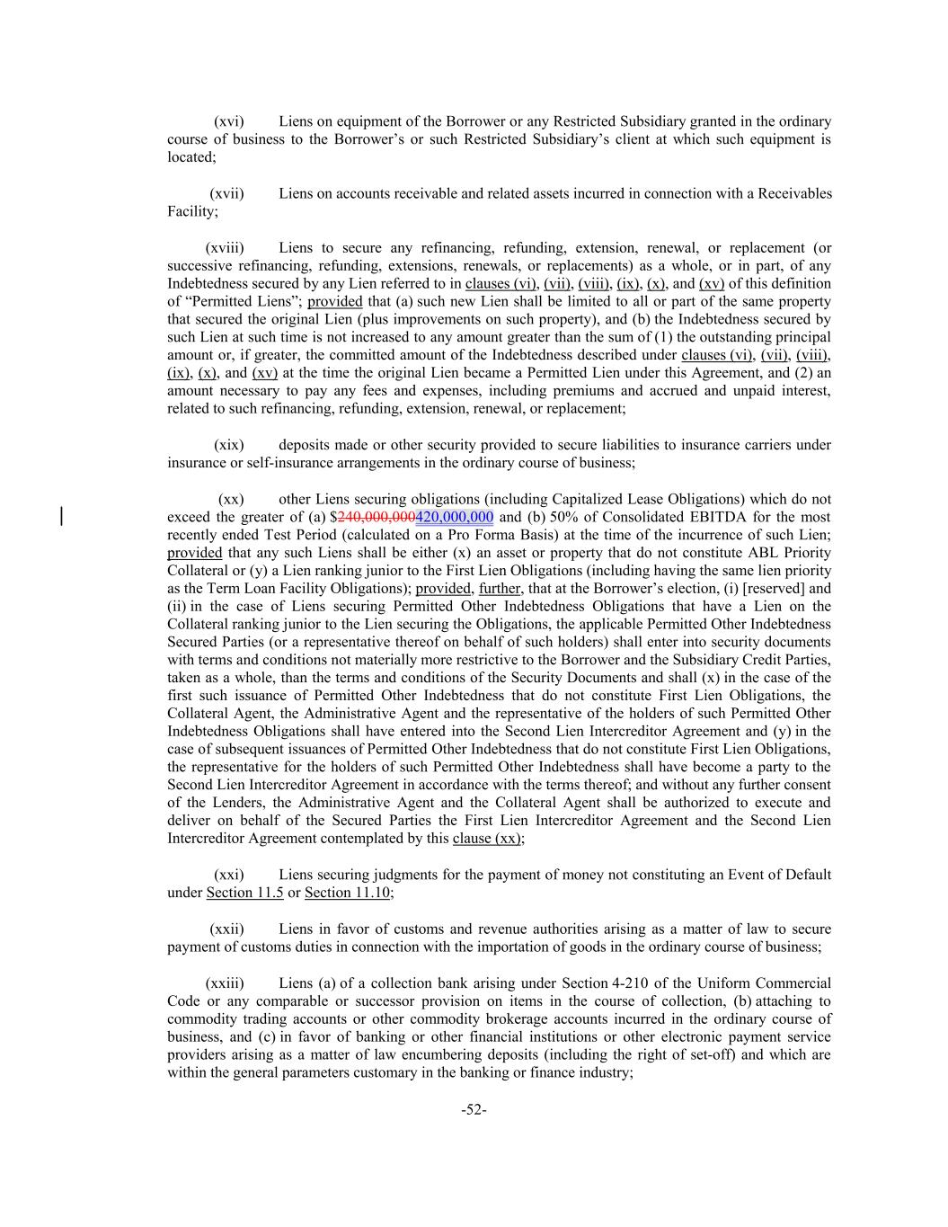 (xvi) Liens on equipment of the Borrower or any Restricted Subsidiary granted in the ordinary course of business to the Borrower’s or such Restricted Subsidiary’s client at which such equipment is located; (xvii) Liens on accounts receivable and related assets incurred in connection with a Receivables Facility; (xviii) Liens to secure any refinancing, refunding, extension, renewal, or replacement (or successive refinancing, refunding, extensions, renewals, or replacements) as a whole, or in part, of any Indebtedness secured by any Lien referred to in clauses (vi), (vii), (viii), (ix), (x), and (xv) of this definition of “Permitted Liens”; provided that (a) such new Lien shall be limited to all or part of the same property that secured the original Lien (plus improvements on such property), and (b) the Indebtedness secured by such Lien at such time is not increased to any amount greater than the sum of (1) the outstanding principal amount or, if greater, the committed amount of the Indebtedness described under clauses (vi), (vii), (viii), (ix), (x), and (xv) at the time the original Lien became a Permitted Lien under this Agreement, and (2) an amount necessary to pay any fees and expenses, including premiums and accrued and unpaid interest, related to such refinancing, refunding, extension, renewal, or replacement; (xix) deposits made or other security provided to secure liabilities to insurance carriers under insurance or self-insurance arrangements in the ordinary course of business; (xx) other Liens securing obligations (including Capitalized Lease Obligations) which do not exceed the greater of (a) $240,000,000420,000,000 and (b) 50% of Consolidated EBITDA for the most recently ended Test Period (calculated on a Pro Forma Basis) at the time of the incurrence of such Lien; provided that any such Liens shall be either (x) an asset or property that do not constitute ABL Priority Collateral or (y) a Lien ranking junior to the First Lien Obligations (including having the same lien priority as the Term Loan Facility Obligations); provided, further, that at the Borrower’s election, (i) [reserved] and (ii) in the case of Liens securing Permitted Other Indebtedness Obligations that have a Lien on the Collateral ranking junior to the Lien securing the Obligations, the applicable Permitted Other Indebtedness Secured Parties (or a representative thereof on behalf of such holders) shall enter into security documents with terms and conditions not materially more restrictive to the Borrower and the Subsidiary Credit Parties, taken as a whole, than the terms and conditions of the Security Documents and shall (x) in the case of the first such issuance of Permitted Other Indebtedness that do not constitute First Lien Obligations, the Collateral Agent, the Administrative Agent and the representative of the holders of such Permitted Other Indebtedness Obligations shall have entered into the Second Lien Intercreditor Agreement and (y) in the case of subsequent issuances of Permitted Other Indebtedness that do not constitute First Lien Obligations, the representative for the holders of such Permitted Other Indebtedness shall have become a party to the Second Lien Intercreditor Agreement in accordance with the terms thereof; and without any further consent of the Lenders, the Administrative Agent and the Collateral Agent shall be authorized to execute and deliver on behalf of the Secured Parties the First Lien Intercreditor Agreement and the Second Lien Intercreditor Agreement contemplated by this clause (xx); (xxi) Liens securing judgments for the payment of money not constituting an Event of Default under Section 11.5 or Section 11.10; (xxii) Liens in favor of customs and revenue authorities arising as a matter of law to secure payment of customs duties in connection with the importation of goods in the ordinary course of business; (xxiii) Liens (a) of a collection bank arising under Section 4-210 of the Uniform Commercial Code or any comparable or successor provision on items in the course of collection, (b) attaching to commodity trading accounts or other commodity brokerage accounts incurred in the ordinary course of business, and (c) in favor of banking or other financial institutions or other electronic payment service providers arising as a matter of law encumbering deposits (including the right of set-off) and which are within the general parameters customary in the banking or finance industry; -52-