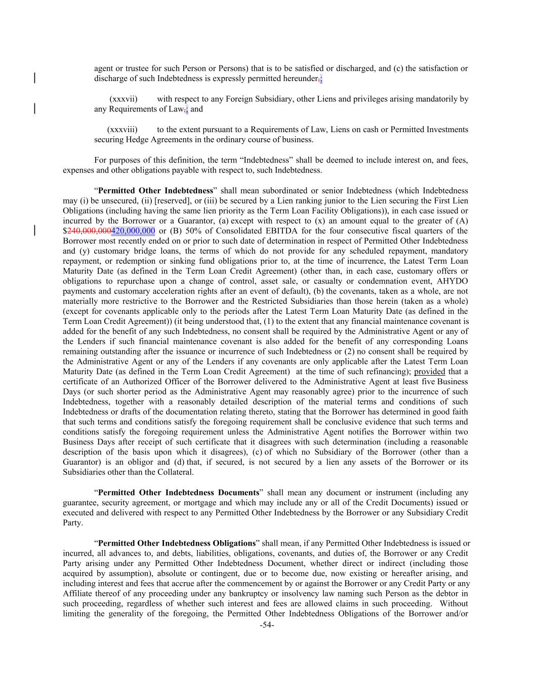 agent or trustee for such Person or Persons) that is to be satisfied or discharged, and (c) the satisfaction or discharge of such Indebtedness is expressly permitted hereunder,; (xxxvii) with respect to any Foreign Subsidiary, other Liens and privileges arising mandatorily by any Requirements of Law,; and (xxxviii) to the extent pursuant to a Requirements of Law, Liens on cash or Permitted Investments securing Hedge Agreements in the ordinary course of business. For purposes of this definition, the term “Indebtedness” shall be deemed to include interest on, and fees, expenses and other obligations payable with respect to, such Indebtedness. “Permitted Other Indebtedness” shall mean subordinated or senior Indebtedness (which Indebtedness may (i) be unsecured, (ii) [reserved], or (iii) be secured by a Lien ranking junior to the Lien securing the First Lien Obligations (including having the same lien priority as the Term Loan Facility Obligations)), in each case issued or incurred by the Borrower or a Guarantor, (a) except with respect to (x) an amount equal to the greater of (A) $240,000,000420,000,000 or (B) 50% of Consolidated EBITDA for the four consecutive fiscal quarters of the Borrower most recently ended on or prior to such date of determination in respect of Permitted Other Indebtedness and (y) customary bridge loans, the terms of which do not provide for any scheduled repayment, mandatory repayment, or redemption or sinking fund obligations prior to, at the time of incurrence, the Latest Term Loan Maturity Date (as defined in the Term Loan Credit Agreement) (other than, in each case, customary offers or obligations to repurchase upon a change of control, asset sale, or casualty or condemnation event, AHYDO payments and customary acceleration rights after an event of default), (b) the covenants, taken as a whole, are not materially more restrictive to the Borrower and the Restricted Subsidiaries than those herein (taken as a whole) (except for covenants applicable only to the periods after the Latest Term Loan Maturity Date (as defined in the Term Loan Credit Agreement)) (it being understood that, (1) to the extent that any financial maintenance covenant is added for the benefit of any such Indebtedness, no consent shall be required by the Administrative Agent or any of the Lenders if such financial maintenance covenant is also added for the benefit of any corresponding Loans remaining outstanding after the issuance or incurrence of such Indebtedness or (2) no consent shall be required by the Administrative Agent or any of the Lenders if any covenants are only applicable after the Latest Term Loan Maturity Date (as defined in the Term Loan Credit Agreement) at the time of such refinancing); provided that a certificate of an Authorized Officer of the Borrower delivered to the Administrative Agent at least five Business Days (or such shorter period as the Administrative Agent may reasonably agree) prior to the incurrence of such Indebtedness, together with a reasonably detailed description of the material terms and conditions of such Indebtedness or drafts of the documentation relating thereto, stating that the Borrower has determined in good faith that such terms and conditions satisfy the foregoing requirement shall be conclusive evidence that such terms and conditions satisfy the foregoing requirement unless the Administrative Agent notifies the Borrower within two Business Days after receipt of such certificate that it disagrees with such determination (including a reasonable description of the basis upon which it disagrees), (c) of which no Subsidiary of the Borrower (other than a Guarantor) is an obligor and (d) that, if secured, is not secured by a lien any assets of the Borrower or its Subsidiaries other than the Collateral. “Permitted Other Indebtedness Documents” shall mean any document or instrument (including any guarantee, security agreement, or mortgage and which may include any or all of the Credit Documents) issued or executed and delivered with respect to any Permitted Other Indebtedness by the Borrower or any Subsidiary Credit Party. “Permitted Other Indebtedness Obligations” shall mean, if any Permitted Other Indebtedness is issued or incurred, all advances to, and debts, liabilities, obligations, covenants, and duties of, the Borrower or any Credit Party arising under any Permitted Other Indebtedness Document, whether direct or indirect (including those acquired by assumption), absolute or contingent, due or to become due, now existing or hereafter arising, and including interest and fees that accrue after the commencement by or against the Borrower or any Credit Party or any Affiliate thereof of any proceeding under any bankruptcy or insolvency law naming such Person as the debtor in such proceeding, regardless of whether such interest and fees are allowed claims in such proceeding. Without limiting the generality of the foregoing, the Permitted Other Indebtedness Obligations of the Borrower and/or -54-