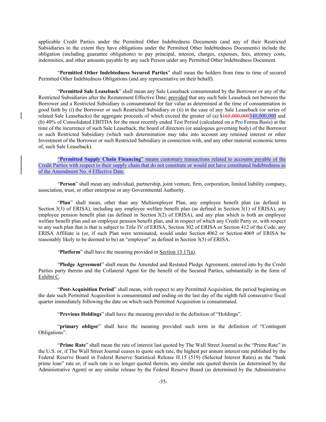 applicable Credit Parties under the Permitted Other Indebtedness Documents (and any of their Restricted Subsidiaries to the extent they have obligations under the Permitted Other Indebtedness Documents) include the obligation (including guarantee obligations) to pay principal, interest, charges, expenses, fees, attorney costs, indemnities, and other amounts payable by any such Person under any Permitted Other Indebtedness Document. “Permitted Other Indebtedness Secured Parties” shall mean the holders from time to time of secured Permitted Other Indebtedness Obligations (and any representative on their behalf). “Permitted Sale Leaseback” shall mean any Sale Leaseback consummated by the Borrower or any of the Restricted Subsidiaries after the Restatement Effective Date; provided that any such Sale Leaseback not between the Borrower and a Restricted Subsidiary is consummated for fair value as determined at the time of consummation in good faith by (i) the Borrower or such Restricted Subsidiary or (ii) in the case of any Sale Leaseback (or series of related Sale Leasebacks) the aggregate proceeds of which exceed the greater of (a) $165,000,000340,000,000 and (b) 40% of Consolidated EBITDA for the most recently ended Test Period (calculated on a Pro Forma Basis) at the time of the incurrence of such Sale Leaseback, the board of directors (or analogous governing body) of the Borrower or such Restricted Subsidiary (which such determination may take into account any retained interest or other Investment of the Borrower or such Restricted Subsidiary in connection with, and any other material economic terms of, such Sale Leaseback). “Permitted Supply Chain Financing” means customary transactions related to accounts payable of the Credit Parties with respect to their supply chain that do not constitute or would not have constituted Indebtedness as of the Amendment No. 4 Effective Date. “Person” shall mean any individual, partnership, joint venture, firm, corporation, limited liability company, association, trust, or other enterprise or any Governmental Authority. “Plan” shall mean, other than any Multiemployer Plan, any employee benefit plan (as defined in Section 3(3) of ERISA), including any employee welfare benefit plan (as defined in Section 3(1) of ERISA), any employee pension benefit plan (as defined in Section 3(2) of ERISA), and any plan which is both an employee welfare benefit plan and an employee pension benefit plan, and in respect of which any Credit Party or, with respect to any such plan that is that is subject to Title IV of ERISA, Section 302 of ERISA or Section 412 of the Code, any ERISA Affiliate is (or, if such Plan were terminated, would under Section 4062 or Section 4069 of ERISA be reasonably likely to be deemed to be) an “employer” as defined in Section 3(5) of ERISA. “Platform” shall have the meaning provided in Section 13.17(a). “Pledge Agreement” shall mean the Amended and Restated Pledge Agreement, entered into by the Credit Parties party thereto and the Collateral Agent for the benefit of the Secured Parties, substantially in the form of Exhibit C. “Post-Acquisition Period” shall mean, with respect to any Permitted Acquisition, the period beginning on the date such Permitted Acquisition is consummated and ending on the last day of the eighth full consecutive fiscal quarter immediately following the date on which such Permitted Acquisition is consummated. “Previous Holdings” shall have the meaning provided in the definition of “Holdings”. “primary obligor” shall have the meaning provided such term in the definition of “Contingent Obligations”. “Prime Rate” shall mean the rate of interest last quoted by The Wall Street Journal as the “Prime Rate” in the U.S. or, if The Wall Street Journal ceases to quote such rate, the highest per annum interest rate published by the Federal Reserve Board in Federal Reserve Statistical Release H.15 (519) (Selected Interest Rates) as the “bank prime loan” rate or, if such rate is no longer quoted therein, any similar rate quoted therein (as determined by the Administrative Agent) or any similar release by the Federal Reserve Board (as determined by the Administrative -55-