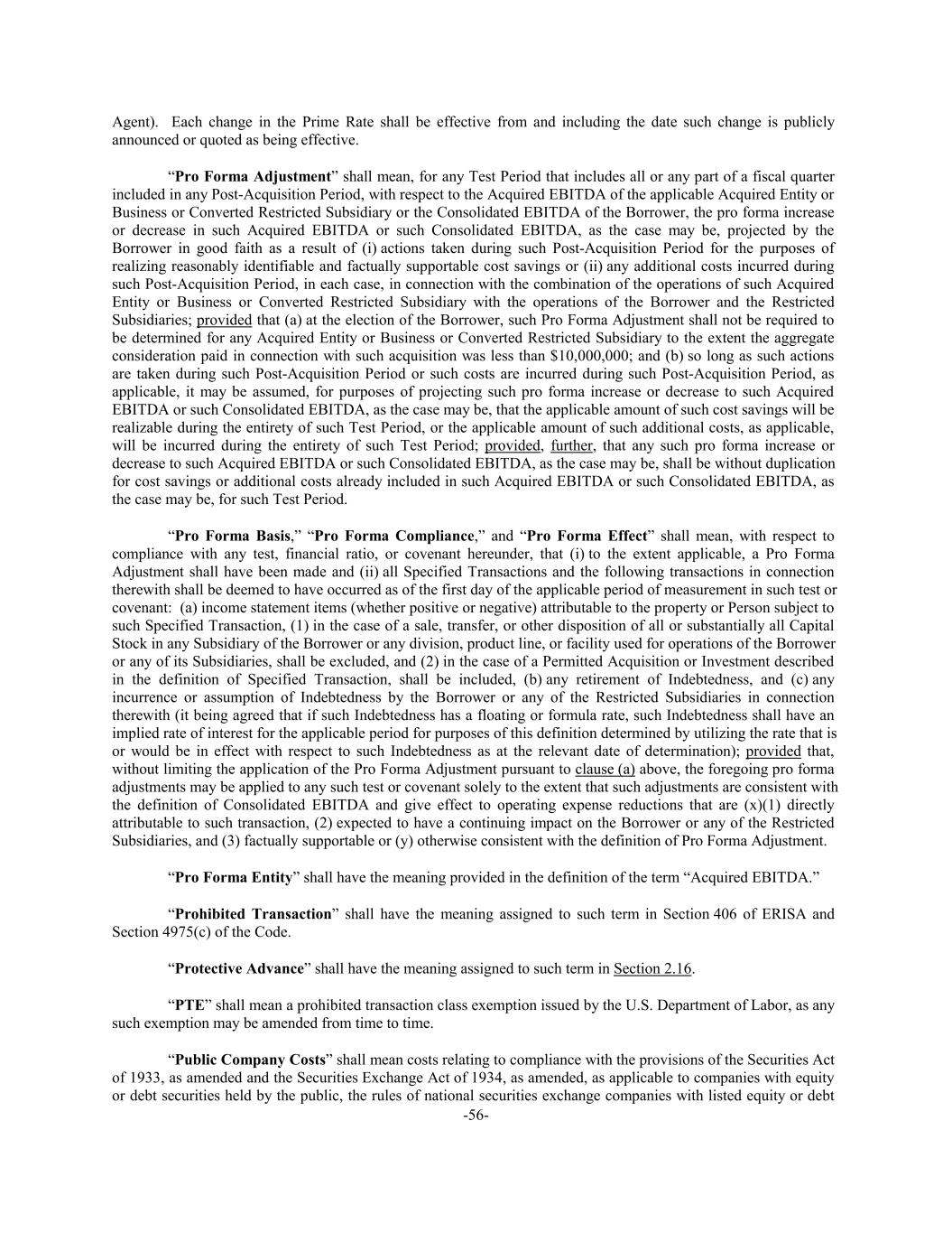 Agent). Each change in the Prime Rate shall be effective from and including the date such change is publicly announced or quoted as being effective. “Pro Forma Adjustment” shall mean, for any Test Period that includes all or any part of a fiscal quarter included in any Post-Acquisition Period, with respect to the Acquired EBITDA of the applicable Acquired Entity or Business or Converted Restricted Subsidiary or the Consolidated EBITDA of the Borrower, the pro forma increase or decrease in such Acquired EBITDA or such Consolidated EBITDA, as the case may be, projected by the Borrower in good faith as a result of (i) actions taken during such Post-Acquisition Period for the purposes of realizing reasonably identifiable and factually supportable cost savings or (ii) any additional costs incurred during such Post-Acquisition Period, in each case, in connection with the combination of the operations of such Acquired Entity or Business or Converted Restricted Subsidiary with the operations of the Borrower and the Restricted Subsidiaries; provided that (a) at the election of the Borrower, such Pro Forma Adjustment shall not be required to be determined for any Acquired Entity or Business or Converted Restricted Subsidiary to the extent the aggregate consideration paid in connection with such acquisition was less than $10,000,000; and (b) so long as such actions are taken during such Post-Acquisition Period or such costs are incurred during such Post-Acquisition Period, as applicable, it may be assumed, for purposes of projecting such pro forma increase or decrease to such Acquired EBITDA or such Consolidated EBITDA, as the case may be, that the applicable amount of such cost savings will be realizable during the entirety of such Test Period, or the applicable amount of such additional costs, as applicable, will be incurred during the entirety of such Test Period; provided, further, that any such pro forma increase or decrease to such Acquired EBITDA or such Consolidated EBITDA, as the case may be, shall be without duplication for cost savings or additional costs already included in such Acquired EBITDA or such Consolidated EBITDA, as the case may be, for such Test Period. “Pro Forma Basis,” “Pro Forma Compliance,” and “Pro Forma Effect” shall mean, with respect to compliance with any test, financial ratio, or covenant hereunder, that (i) to the extent applicable, a Pro Forma Adjustment shall have been made and (ii) all Specified Transactions and the following transactions in connection therewith shall be deemed to have occurred as of the first day of the applicable period of measurement in such test or covenant: (a) income statement items (whether positive or negative) attributable to the property or Person subject to such Specified Transaction, (1) in the case of a sale, transfer, or other disposition of all or substantially all Capital Stock in any Subsidiary of the Borrower or any division, product line, or facility used for operations of the Borrower or any of its Subsidiaries, shall be excluded, and (2) in the case of a Permitted Acquisition or Investment described in the definition of Specified Transaction, shall be included, (b) any retirement of Indebtedness, and (c) any incurrence or assumption of Indebtedness by the Borrower or any of the Restricted Subsidiaries in connection therewith (it being agreed that if such Indebtedness has a floating or formula rate, such Indebtedness shall have an implied rate of interest for the applicable period for purposes of this definition determined by utilizing the rate that is or would be in effect with respect to such Indebtedness as at the relevant date of determination); provided that, without limiting the application of the Pro Forma Adjustment pursuant to clause (a) above, the foregoing pro forma adjustments may be applied to any such test or covenant solely to the extent that such adjustments are consistent with the definition of Consolidated EBITDA and give effect to operating expense reductions that are (x)(1) directly attributable to such transaction, (2) expected to have a continuing impact on the Borrower or any of the Restricted Subsidiaries, and (3) factually supportable or (y) otherwise consistent with the definition of Pro Forma Adjustment. “Pro Forma Entity” shall have the meaning provided in the definition of the term “Acquired EBITDA.” “Prohibited Transaction” shall have the meaning assigned to such term in Section 406 of ERISA and Section 4975(c) of the Code. “Protective Advance” shall have the meaning assigned to such term in Section 2.16. “PTE” shall mean a prohibited transaction class exemption issued by the U.S. Department of Labor, as any such exemption may be amended from time to time. “Public Company Costs” shall mean costs relating to compliance with the provisions of the Securities Act of 1933, as amended and the Securities Exchange Act of 1934, as amended, as applicable to companies with equity or debt securities held by the public, the rules of national securities exchange companies with listed equity or debt -56-