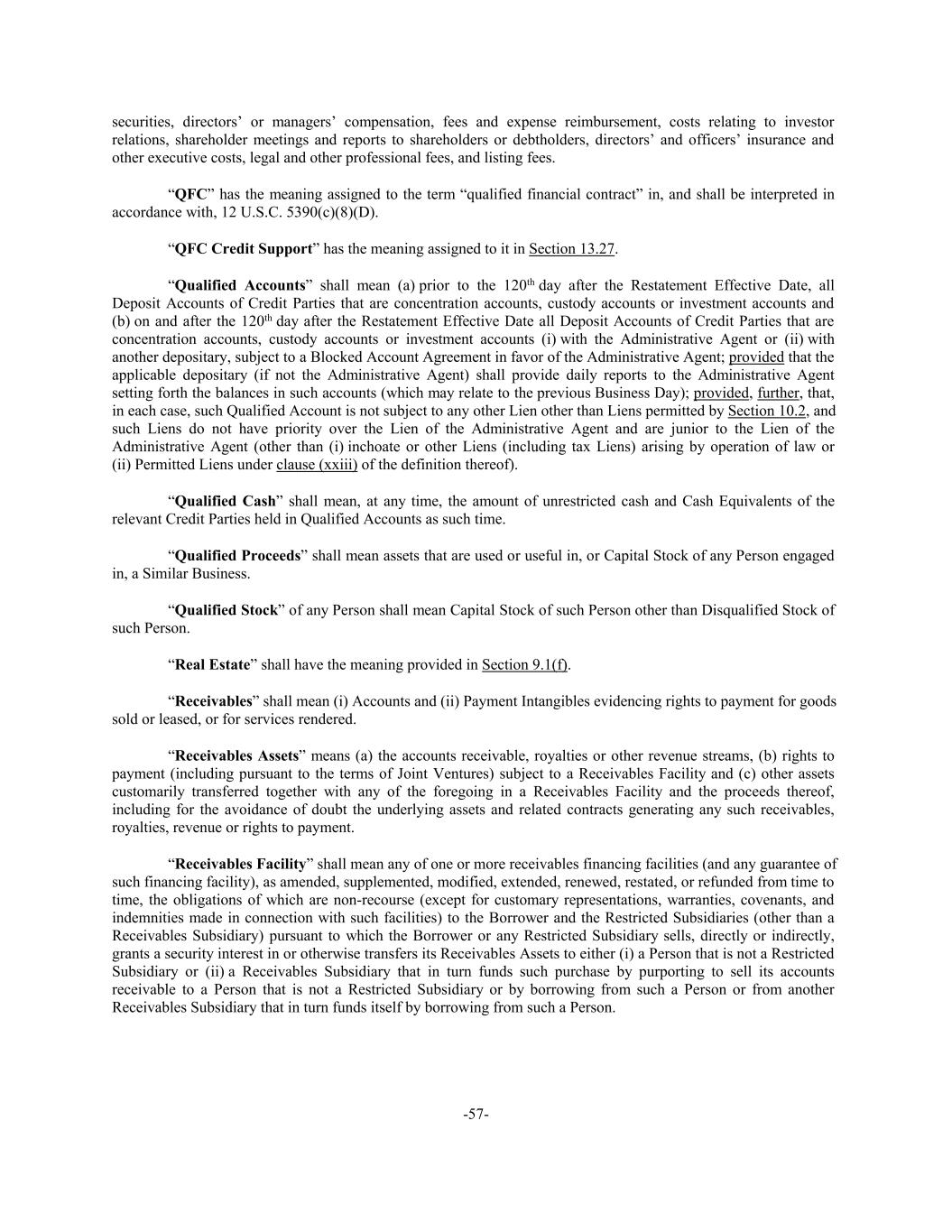 securities, directors’ or managers’ compensation, fees and expense reimbursement, costs relating to investor relations, shareholder meetings and reports to shareholders or debtholders, directors’ and officers’ insurance and other executive costs, legal and other professional fees, and listing fees. “QFC” has the meaning assigned to the term “qualified financial contract” in, and shall be interpreted in accordance with, 12 U.S.C. 5390(c)(8)(D). “QFC Credit Support” has the meaning assigned to it in Section 13.27. “Qualified Accounts” shall mean (a) prior to the 120th day after the Restatement Effective Date, all Deposit Accounts of Credit Parties that are concentration accounts, custody accounts or investment accounts and (b) on and after the 120th day after the Restatement Effective Date all Deposit Accounts of Credit Parties that are concentration accounts, custody accounts or investment accounts (i) with the Administrative Agent or (ii) with another depositary, subject to a Blocked Account Agreement in favor of the Administrative Agent; provided that the applicable depositary (if not the Administrative Agent) shall provide daily reports to the Administrative Agent setting forth the balances in such accounts (which may relate to the previous Business Day); provided, further, that, in each case, such Qualified Account is not subject to any other Lien other than Liens permitted by Section 10.2, and such Liens do not have priority over the Lien of the Administrative Agent and are junior to the Lien of the Administrative Agent (other than (i) inchoate or other Liens (including tax Liens) arising by operation of law or (ii) Permitted Liens under clause (xxiii) of the definition thereof). “Qualified Cash” shall mean, at any time, the amount of unrestricted cash and Cash Equivalents of the relevant Credit Parties held in Qualified Accounts as such time. “Qualified Proceeds” shall mean assets that are used or useful in, or Capital Stock of any Person engaged in, a Similar Business. “Qualified Stock” of any Person shall mean Capital Stock of such Person other than Disqualified Stock of such Person. “Real Estate” shall have the meaning provided in Section 9.1(f). “Receivables” shall mean (i) Accounts and (ii) Payment Intangibles evidencing rights to payment for goods sold or leased, or for services rendered. “Receivables Assets” means (a) the accounts receivable, royalties or other revenue streams, (b) rights to payment (including pursuant to the terms of Joint Ventures) subject to a Receivables Facility and (c) other assets customarily transferred together with any of the foregoing in a Receivables Facility and the proceeds thereof, including for the avoidance of doubt the underlying assets and related contracts generating any such receivables, royalties, revenue or rights to payment. “Receivables Facility” shall mean any of one or more receivables financing facilities (and any guarantee of such financing facility), as amended, supplemented, modified, extended, renewed, restated, or refunded from time to time, the obligations of which are non-recourse (except for customary representations, warranties, covenants, and indemnities made in connection with such facilities) to the Borrower and the Restricted Subsidiaries (other than a Receivables Subsidiary) pursuant to which the Borrower or any Restricted Subsidiary sells, directly or indirectly, grants a security interest in or otherwise transfers its Receivables Assets to either (i) a Person that is not a Restricted Subsidiary or (ii) a Receivables Subsidiary that in turn funds such purchase by purporting to sell its accounts receivable to a Person that is not a Restricted Subsidiary or by borrowing from such a Person or from another Receivables Subsidiary that in turn funds itself by borrowing from such a Person. -57-