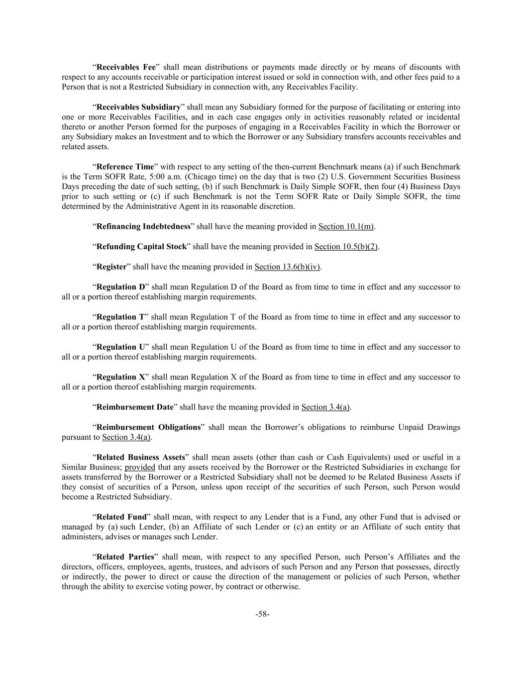 “Receivables Fee” shall mean distributions or payments made directly or by means of discounts with respect to any accounts receivable or participation interest issued or sold in connection with, and other fees paid to a Person that is not a Restricted Subsidiary in connection with, any Receivables Facility. “Receivables Subsidiary” shall mean any Subsidiary formed for the purpose of facilitating or entering into one or more Receivables Facilities, and in each case engages only in activities reasonably related or incidental thereto or another Person formed for the purposes of engaging in a Receivables Facility in which the Borrower or any Subsidiary makes an Investment and to which the Borrower or any Subsidiary transfers accounts receivables and related assets. “Reference Time” with respect to any setting of the then-current Benchmark means (a) if such Benchmark is the Term SOFR Rate, 5:00 a.m. (Chicago time) on the day that is two (2) U.S. Government Securities Business Days preceding the date of such setting, (b) if such Benchmark is Daily Simple SOFR, then four (4) Business Days prior to such setting or (c) if such Benchmark is not the Term SOFR Rate or Daily Simple SOFR, the time determined by the Administrative Agent in its reasonable discretion. “Refinancing Indebtedness” shall have the meaning provided in Section 10.1(m). “Refunding Capital Stock” shall have the meaning provided in Section 10.5(b)(2). “Register” shall have the meaning provided in Section 13.6(b)(iv). “Regulation D” shall mean Regulation D of the Board as from time to time in effect and any successor to all or a portion thereof establishing margin requirements. “Regulation T” shall mean Regulation T of the Board as from time to time in effect and any successor to all or a portion thereof establishing margin requirements. “Regulation U” shall mean Regulation U of the Board as from time to time in effect and any successor to all or a portion thereof establishing margin requirements. “Regulation X” shall mean Regulation X of the Board as from time to time in effect and any successor to all or a portion thereof establishing margin requirements. “Reimbursement Date” shall have the meaning provided in Section 3.4(a). “Reimbursement Obligations” shall mean the Borrower’s obligations to reimburse Unpaid Drawings pursuant to Section 3.4(a). “Related Business Assets” shall mean assets (other than cash or Cash Equivalents) used or useful in a Similar Business; provided that any assets received by the Borrower or the Restricted Subsidiaries in exchange for assets transferred by the Borrower or a Restricted Subsidiary shall not be deemed to be Related Business Assets if they consist of securities of a Person, unless upon receipt of the securities of such Person, such Person would become a Restricted Subsidiary. “Related Fund” shall mean, with respect to any Lender that is a Fund, any other Fund that is advised or managed by (a) such Lender, (b) an Affiliate of such Lender or (c) an entity or an Affiliate of such entity that administers, advises or manages such Lender. “Related Parties” shall mean, with respect to any specified Person, such Person’s Affiliates and the directors, officers, employees, agents, trustees, and advisors of such Person and any Person that possesses, directly or indirectly, the power to direct or cause the direction of the management or policies of such Person, whether through the ability to exercise voting power, by contract or otherwise. -58-