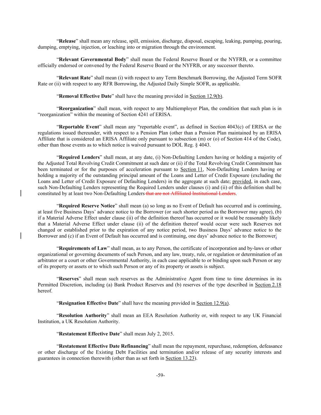 “Release” shall mean any release, spill, emission, discharge, disposal, escaping, leaking, pumping, pouring, dumping, emptying, injection, or leaching into or migration through the environment. “Relevant Governmental Body” shall mean the Federal Reserve Board or the NYFRB, or a committee officially endorsed or convened by the Federal Reserve Board or the NYFRB, or any successor thereto. “Relevant Rate” shall mean (i) with respect to any Term Benchmark Borrowing, the Adjusted Term SOFR Rate or (ii) with respect to any RFR Borrowing, the Adjusted Daily Simple SOFR, as applicable. “Removal Effective Date” shall have the meaning provided in Section 12.9(b). “Reorganization” shall mean, with respect to any Multiemployer Plan, the condition that such plan is in “reorganization” within the meaning of Section 4241 of ERISA. “Reportable Event” shall mean any “reportable event”, as defined in Section 4043(c) of ERISA or the regulations issued thereunder, with respect to a Pension Plan (other than a Pension Plan maintained by an ERISA Affiliate that is considered an ERISA Affiliate only pursuant to subsection (m) or (o) of Section 414 of the Code), other than those events as to which notice is waived pursuant to DOL Reg. § 4043. “Required Lenders” shall mean, at any date, (i) Non-Defaulting Lenders having or holding a majority of the Adjusted Total Revolving Credit Commitment at such date or (ii) if the Total Revolving Credit Commitment has been terminated or for the purposes of acceleration pursuant to Section 11, Non-Defaulting Lenders having or holding a majority of the outstanding principal amount of the Loans and Letter of Credit Exposure (excluding the Loans and Letter of Credit Exposure of Defaulting Lenders) in the aggregate at such date; provided, in each case, such Non-Defaulting Lenders representing the Required Lenders under clauses (i) and (ii) of this definition shall be constituted by at least two Non-Defaulting Lenders that are not Affiliated Institutional Lenders. “Required Reserve Notice” shall mean (a) so long as no Event of Default has occurred and is continuing, at least five Business Days’ advance notice to the Borrower (or such shorter period as the Borrower may agree), (b) if a Material Adverse Effect under clause (ii) of the definition thereof has occurred or it would be reasonably likely that a Material Adverse Effect under clause (ii) of the definition thereof would occur were such Reserves not changed or established prior to the expiration of any notice period, two Business Days’ advance notice to the Borrower and (c) if an Event of Default has occurred and is continuing, one days’ advance notice to the Borrower. “Requirements of Law” shall mean, as to any Person, the certificate of incorporation and by-laws or other organizational or governing documents of such Person, and any law, treaty, rule, or regulation or determination of an arbitrator or a court or other Governmental Authority, in each case applicable to or binding upon such Person or any of its property or assets or to which such Person or any of its property or assets is subject. “Reserves” shall mean such reserves as the Administrative Agent from time to time determines in its Permitted Discretion, including (a) Bank Product Reserves and (b) reserves of the type described in Section 2.18 hereof. “Resignation Effective Date” shall have the meaning provided in Section 12.9(a). “Resolution Authority” shall mean an EEA Resolution Authority or, with respect to any UK Financial Institution, a UK Resolution Authority. “Restatement Effective Date” shall mean July 2, 2015. “Restatement Effective Date Refinancing” shall mean the repayment, repurchase, redemption, defeasance or other discharge of the Existing Debt Facilities and termination and/or release of any security interests and guarantees in connection therewith (other than as set forth in Section 13.23). -59-