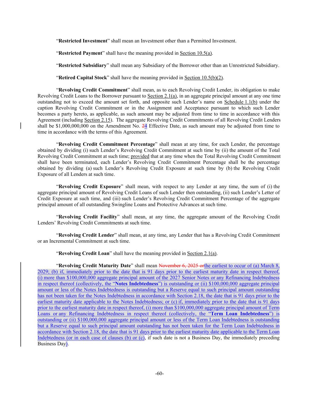 “Restricted Investment” shall mean an Investment other than a Permitted Investment. “Restricted Payment” shall have the meaning provided in Section 10.5(a). “Restricted Subsidiary” shall mean any Subsidiary of the Borrower other than an Unrestricted Subsidiary. “Retired Capital Stock” shall have the meaning provided in Section 10.5(b)(2). “Revolving Credit Commitment” shall mean, as to each Revolving Credit Lender, its obligation to make Revolving Credit Loans to the Borrower pursuant to Section 2.1(a), in an aggregate principal amount at any one time outstanding not to exceed the amount set forth, and opposite such Lender’s name on Schedule 1.1(b) under the caption Revolving Credit Commitment or in the Assignment and Acceptance pursuant to which such Lender becomes a party hereto, as applicable, as such amount may be adjusted from time to time in accordance with this Agreement (including Section 2.15). The aggregate Revolving Credit Commitments of all Revolving Credit Lenders shall be $1,000,000,000 on the Amendment No. 24 Effective Date, as such amount may be adjusted from time to time in accordance with the terms of this Agreement. “Revolving Credit Commitment Percentage” shall mean at any time, for each Lender, the percentage obtained by dividing (i) such Lender’s Revolving Credit Commitment at such time by (ii) the amount of the Total Revolving Credit Commitment at such time; provided that at any time when the Total Revolving Credit Commitment shall have been terminated, each Lender’s Revolving Credit Commitment Percentage shall be the percentage obtained by dividing (a) such Lender’s Revolving Credit Exposure at such time by (b) the Revolving Credit Exposure of all Lenders at such time. “Revolving Credit Exposure” shall mean, with respect to any Lender at any time, the sum of (i) the aggregate principal amount of Revolving Credit Loans of such Lender then outstanding, (ii) such Lender’s Letter of Credit Exposure at such time, and (iii) such Lender’s Revolving Credit Commitment Percentage of the aggregate principal amount of all outstanding Swingline Loans and Protective Advances at such time. “Revolving Credit Facility” shall mean, at any time, the aggregate amount of the Revolving Credit Lenders’ Revolving Credit Commitments at such time. “Revolving Credit Lender” shall mean, at any time, any Lender that has a Revolving Credit Commitment or an Incremental Commitment at such time. “Revolving Credit Loan” shall have the meaning provided in Section 2.1(a). “Revolving Credit Maturity Date” shall mean November 6, 2025 orthe earliest to occur of (a) March 8, 2029; (b) if, immediately prior to the date that is 91 days prior to the earliest maturity date in respect thereof, (i) more than $100,000,000 aggregate principal amount of the 2027 Senior Notes or any Refinancing Indebtedness in respect thereof (collectively, the “Notes Indebtedness”) is outstanding or (ii) $100,000,000 aggregate principal amount or less of the Notes Indebtedness is outstanding but a Reserve equal to such principal amount outstanding has not been taken for the Notes Indebtedness in accordance with Section 2.18, the date that is 91 days prior to the earliest maturity date applicable to the Notes Indebtedness; or (c) if, immediately prior to the date that is 91 days prior to the earliest maturity date in respect thereof, (i) more than $100,000,000 aggregate principal amount of Term Loans or any Refinancing Indebtedness in respect thereof (collectively, the “Term Loan Indebtedness”) is outstanding or (ii) $100,000,000 aggregate principal amount or less of the Term Loan Indebtedness is outstanding but a Reserve equal to such principal amount outstanding has not been taken for the Term Loan Indebtedness in accordance with Section 2.18, the date that is 91 days prior to the earliest maturity date applicable to the Term Loan Indebtedness (or in each case of clauses (b) or (c), if such date is not a Business Day, the immediately preceding Business Day). -60-