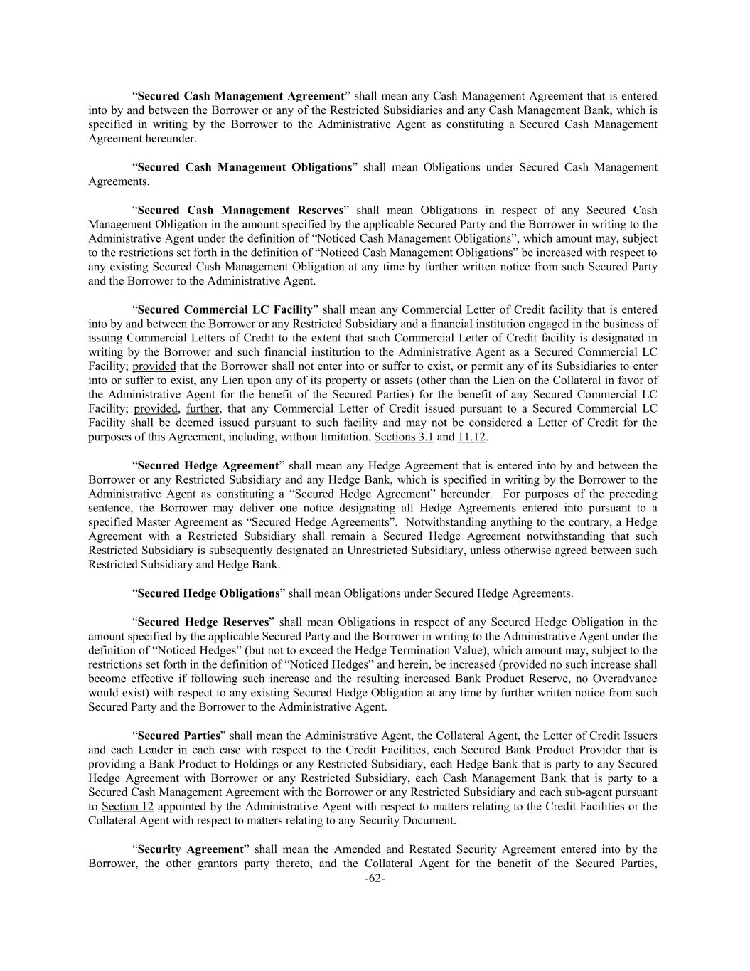 “Secured Cash Management Agreement” shall mean any Cash Management Agreement that is entered into by and between the Borrower or any of the Restricted Subsidiaries and any Cash Management Bank, which is specified in writing by the Borrower to the Administrative Agent as constituting a Secured Cash Management Agreement hereunder. “Secured Cash Management Obligations” shall mean Obligations under Secured Cash Management Agreements. “Secured Cash Management Reserves” shall mean Obligations in respect of any Secured Cash Management Obligation in the amount specified by the applicable Secured Party and the Borrower in writing to the Administrative Agent under the definition of “Noticed Cash Management Obligations”, which amount may, subject to the restrictions set forth in the definition of “Noticed Cash Management Obligations” be increased with respect to any existing Secured Cash Management Obligation at any time by further written notice from such Secured Party and the Borrower to the Administrative Agent. “Secured Commercial LC Facility” shall mean any Commercial Letter of Credit facility that is entered into by and between the Borrower or any Restricted Subsidiary and a financial institution engaged in the business of issuing Commercial Letters of Credit to the extent that such Commercial Letter of Credit facility is designated in writing by the Borrower and such financial institution to the Administrative Agent as a Secured Commercial LC Facility; provided that the Borrower shall not enter into or suffer to exist, or permit any of its Subsidiaries to enter into or suffer to exist, any Lien upon any of its property or assets (other than the Lien on the Collateral in favor of the Administrative Agent for the benefit of the Secured Parties) for the benefit of any Secured Commercial LC Facility; provided, further, that any Commercial Letter of Credit issued pursuant to a Secured Commercial LC Facility shall be deemed issued pursuant to such facility and may not be considered a Letter of Credit for the purposes of this Agreement, including, without limitation, Sections 3.1 and 11.12. “Secured Hedge Agreement” shall mean any Hedge Agreement that is entered into by and between the Borrower or any Restricted Subsidiary and any Hedge Bank, which is specified in writing by the Borrower to the Administrative Agent as constituting a “Secured Hedge Agreement” hereunder. For purposes of the preceding sentence, the Borrower may deliver one notice designating all Hedge Agreements entered into pursuant to a specified Master Agreement as “Secured Hedge Agreements”. Notwithstanding anything to the contrary, a Hedge Agreement with a Restricted Subsidiary shall remain a Secured Hedge Agreement notwithstanding that such Restricted Subsidiary is subsequently designated an Unrestricted Subsidiary, unless otherwise agreed between such Restricted Subsidiary and Hedge Bank. “Secured Hedge Obligations” shall mean Obligations under Secured Hedge Agreements. “Secured Hedge Reserves” shall mean Obligations in respect of any Secured Hedge Obligation in the amount specified by the applicable Secured Party and the Borrower in writing to the Administrative Agent under the definition of “Noticed Hedges” (but not to exceed the Hedge Termination Value), which amount may, subject to the restrictions set forth in the definition of “Noticed Hedges” and herein, be increased (provided no such increase shall become effective if following such increase and the resulting increased Bank Product Reserve, no Overadvance would exist) with respect to any existing Secured Hedge Obligation at any time by further written notice from such Secured Party and the Borrower to the Administrative Agent. “Secured Parties” shall mean the Administrative Agent, the Collateral Agent, the Letter of Credit Issuers and each Lender in each case with respect to the Credit Facilities, each Secured Bank Product Provider that is providing a Bank Product to Holdings or any Restricted Subsidiary, each Hedge Bank that is party to any Secured Hedge Agreement with Borrower or any Restricted Subsidiary, each Cash Management Bank that is party to a Secured Cash Management Agreement with the Borrower or any Restricted Subsidiary and each sub-agent pursuant to Section 12 appointed by the Administrative Agent with respect to matters relating to the Credit Facilities or the Collateral Agent with respect to matters relating to any Security Document. “Security Agreement” shall mean the Amended and Restated Security Agreement entered into by the Borrower, the other grantors party thereto, and the Collateral Agent for the benefit of the Secured Parties, -62-