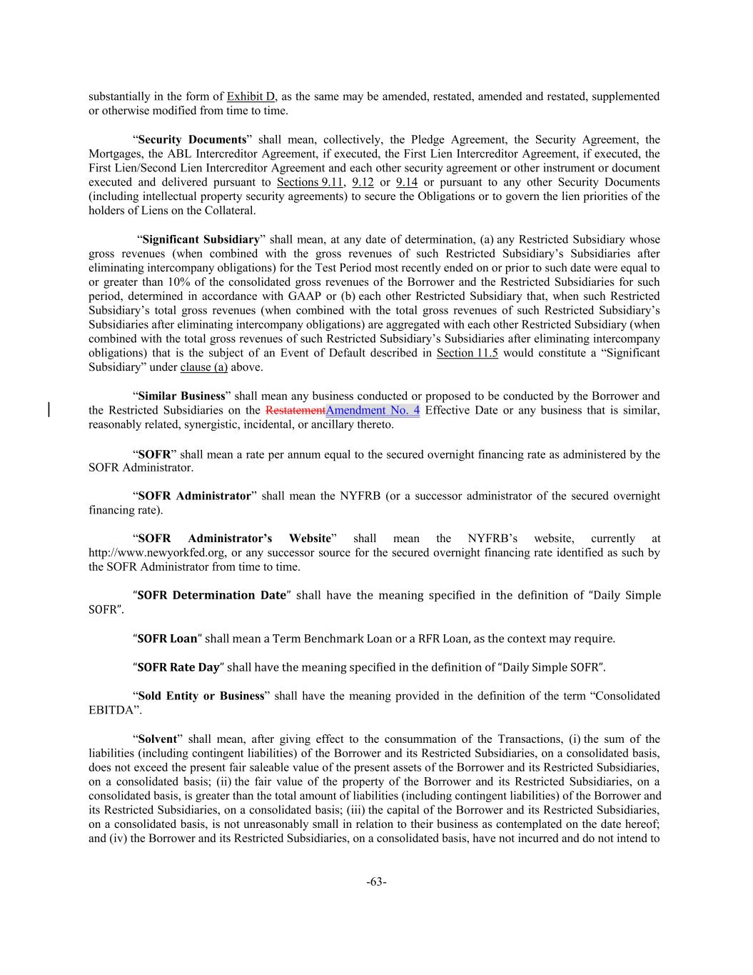 substantially in the form of Exhibit D, as the same may be amended, restated, amended and restated, supplemented or otherwise modified from time to time. “Security Documents” shall mean, collectively, the Pledge Agreement, the Security Agreement, the Mortgages, the ABL Intercreditor Agreement, if executed, the First Lien Intercreditor Agreement, if executed, the First Lien/Second Lien Intercreditor Agreement and each other security agreement or other instrument or document executed and delivered pursuant to Sections 9.11, 9.12 or 9.14 or pursuant to any other Security Documents (including intellectual property security agreements) to secure the Obligations or to govern the lien priorities of the holders of Liens on the Collateral. “Significant Subsidiary” shall mean, at any date of determination, (a) any Restricted Subsidiary whose gross revenues (when combined with the gross revenues of such Restricted Subsidiary’s Subsidiaries after eliminating intercompany obligations) for the Test Period most recently ended on or prior to such date were equal to or greater than 10% of the consolidated gross revenues of the Borrower and the Restricted Subsidiaries for such period, determined in accordance with GAAP or (b) each other Restricted Subsidiary that, when such Restricted Subsidiary’s total gross revenues (when combined with the total gross revenues of such Restricted Subsidiary’s Subsidiaries after eliminating intercompany obligations) are aggregated with each other Restricted Subsidiary (when combined with the total gross revenues of such Restricted Subsidiary’s Subsidiaries after eliminating intercompany obligations) that is the subject of an Event of Default described in Section 11.5 would constitute a “Significant Subsidiary” under clause (a) above. “Similar Business” shall mean any business conducted or proposed to be conducted by the Borrower and the Restricted Subsidiaries on the RestatementAmendment No. 4 Effective Date or any business that is similar, reasonably related, synergistic, incidental, or ancillary thereto. “SOFR” shall mean a rate per annum equal to the secured overnight financing rate as administered by the SOFR Administrator. “SOFR Administrator” shall mean the NYFRB (or a successor administrator of the secured overnight financing rate). “SOFR Administrator’s Website” shall mean the NYFRB’s website, currently at http://www.newyorkfed.org, or any successor source for the secured overnight financing rate identified as such by the SOFR Administrator from time to time. “SOFR Determination Date” shall have the meaning specified in the definition of “Daily Simple SOFR”. “SOFR Loan” shall mean a Term Benchmark Loan or a RFR Loan, as the context may require. “SOFR Rate Day” shall have the meaning specified in the definition of “Daily Simple SOFR”. “Sold Entity or Business” shall have the meaning provided in the definition of the term “Consolidated EBITDA”. “Solvent” shall mean, after giving effect to the consummation of the Transactions, (i) the sum of the liabilities (including contingent liabilities) of the Borrower and its Restricted Subsidiaries, on a consolidated basis, does not exceed the present fair saleable value of the present assets of the Borrower and its Restricted Subsidiaries, on a consolidated basis; (ii) the fair value of the property of the Borrower and its Restricted Subsidiaries, on a consolidated basis, is greater than the total amount of liabilities (including contingent liabilities) of the Borrower and its Restricted Subsidiaries, on a consolidated basis; (iii) the capital of the Borrower and its Restricted Subsidiaries, on a consolidated basis, is not unreasonably small in relation to their business as contemplated on the date hereof; and (iv) the Borrower and its Restricted Subsidiaries, on a consolidated basis, have not incurred and do not intend to -63-