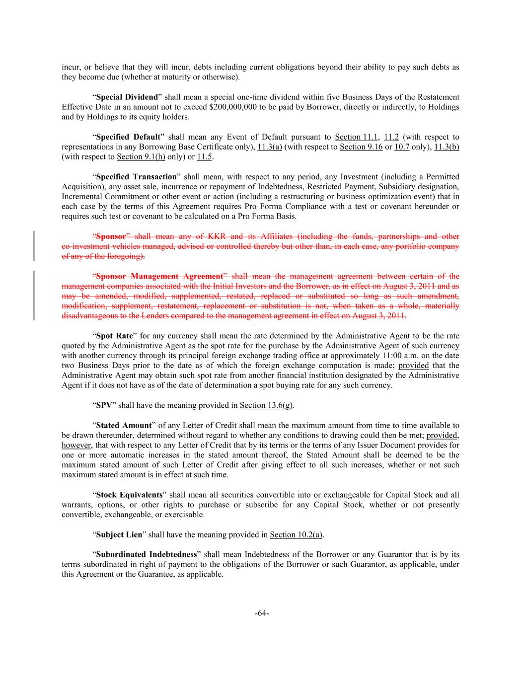incur, or believe that they will incur, debts including current obligations beyond their ability to pay such debts as they become due (whether at maturity or otherwise). “Special Dividend” shall mean a special one-time dividend within five Business Days of the Restatement Effective Date in an amount not to exceed $200,000,000 to be paid by Borrower, directly or indirectly, to Holdings and by Holdings to its equity holders. “Specified Default” shall mean any Event of Default pursuant to Section 11.1, 11.2 (with respect to representations in any Borrowing Base Certificate only), 11.3(a) (with respect to Section 9.16 or 10.7 only), 11.3(b) (with respect to Section 9.1(h) only) or 11.5. “Specified Transaction” shall mean, with respect to any period, any Investment (including a Permitted Acquisition), any asset sale, incurrence or repayment of Indebtedness, Restricted Payment, Subsidiary designation, Incremental Commitment or other event or action (including a restructuring or business optimization event) that in each case by the terms of this Agreement requires Pro Forma Compliance with a test or covenant hereunder or requires such test or covenant to be calculated on a Pro Forma Basis. “Sponsor” shall mean any of KKR and its Affiliates (including the funds, partnerships and other co-investment vehicles managed, advised or controlled thereby but other than, in each case, any portfolio company of any of the foregoing). “Sponsor Management Agreement” shall mean the management agreement between certain of the management companies associated with the Initial Investors and the Borrower, as in effect on August 3, 2011 and as may be amended, modified, supplemented, restated, replaced or substituted so long as such amendment, modification, supplement, restatement, replacement or substitution is not, when taken as a whole, materially disadvantageous to the Lenders compared to the management agreement in effect on August 3, 2011. “Spot Rate” for any currency shall mean the rate determined by the Administrative Agent to be the rate quoted by the Administrative Agent as the spot rate for the purchase by the Administrative Agent of such currency with another currency through its principal foreign exchange trading office at approximately 11:00 a.m. on the date two Business Days prior to the date as of which the foreign exchange computation is made; provided that the Administrative Agent may obtain such spot rate from another financial institution designated by the Administrative Agent if it does not have as of the date of determination a spot buying rate for any such currency. “SPV” shall have the meaning provided in Section 13.6(g). “Stated Amount” of any Letter of Credit shall mean the maximum amount from time to time available to be drawn thereunder, determined without regard to whether any conditions to drawing could then be met; provided, however, that with respect to any Letter of Credit that by its terms or the terms of any Issuer Document provides for one or more automatic increases in the stated amount thereof, the Stated Amount shall be deemed to be the maximum stated amount of such Letter of Credit after giving effect to all such increases, whether or not such maximum stated amount is in effect at such time. “Stock Equivalents” shall mean all securities convertible into or exchangeable for Capital Stock and all warrants, options, or other rights to purchase or subscribe for any Capital Stock, whether or not presently convertible, exchangeable, or exercisable. “Subject Lien” shall have the meaning provided in Section 10.2(a). “Subordinated Indebtedness” shall mean Indebtedness of the Borrower or any Guarantor that is by its terms subordinated in right of payment to the obligations of the Borrower or such Guarantor, as applicable, under this Agreement or the Guarantee, as applicable. -64-