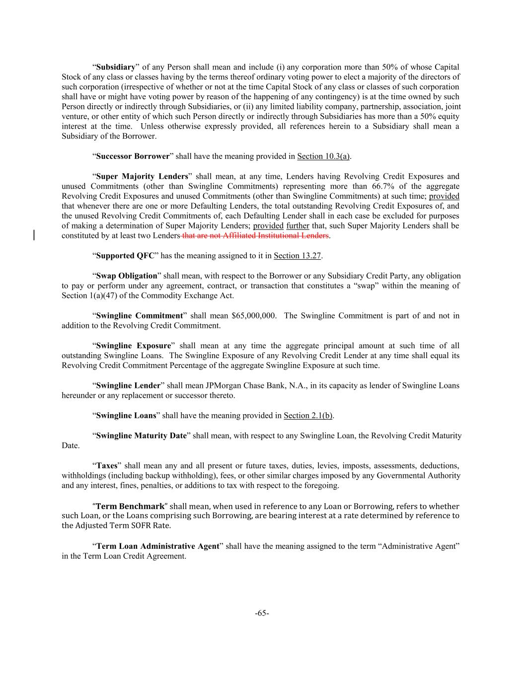 “Subsidiary” of any Person shall mean and include (i) any corporation more than 50% of whose Capital Stock of any class or classes having by the terms thereof ordinary voting power to elect a majority of the directors of such corporation (irrespective of whether or not at the time Capital Stock of any class or classes of such corporation shall have or might have voting power by reason of the happening of any contingency) is at the time owned by such Person directly or indirectly through Subsidiaries, or (ii) any limited liability company, partnership, association, joint venture, or other entity of which such Person directly or indirectly through Subsidiaries has more than a 50% equity interest at the time. Unless otherwise expressly provided, all references herein to a Subsidiary shall mean a Subsidiary of the Borrower. “Successor Borrower” shall have the meaning provided in Section 10.3(a). “Super Majority Lenders” shall mean, at any time, Lenders having Revolving Credit Exposures and unused Commitments (other than Swingline Commitments) representing more than 66.7% of the aggregate Revolving Credit Exposures and unused Commitments (other than Swingline Commitments) at such time; provided that whenever there are one or more Defaulting Lenders, the total outstanding Revolving Credit Exposures of, and the unused Revolving Credit Commitments of, each Defaulting Lender shall in each case be excluded for purposes of making a determination of Super Majority Lenders; provided further that, such Super Majority Lenders shall be constituted by at least two Lenders that are not Affiliated Institutional Lenders. “Supported QFC” has the meaning assigned to it in Section 13.27. “Swap Obligation” shall mean, with respect to the Borrower or any Subsidiary Credit Party, any obligation to pay or perform under any agreement, contract, or transaction that constitutes a “swap” within the meaning of Section 1(a)(47) of the Commodity Exchange Act. “Swingline Commitment” shall mean $65,000,000. The Swingline Commitment is part of and not in addition to the Revolving Credit Commitment. “Swingline Exposure” shall mean at any time the aggregate principal amount at such time of all outstanding Swingline Loans. The Swingline Exposure of any Revolving Credit Lender at any time shall equal its Revolving Credit Commitment Percentage of the aggregate Swingline Exposure at such time. “Swingline Lender” shall mean JPMorgan Chase Bank, N.A., in its capacity as lender of Swingline Loans hereunder or any replacement or successor thereto. “Swingline Loans” shall have the meaning provided in Section 2.1(b). “Swingline Maturity Date” shall mean, with respect to any Swingline Loan, the Revolving Credit Maturity Date. “Taxes” shall mean any and all present or future taxes, duties, levies, imposts, assessments, deductions, withholdings (including backup withholding), fees, or other similar charges imposed by any Governmental Authority and any interest, fines, penalties, or additions to tax with respect to the foregoing. “Term Benchmark” shall mean, when used in reference to any Loan or Borrowing, refers to whether such Loan, or the Loans comprising such Borrowing, are bearing interest at a rate determined by reference to the Adjusted Term SOFR Rate. “Term Loan Administrative Agent” shall have the meaning assigned to the term “Administrative Agent” in the Term Loan Credit Agreement. -65-