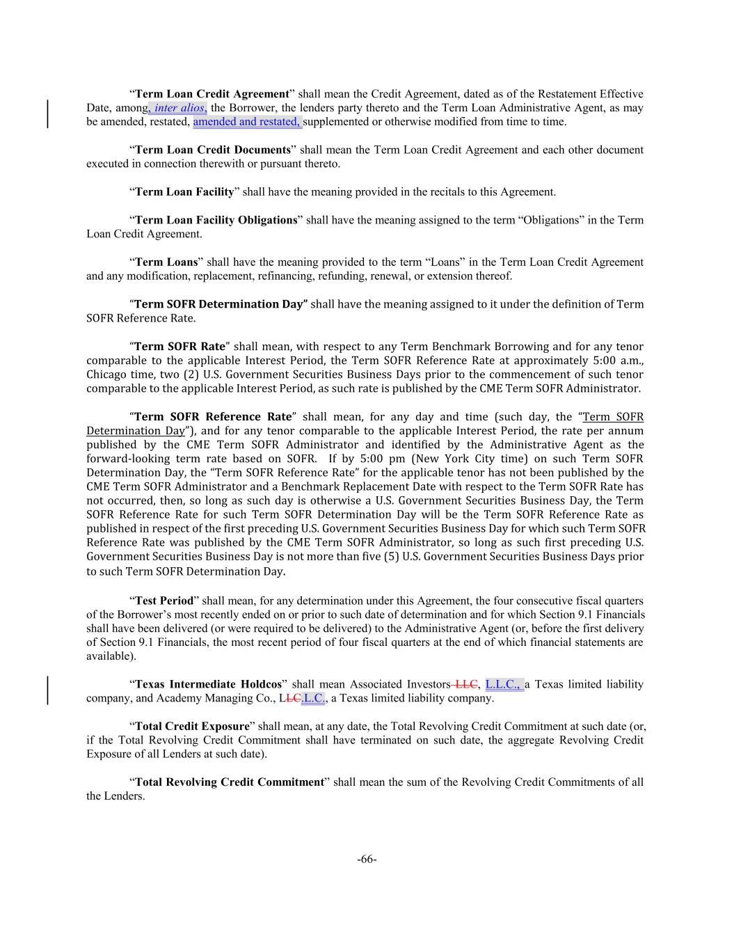 “Term Loan Credit Agreement” shall mean the Credit Agreement, dated as of the Restatement Effective Date, among, inter alios, the Borrower, the lenders party thereto and the Term Loan Administrative Agent, as may be amended, restated, amended and restated, supplemented or otherwise modified from time to time. “Term Loan Credit Documents” shall mean the Term Loan Credit Agreement and each other document executed in connection therewith or pursuant thereto. “Term Loan Facility” shall have the meaning provided in the recitals to this Agreement. “Term Loan Facility Obligations” shall have the meaning assigned to the term “Obligations” in the Term Loan Credit Agreement. “Term Loans” shall have the meaning provided to the term “Loans” in the Term Loan Credit Agreement and any modification, replacement, refinancing, refunding, renewal, or extension thereof. “Term SOFR Determination Day” shall have the meaning assigned to it under the definition of Term SOFR Reference Rate. “Term SOFR Rate” shall mean, with respect to any Term Benchmark Borrowing and for any tenor comparable to the applicable Interest Period, the Term SOFR Reference Rate at approximately 5:00 a.m., Chicago time, two (2) U.S. Government Securities Business Days prior to the commencement of such tenor comparable to the applicable Interest Period, as such rate is published by the CME Term SOFR Administrator. “Term SOFR Reference Rate” shall mean, for any day and time (such day, the “Term SOFR Determination Day”), and for any tenor comparable to the applicable Interest Period, the rate per annum published by the CME Term SOFR Administrator and identified by the Administrative Agent as the forward-looking term rate based on SOFR. If by 5:00 pm (New York City time) on such Term SOFR Determination Day, the “Term SOFR Reference Rate” for the applicable tenor has not been published by the CME Term SOFR Administrator and a Benchmark Replacement Date with respect to the Term SOFR Rate has not occurred, then, so long as such day is otherwise a U.S. Government Securities Business Day, the Term SOFR Reference Rate for such Term SOFR Determination Day will be the Term SOFR Reference Rate as published in respect of the first preceding U.S. Government Securities Business Day for which such Term SOFR Reference Rate was published by the CME Term SOFR Administrator, so long as such first preceding U.S. Government Securities Business Day is not more than five (5) U.S. Government Securities Business Days prior to such Term SOFR Determination Day. “Test Period” shall mean, for any determination under this Agreement, the four consecutive fiscal quarters of the Borrower’s most recently ended on or prior to such date of determination and for which Section 9.1 Financials shall have been delivered (or were required to be delivered) to the Administrative Agent (or, before the first delivery of Section 9.1 Financials, the most recent period of four fiscal quarters at the end of which financial statements are available). “Texas Intermediate Holdcos” shall mean Associated Investors LLC, L.L.C., a Texas limited liability company, and Academy Managing Co., LLC.L.C., a Texas limited liability company. “Total Credit Exposure” shall mean, at any date, the Total Revolving Credit Commitment at such date (or, if the Total Revolving Credit Commitment shall have terminated on such date, the aggregate Revolving Credit Exposure of all Lenders at such date). “Total Revolving Credit Commitment” shall mean the sum of the Revolving Credit Commitments of all the Lenders. -66-