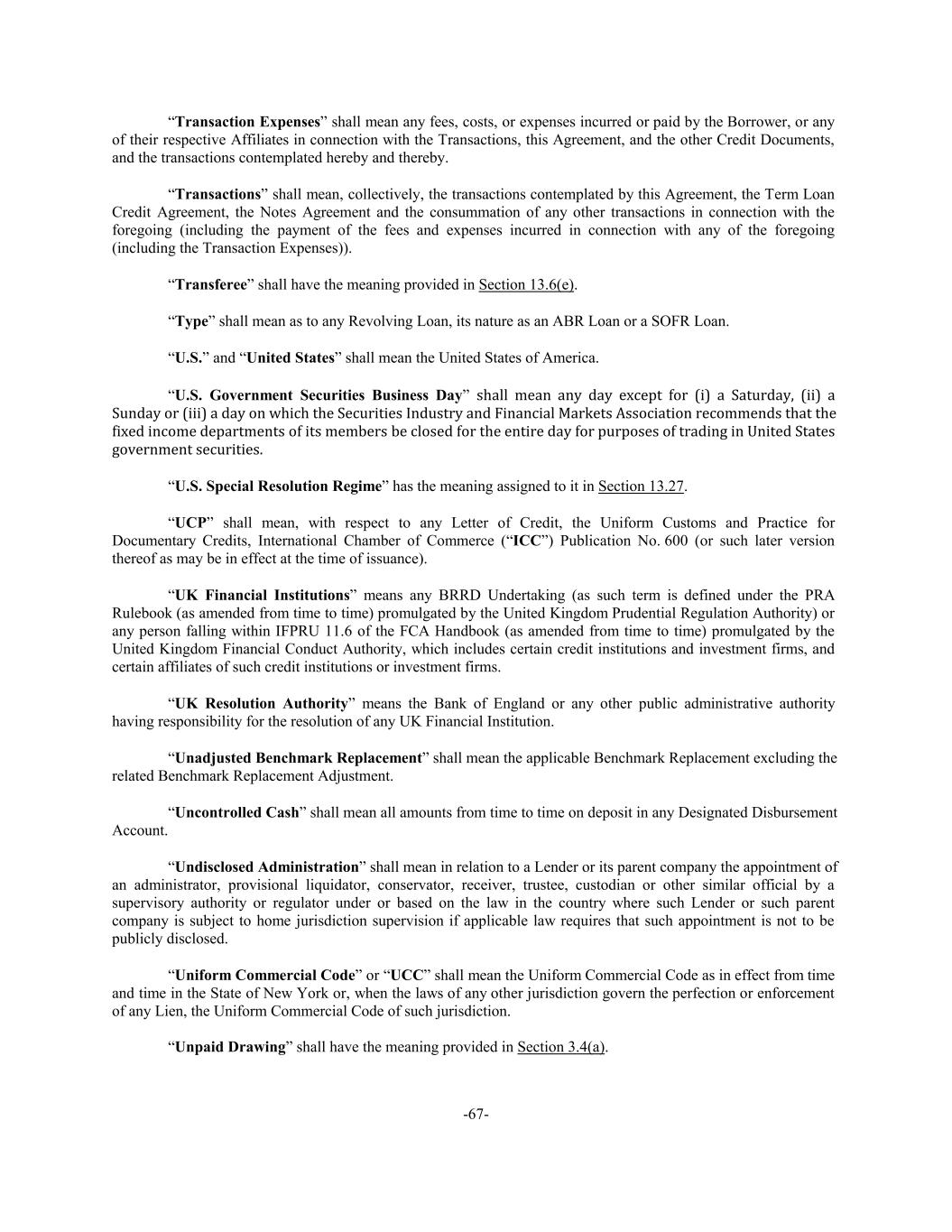 “Transaction Expenses” shall mean any fees, costs, or expenses incurred or paid by the Borrower, or any of their respective Affiliates in connection with the Transactions, this Agreement, and the other Credit Documents, and the transactions contemplated hereby and thereby. “Transactions” shall mean, collectively, the transactions contemplated by this Agreement, the Term Loan Credit Agreement, the Notes Agreement and the consummation of any other transactions in connection with the foregoing (including the payment of the fees and expenses incurred in connection with any of the foregoing (including the Transaction Expenses)). “Transferee” shall have the meaning provided in Section 13.6(e). “Type” shall mean as to any Revolving Loan, its nature as an ABR Loan or a SOFR Loan. “U.S.” and “United States” shall mean the United States of America. “U.S. Government Securities Business Day” shall mean any day except for (i) a Saturday, (ii) a Sunday or (iii) a day on which the Securities Industry and Financial Markets Association recommends that the fixed income departments of its members be closed for the entire day for purposes of trading in United States government securities. “U.S. Special Resolution Regime” has the meaning assigned to it in Section 13.27. “UCP” shall mean, with respect to any Letter of Credit, the Uniform Customs and Practice for Documentary Credits, International Chamber of Commerce (“ICC”) Publication No. 600 (or such later version thereof as may be in effect at the time of issuance). “UK Financial Institutions” means any BRRD Undertaking (as such term is defined under the PRA Rulebook (as amended from time to time) promulgated by the United Kingdom Prudential Regulation Authority) or any person falling within IFPRU 11.6 of the FCA Handbook (as amended from time to time) promulgated by the United Kingdom Financial Conduct Authority, which includes certain credit institutions and investment firms, and certain affiliates of such credit institutions or investment firms. “UK Resolution Authority” means the Bank of England or any other public administrative authority having responsibility for the resolution of any UK Financial Institution. “Unadjusted Benchmark Replacement” shall mean the applicable Benchmark Replacement excluding the related Benchmark Replacement Adjustment. “Uncontrolled Cash” shall mean all amounts from time to time on deposit in any Designated Disbursement Account. “Undisclosed Administration” shall mean in relation to a Lender or its parent company the appointment of an administrator, provisional liquidator, conservator, receiver, trustee, custodian or other similar official by a supervisory authority or regulator under or based on the law in the country where such Lender or such parent company is subject to home jurisdiction supervision if applicable law requires that such appointment is not to be publicly disclosed. “Uniform Commercial Code” or “UCC” shall mean the Uniform Commercial Code as in effect from time and time in the State of New York or, when the laws of any other jurisdiction govern the perfection or enforcement of any Lien, the Uniform Commercial Code of such jurisdiction. “Unpaid Drawing” shall have the meaning provided in Section 3.4(a). -67-